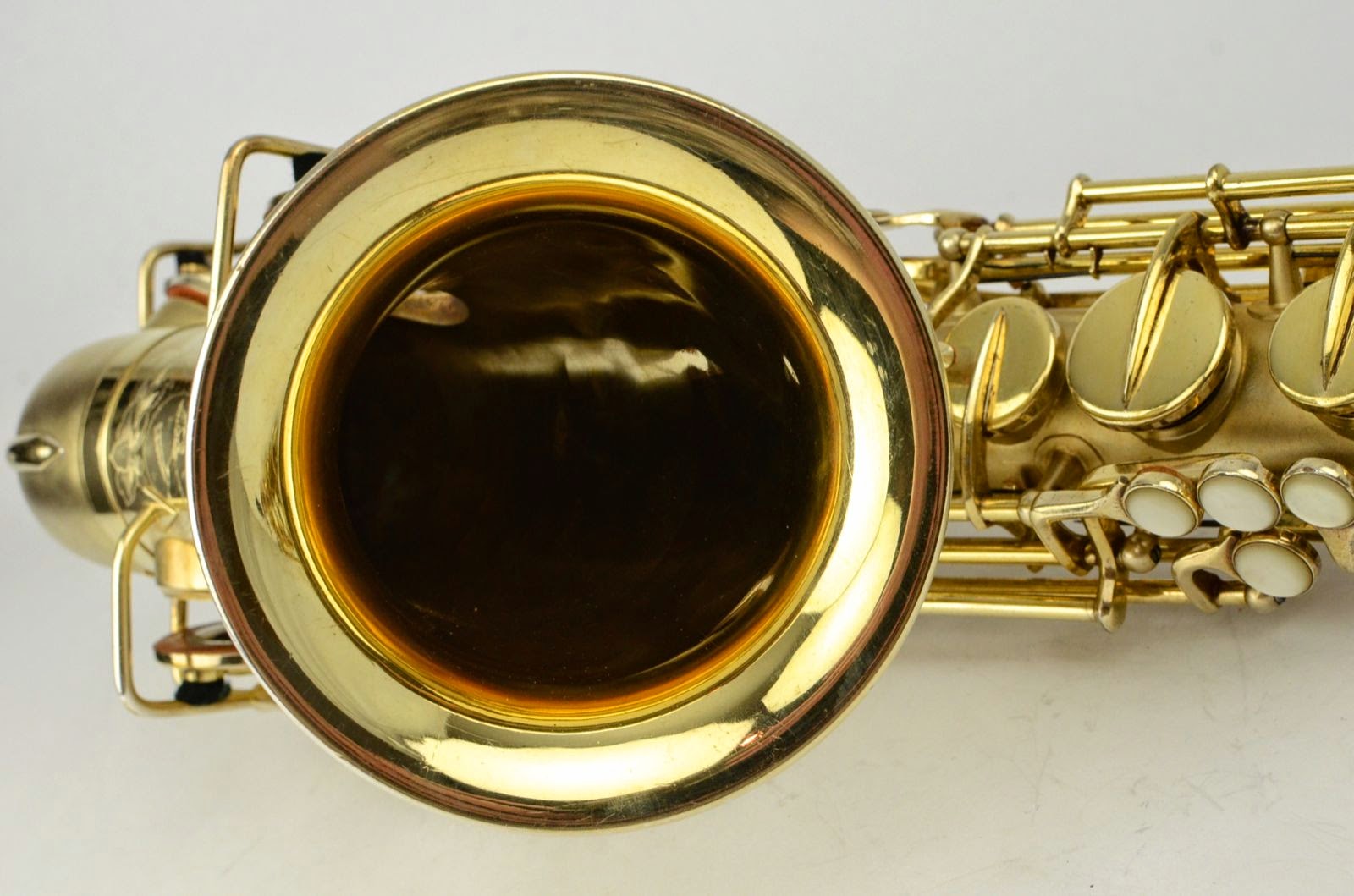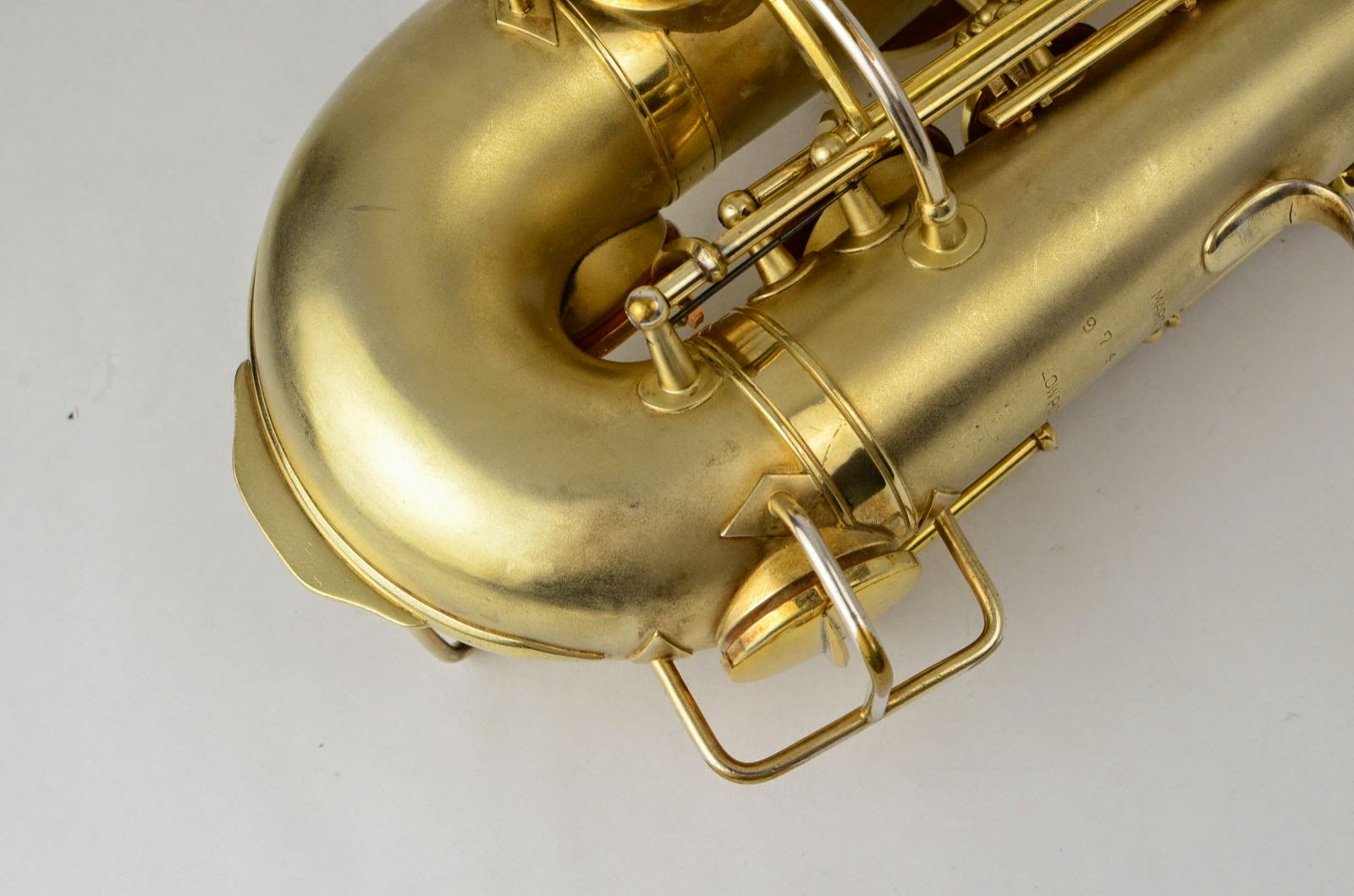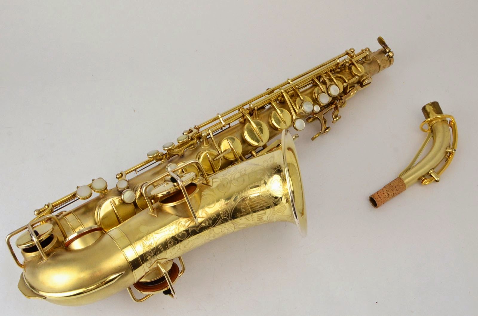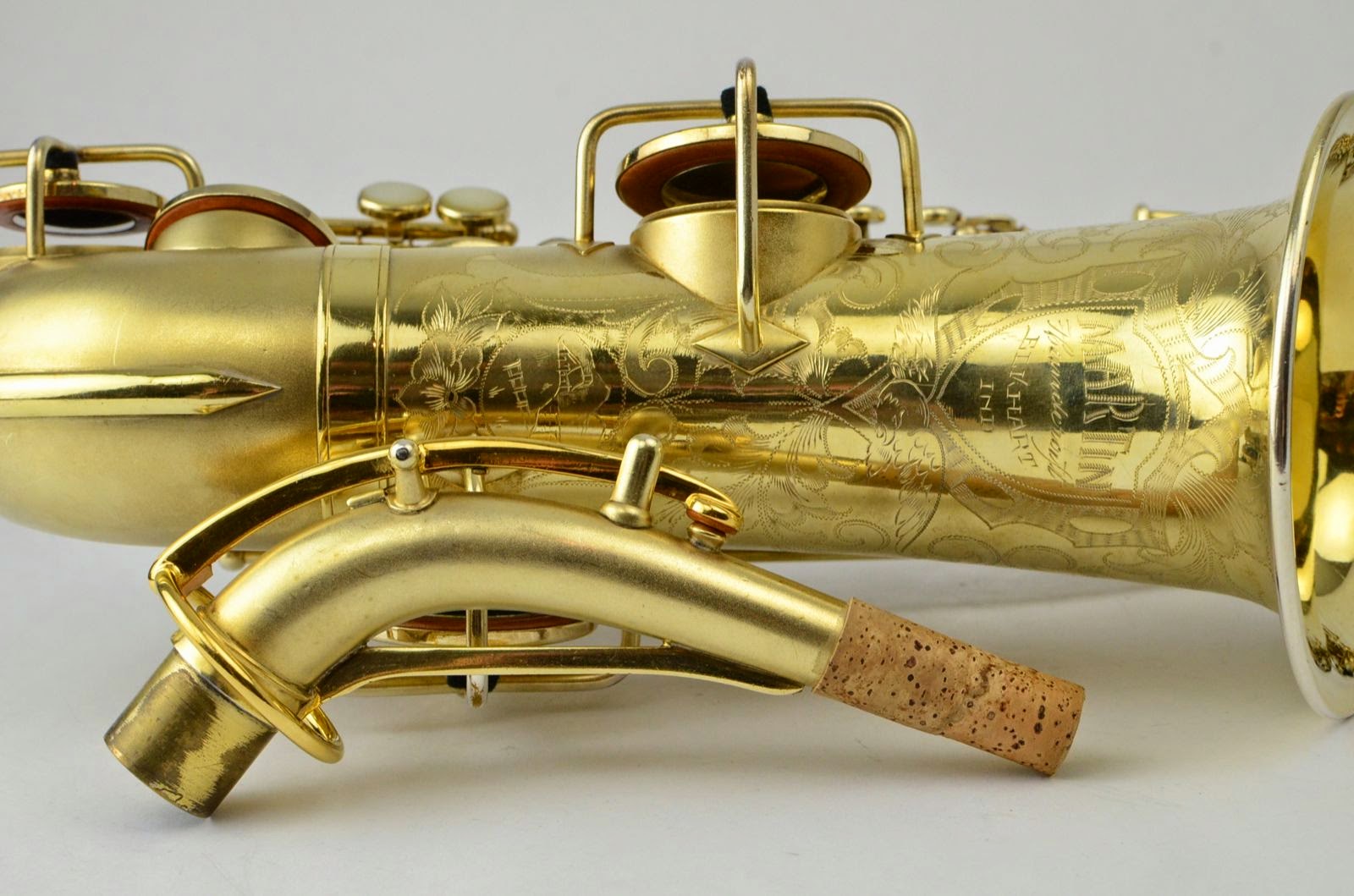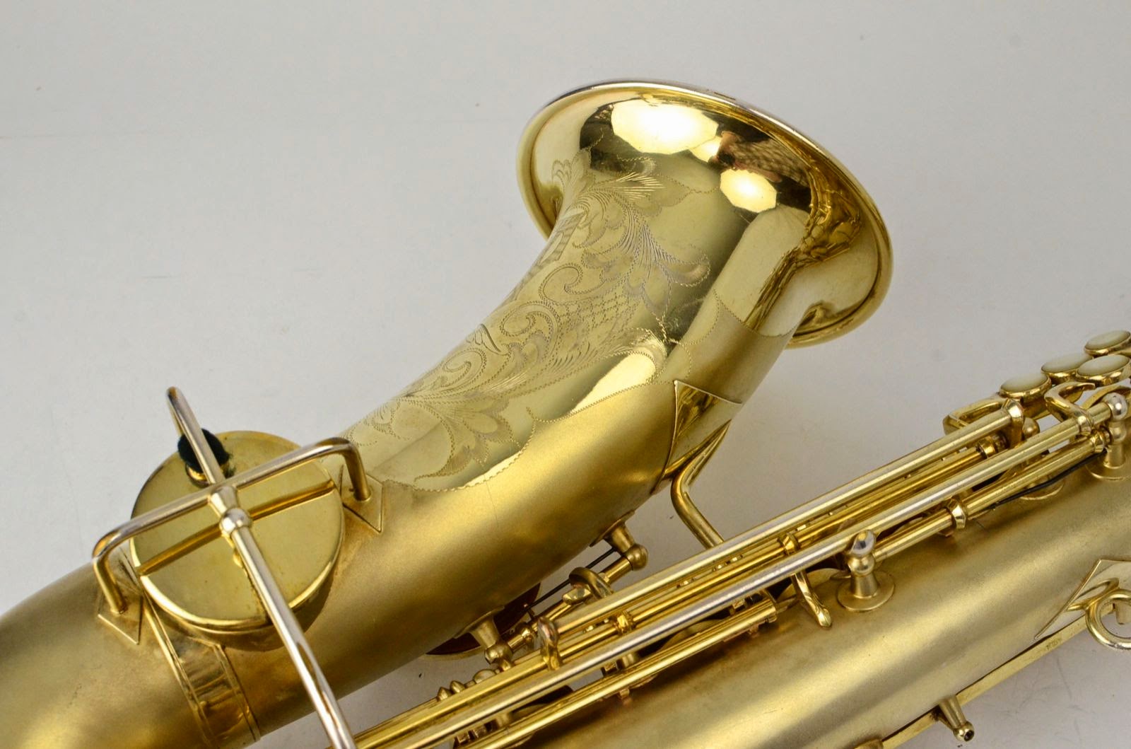 Besides being rare and fabulous, this horn also has a fresh high-end overhaul and it plays amazingly well, with a sweet, lush, thick, lyrical tone that is unique to Martin saxophones. This would be the perfect alto for any kind of lyrical alto playing - big band, ballads, section playing, or even wind band. The typewriter style keywork makes it slower to get around, so this is not a main alto for a pro player who practices 4 hours a day, because then the ergonomic quirks would become troublesome, but for most kinds of players, it's just a lot of fun.