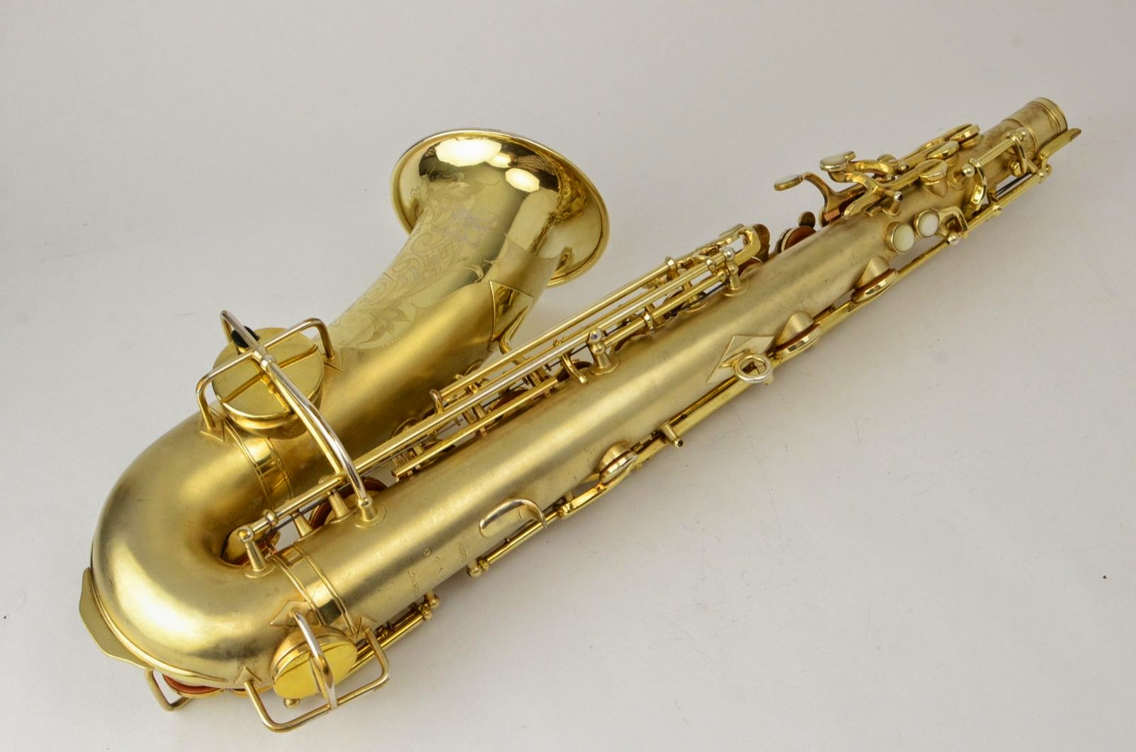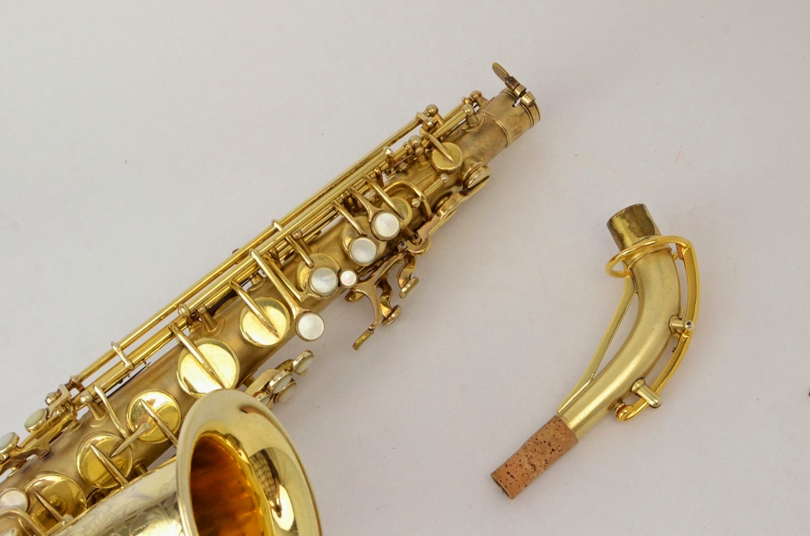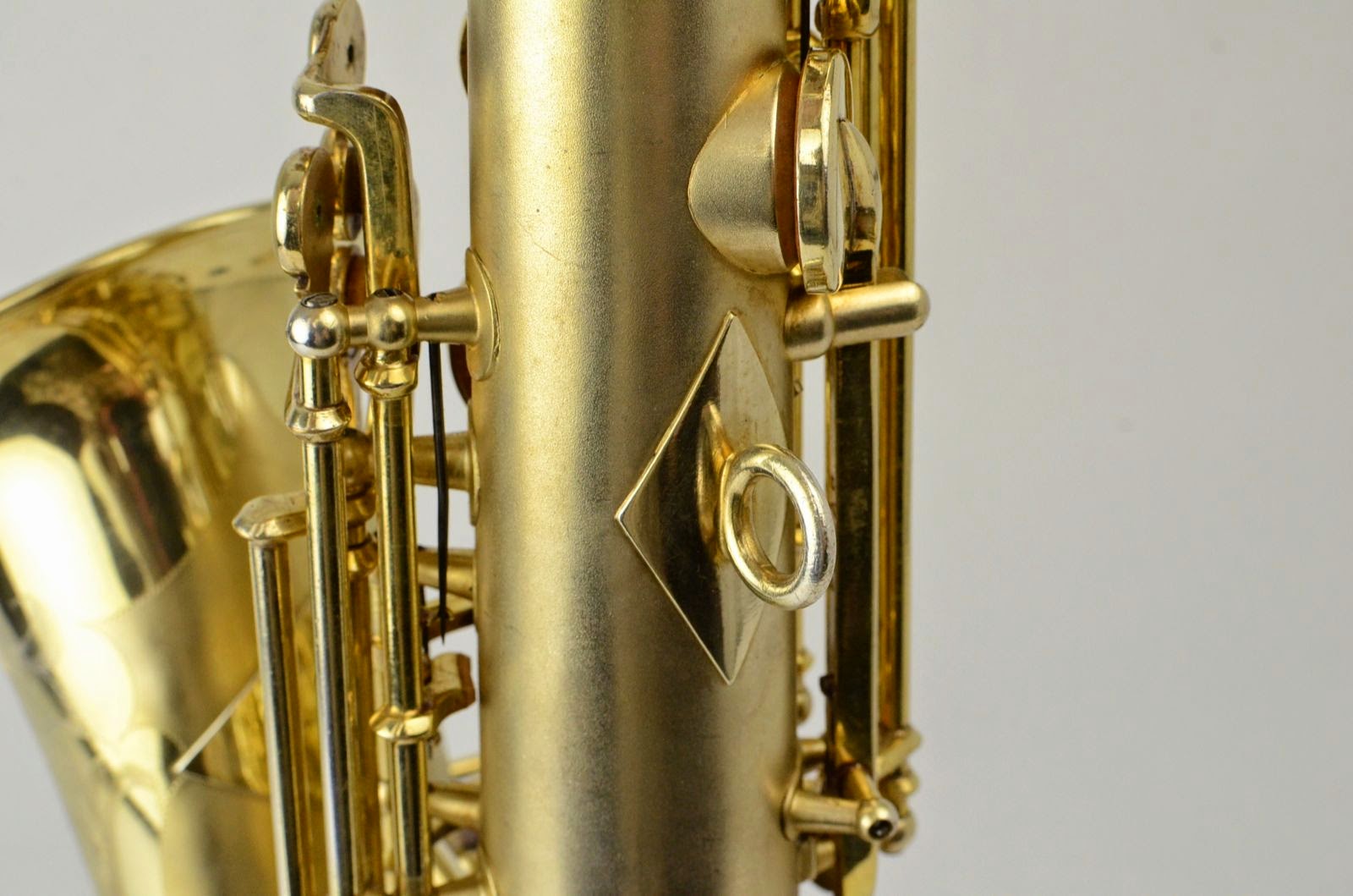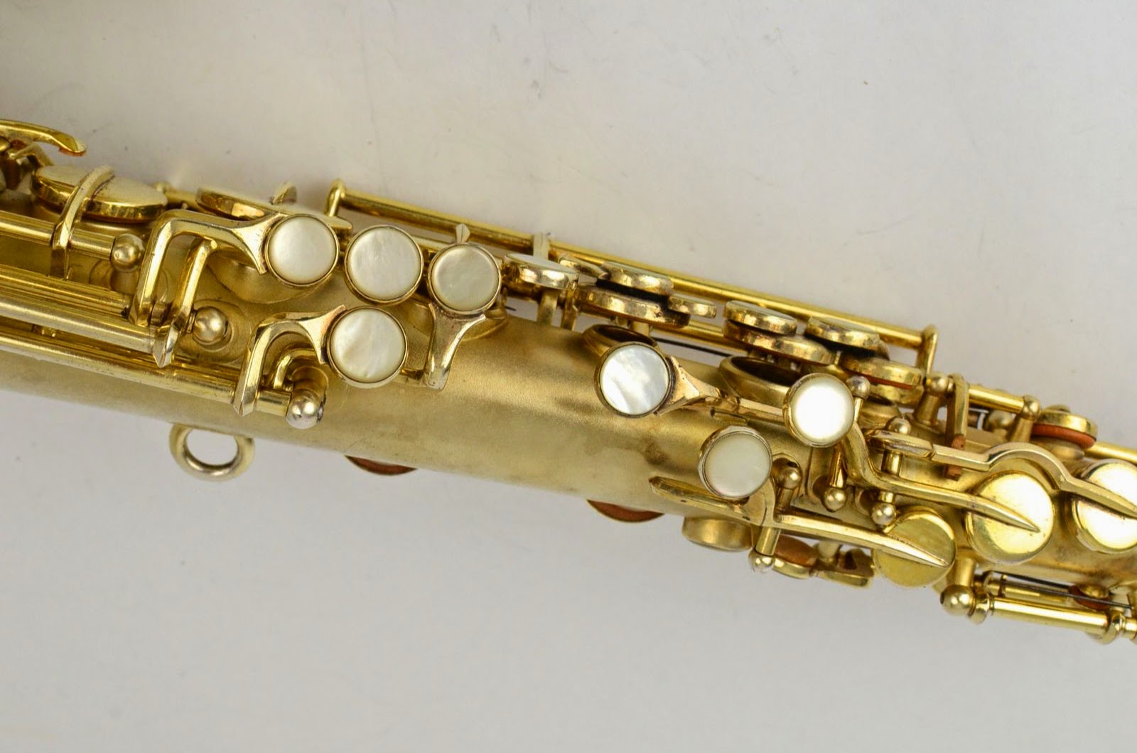 Besides being rare and fabulous, this horn also has a fresh high-end overhaul and it plays amazingly well, with a sweet, lush, thick, lyrical tone that is unique to Martin saxophones. This would be the perfect alto for any kind of lyrical alto playing - big band, ballads, section playing, or even wind band. The typewriter style keywork makes it slower to get around, so this is not a main alto for a pro player who practices 4 hours a day, because then the ergonomic quirks would become troublesome, but for most kinds of players, it's just a lot of fun.
