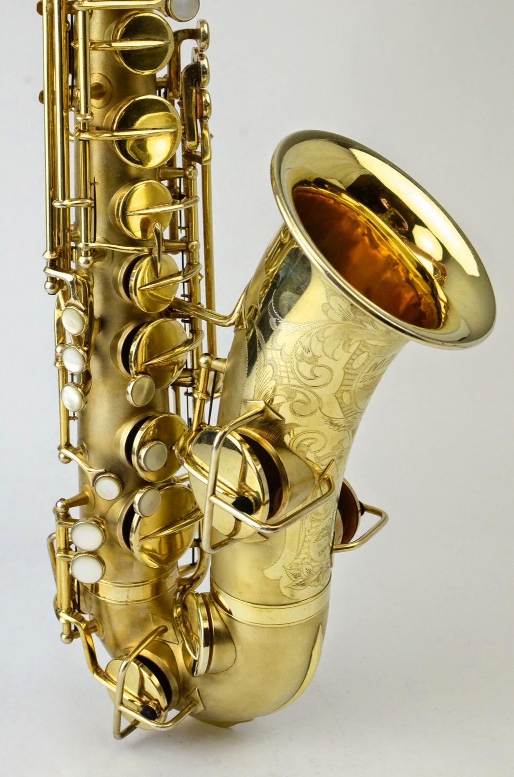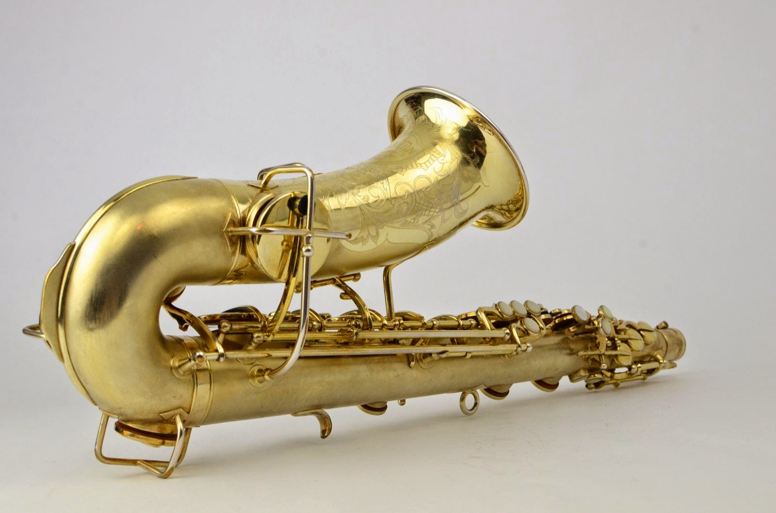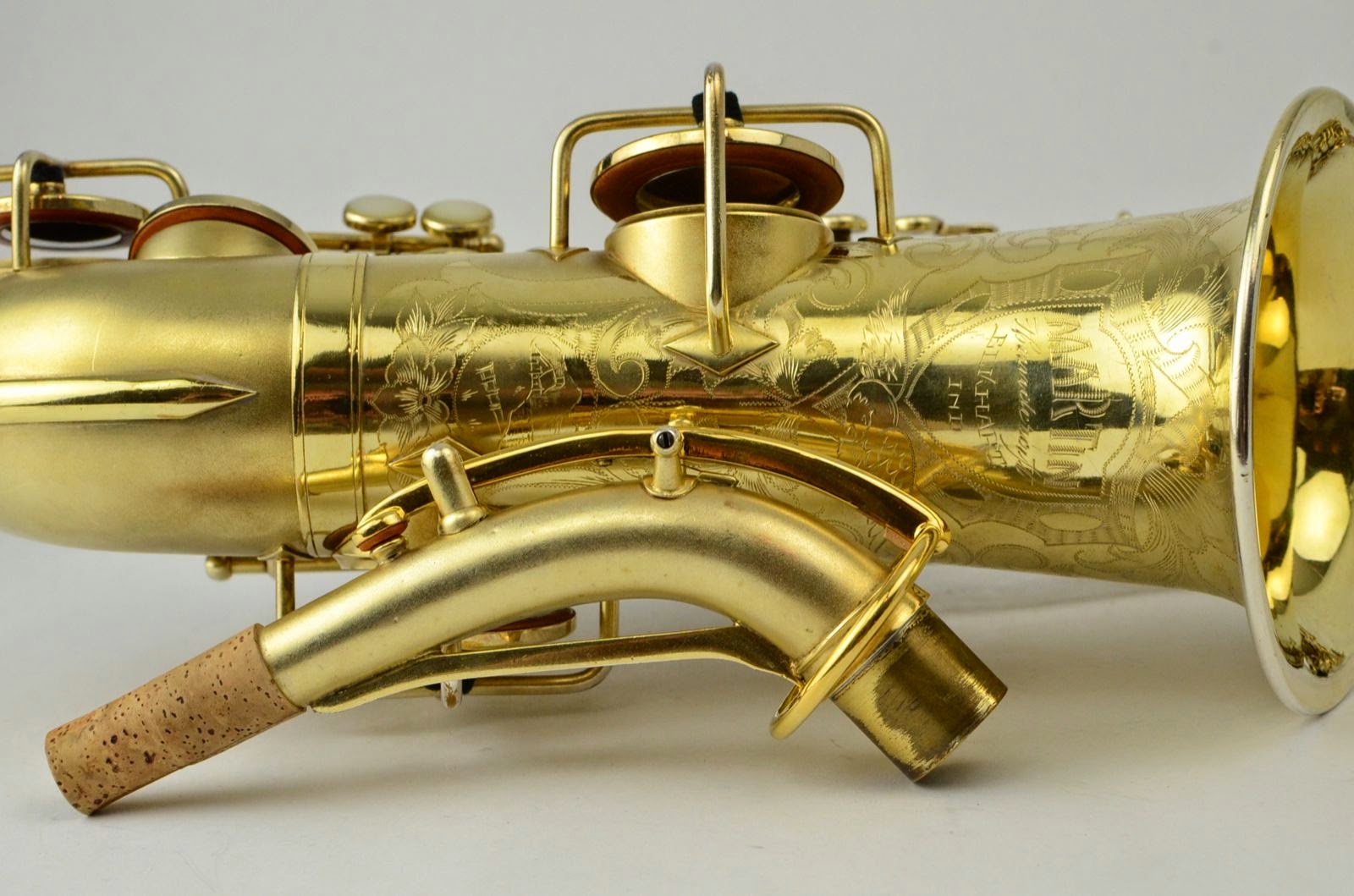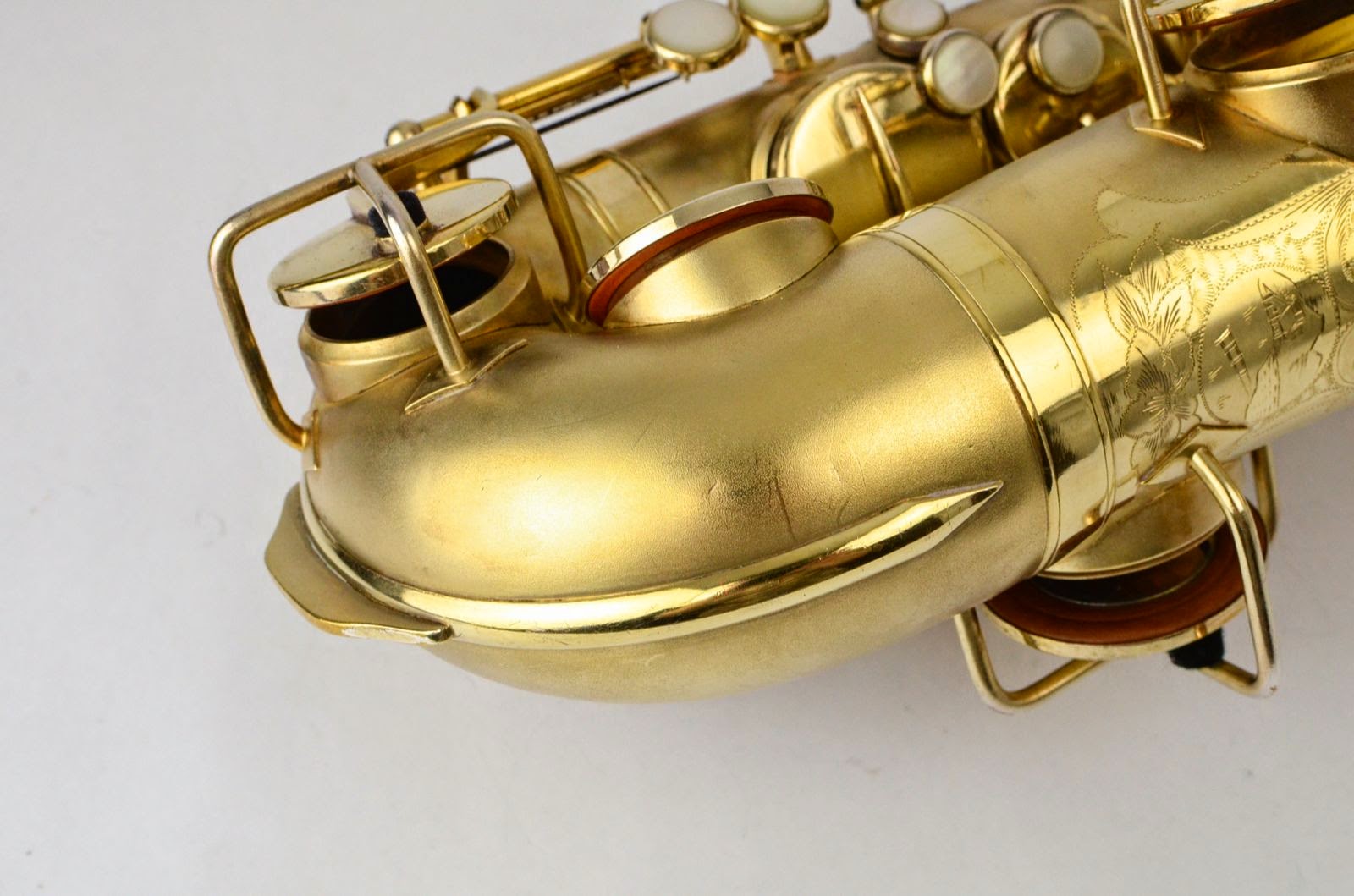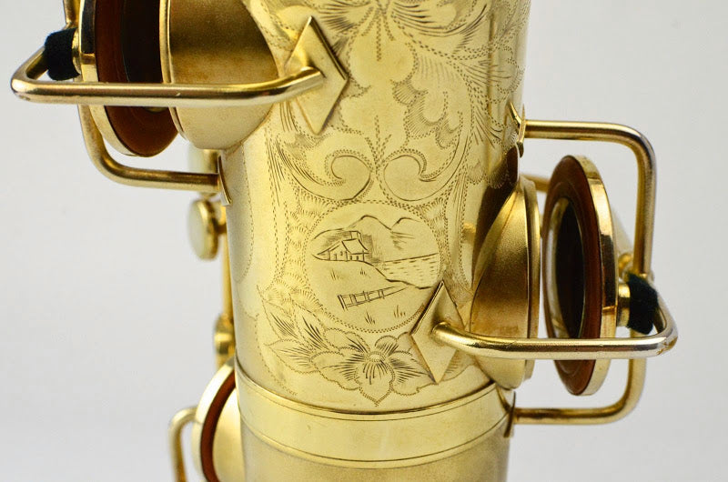 The Martin Typewriter is the quintessential aesthete's saxophone. It has a unified design concept that makes it a harmonious whole like no other horn. Every key touch is a circular pearl, and there are many other little design elements to that combine to make this a striking piece. This rare example is in near mint condition with virtually no wear at all and nearly 100% original gold plate intact. It has gorgeous and extensive special engraving on the bell including a little portrait of a cabin with mountains and a lake!