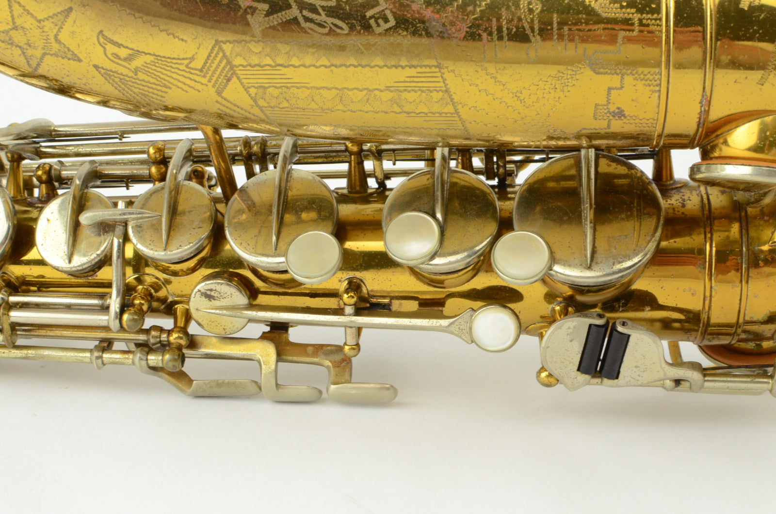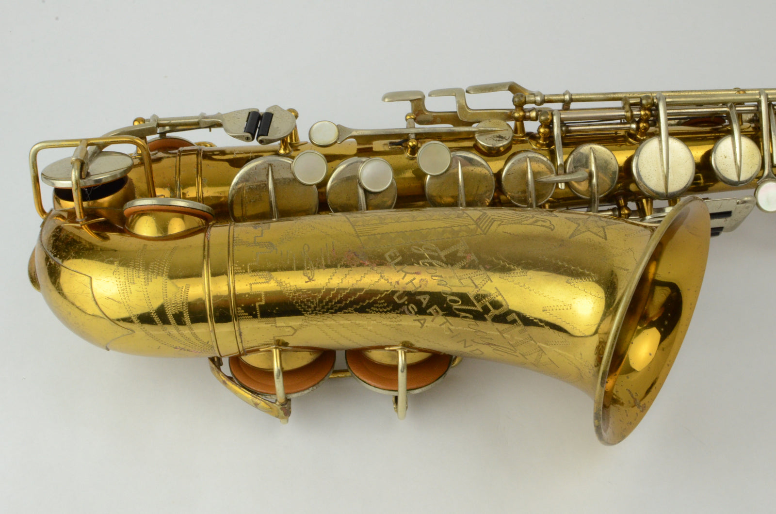 This professional, handmade (in the USA) alto has extensive skyline engraving on the bell featuring searchlights, an airplane (which was at that time something rather new!), and a city silhouette. These Martin altos are currently undervalued for the kind of quality they represent. They were handmade to very high standards, and they hold up over time like tanks. The brass is high-quality and thick, and the build is just top notch. It has an adjustable thumb hook, durable nickel keywork, brazed tone holes - the works. This is a horn you can play for a lifetime and it won't ever fall apart. In fact, Martins came with a 50 year warranty from the manufacturer. Can you think of anything that comes with a 50 year warranty today?