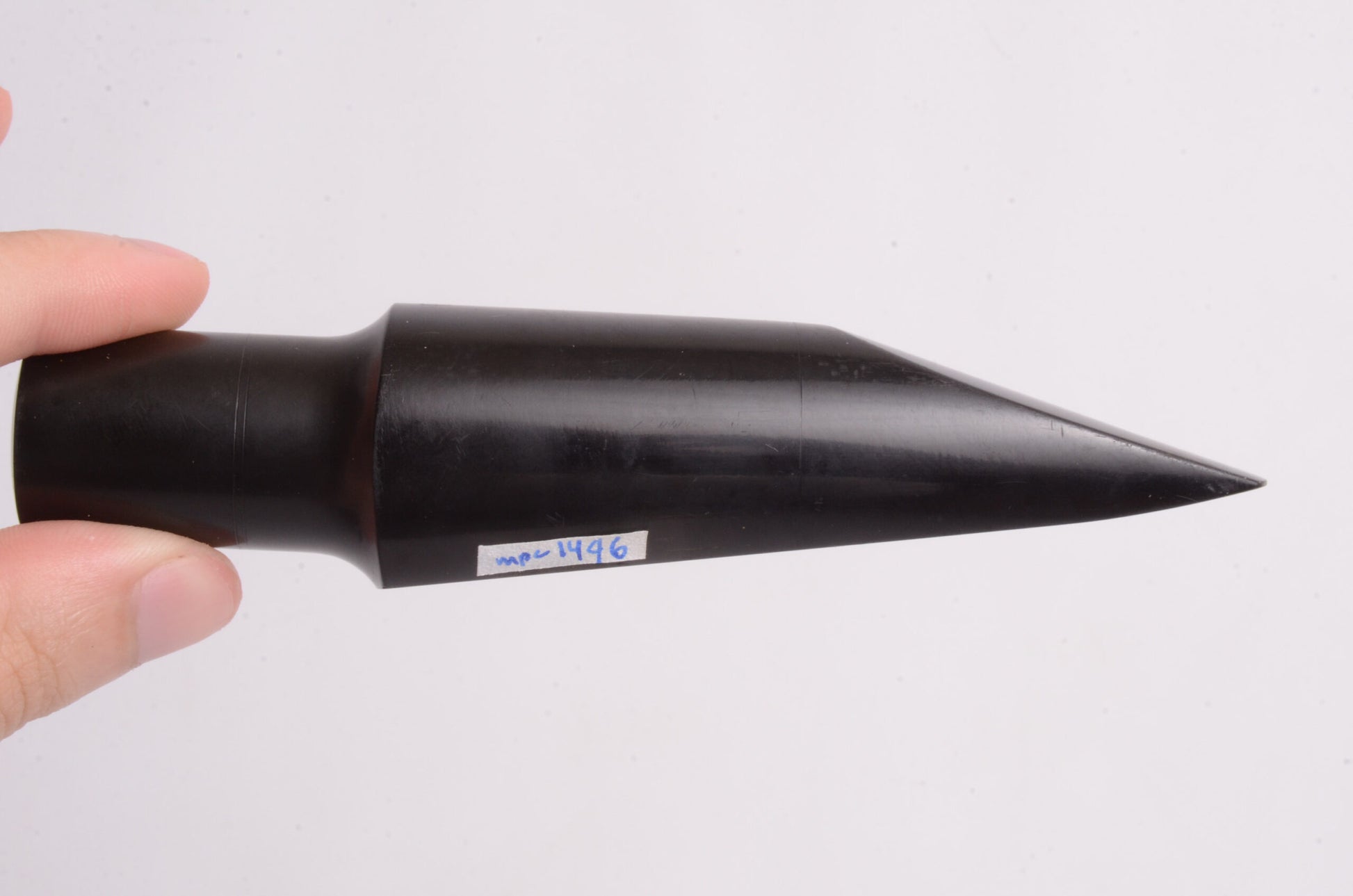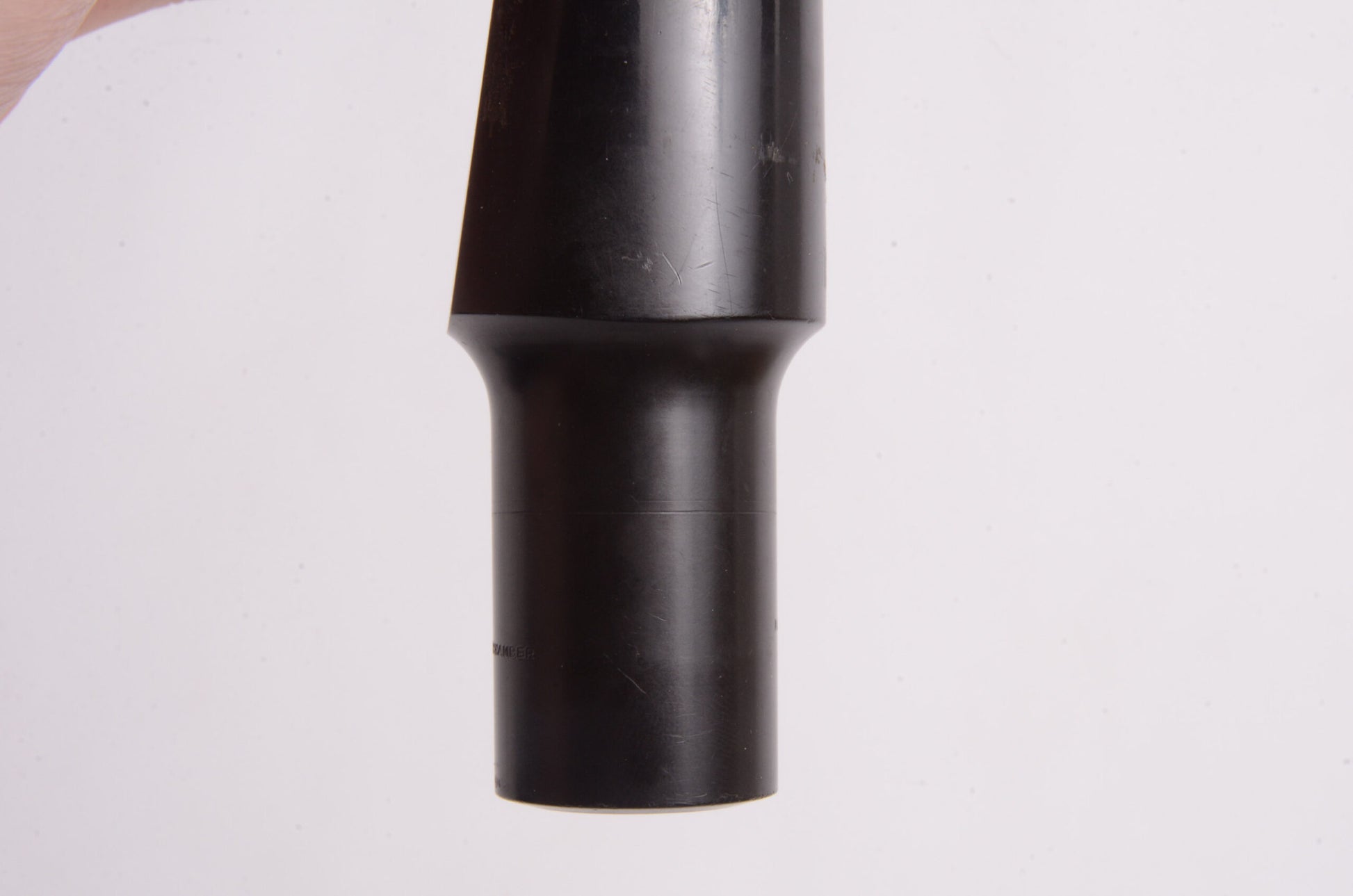 Older vintage maybe 1980's Meyer 5M Medium Chamber baritone saxophone mouthpiece in hard rubber. This is a nice example that plays with a medium tone between dark and bright, and has a good amount of projection. The tip is a very playable .100" which is comfortable for bari players who want to blend or play in concert band and don't have to play super loud funk bass lines. The long shank on the Meyer means this will tune well with anything from a vintage Conn through a Selmer or Yanagisawa, but it will NOT tune well on a Yamaha baritone, as those really want a shorter mouthpiece.