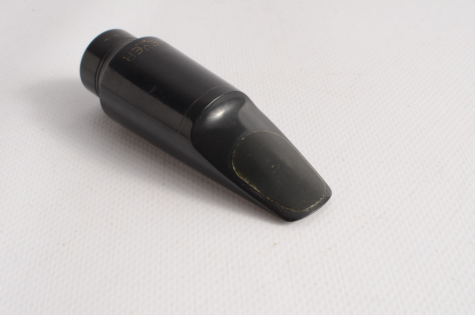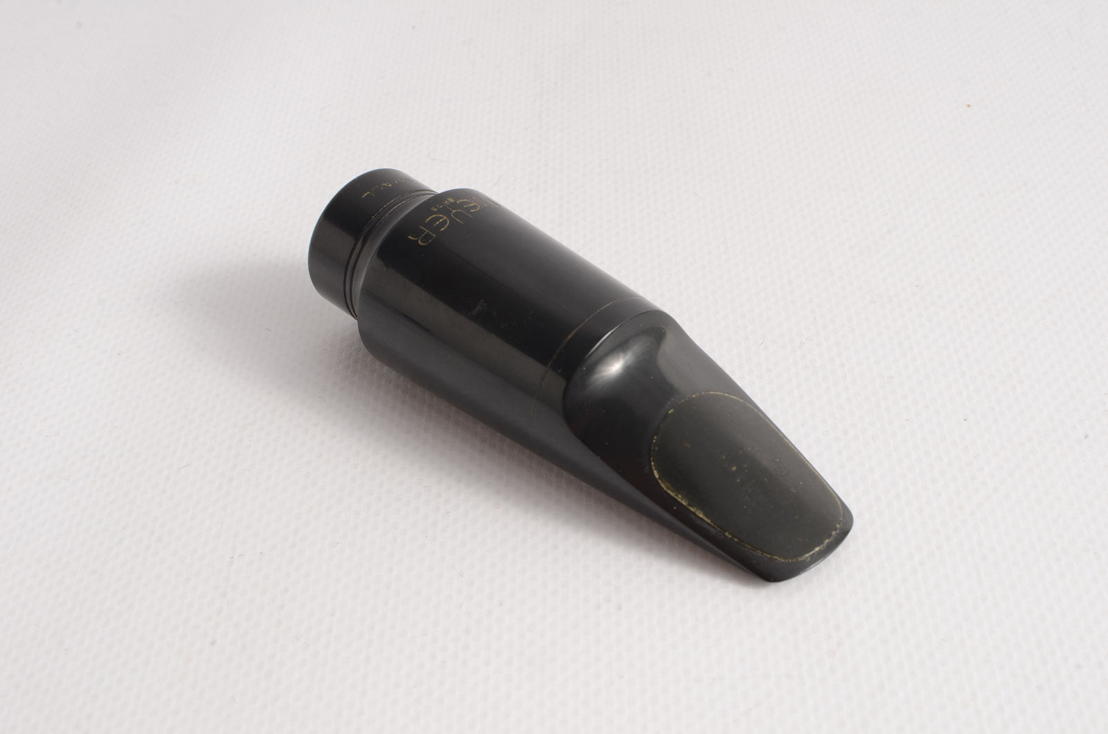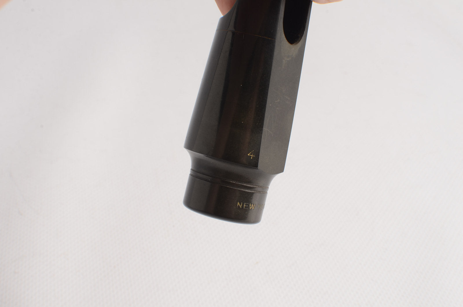 This is a Meyer Bros NY 4M Small alto saxophone mouthpiece. It has a slight rollover baffle, curved side walls and a small round chamber. The tip opening measures at 0.068. There is some slight wear from age but nothing that will affect playability.