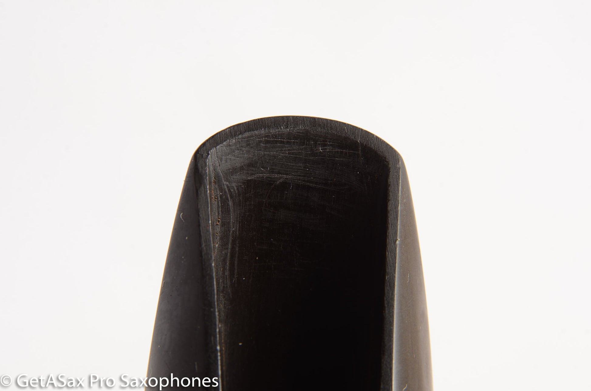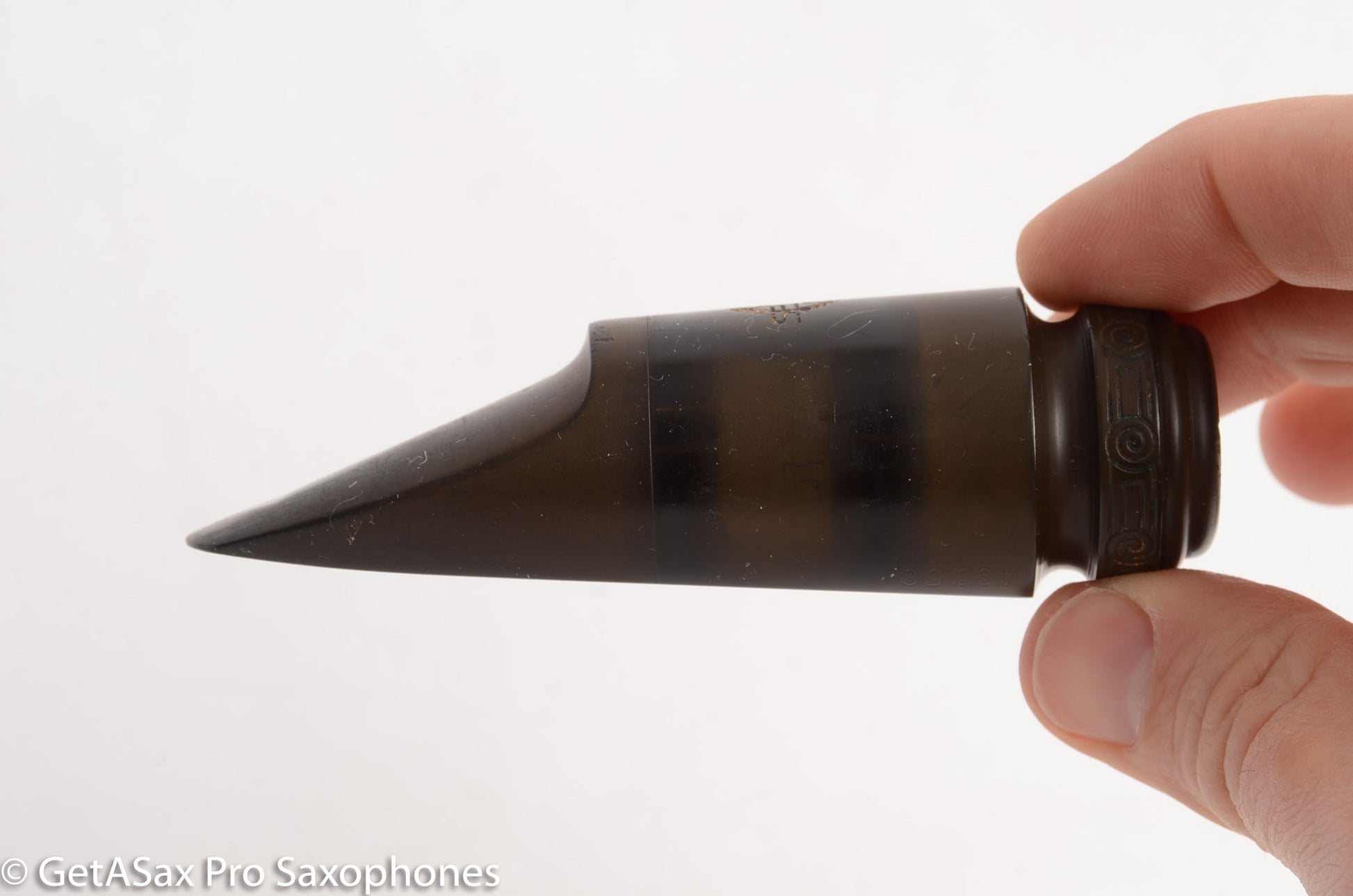 Very old 1930's Selmer mouthpiece with cool art deco scroll work, deeply scooped sidewalls, large round chamber, no baffle. Tip opening measures 0.068". Dark mellow tone, subtone special with a hard reed. High resistance and limited projection. Has been worked on a bit already, and would be a great reface candidate.