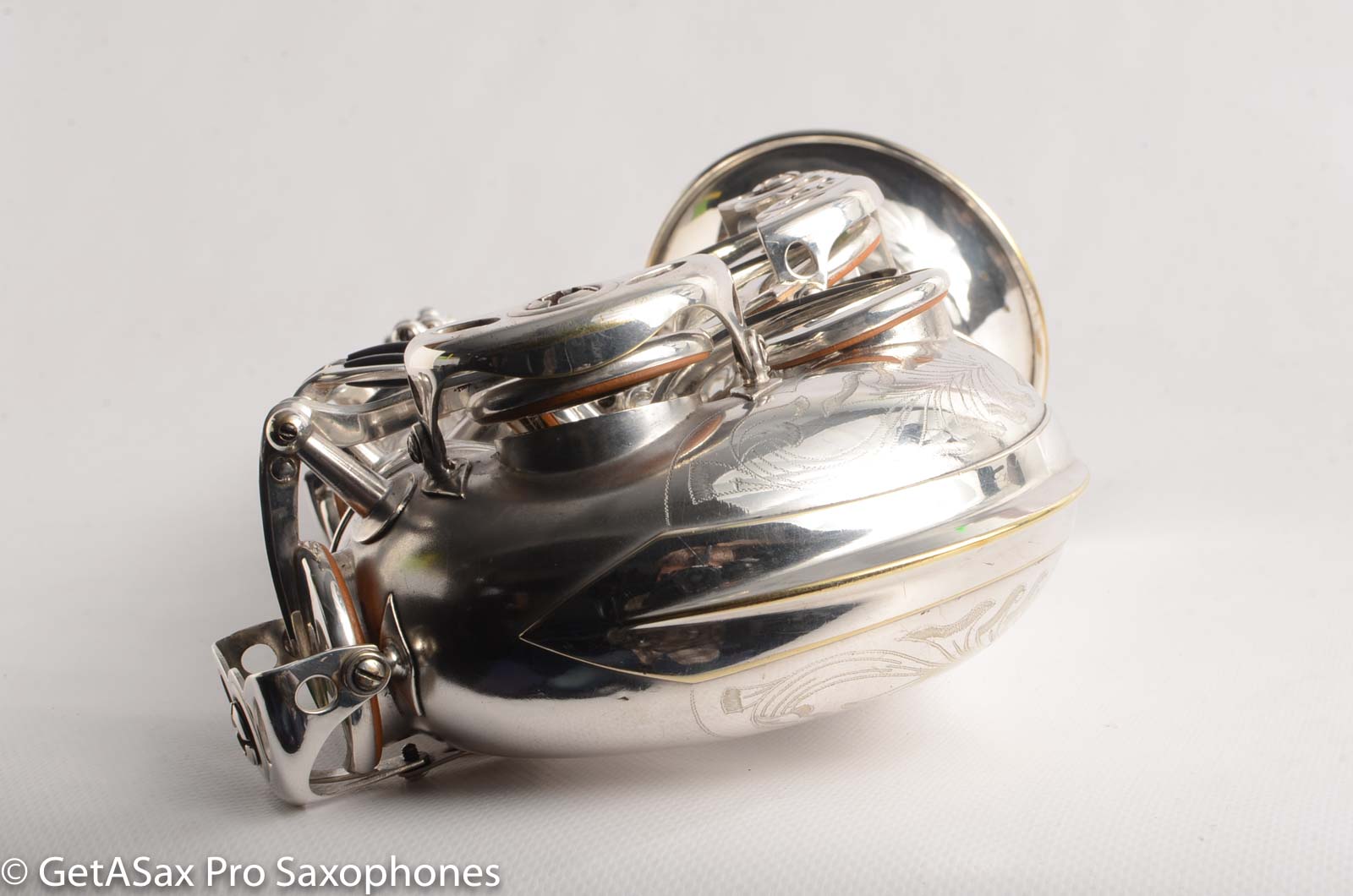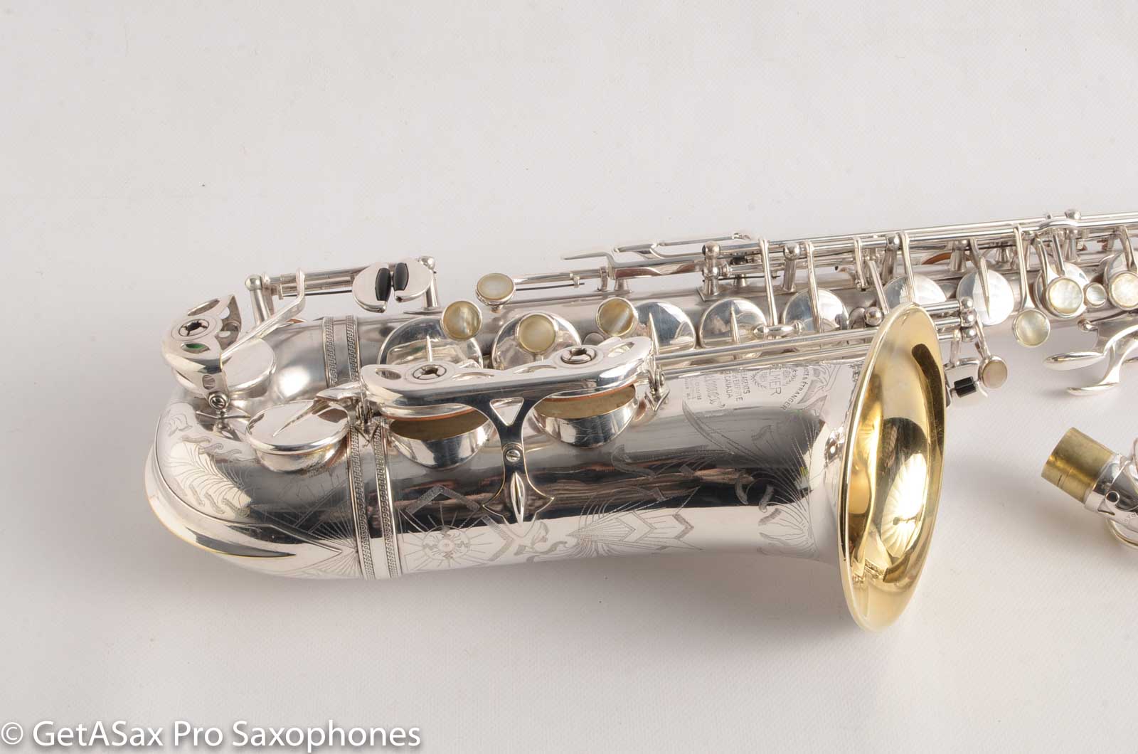 This is an amazing, fully restored Selmer Balanced Action alto. It just got a wonderful high-end overhaul, complete with some spot plating on some keys and along the back of the body tube where the silver had begun to wear. This is one gorgeous alto, with the rare British market two-tone finish, and gold wash bell. The spring tension is on the lighter side, like with most Balanced Actions. If you want stiffer spring tension, we could discuss replacing the springs, but right now, it has a light flute-like feel like these originally had.