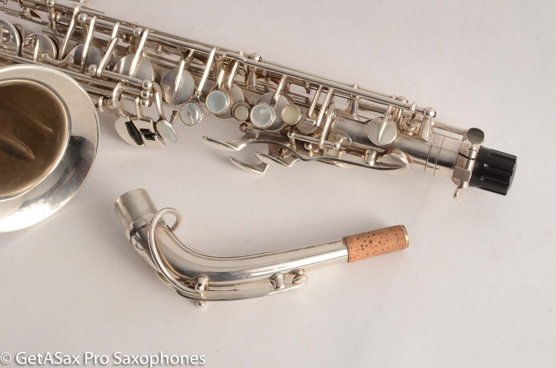Anyway, it would be hard to find a nicer example of a Selmer Balanced action alto saxophone than this one. It has nearly all of its original silver plate intact, and it has no dents or dings, and no resolders. The bell flare, bow, neck, and body tube are clean and undamaged. The neck is particularly nice. This sax also comes with a recent overhaul done by Jack Finucane, and it feels good under the fingers, with everything nice and snappy and sealing well. You won't have to put money into this one to get it playing well, and it won't need more than regular maintenance to play well for a nice long time.