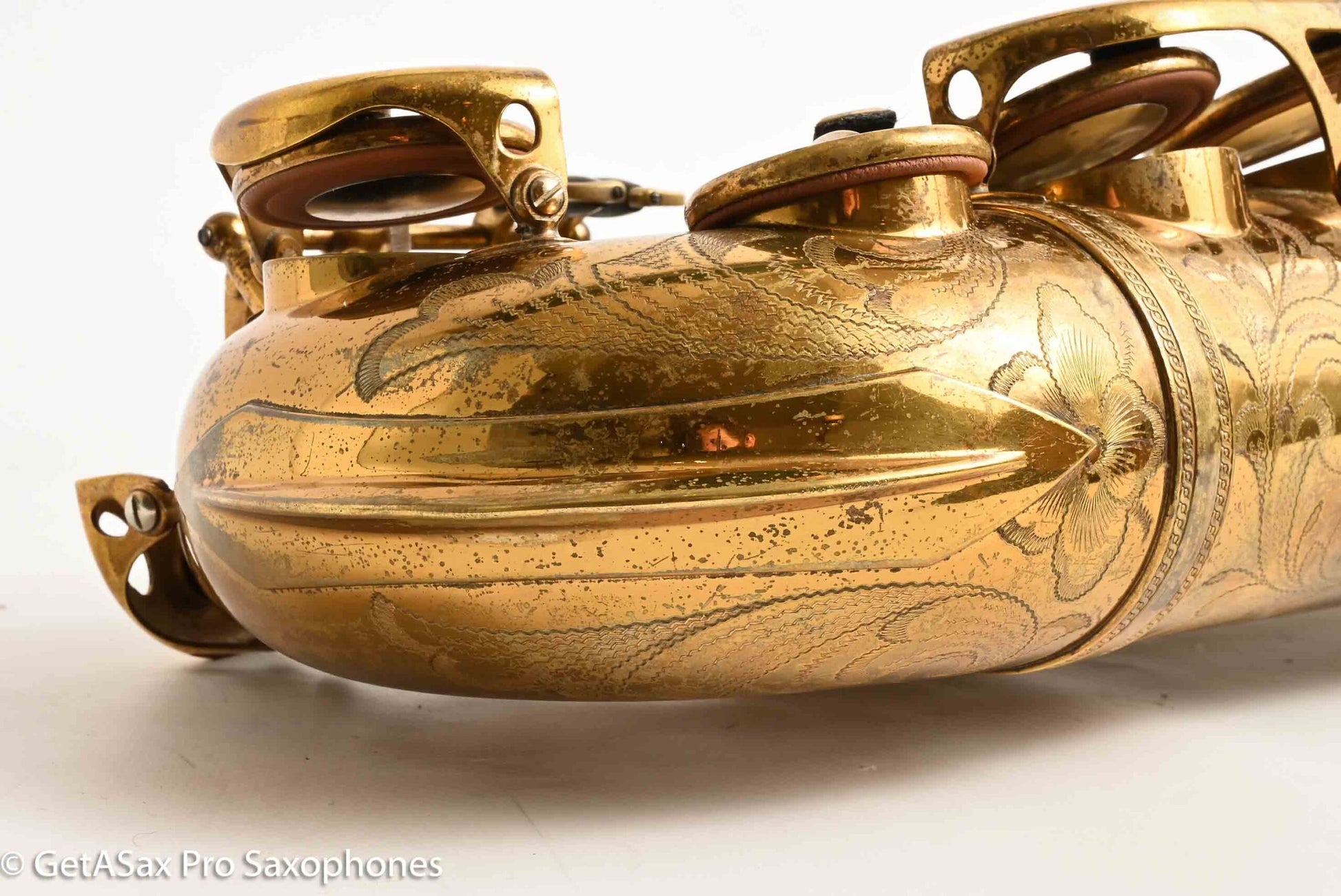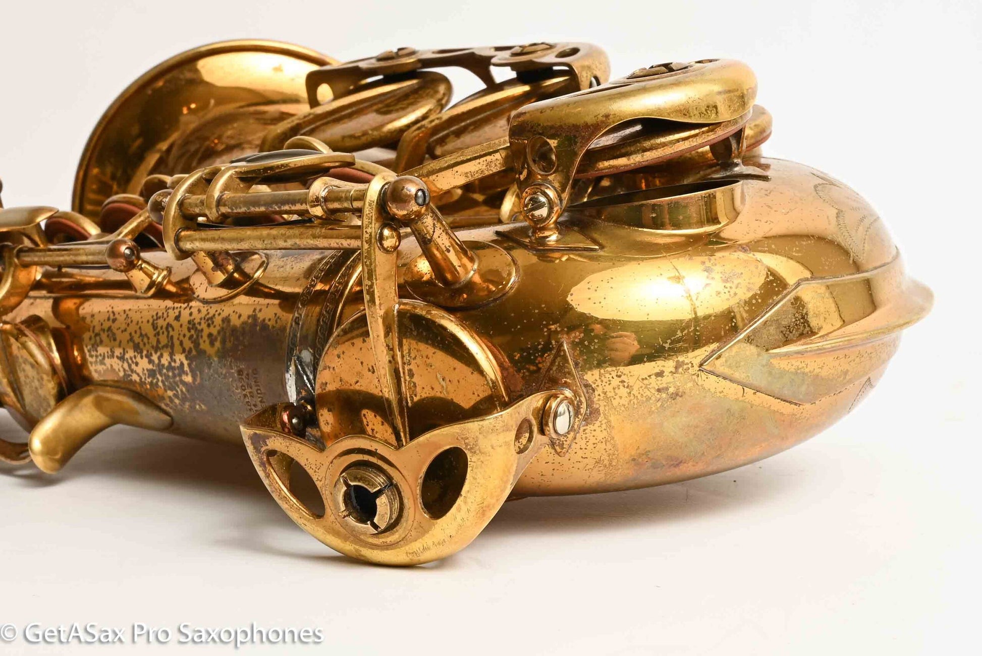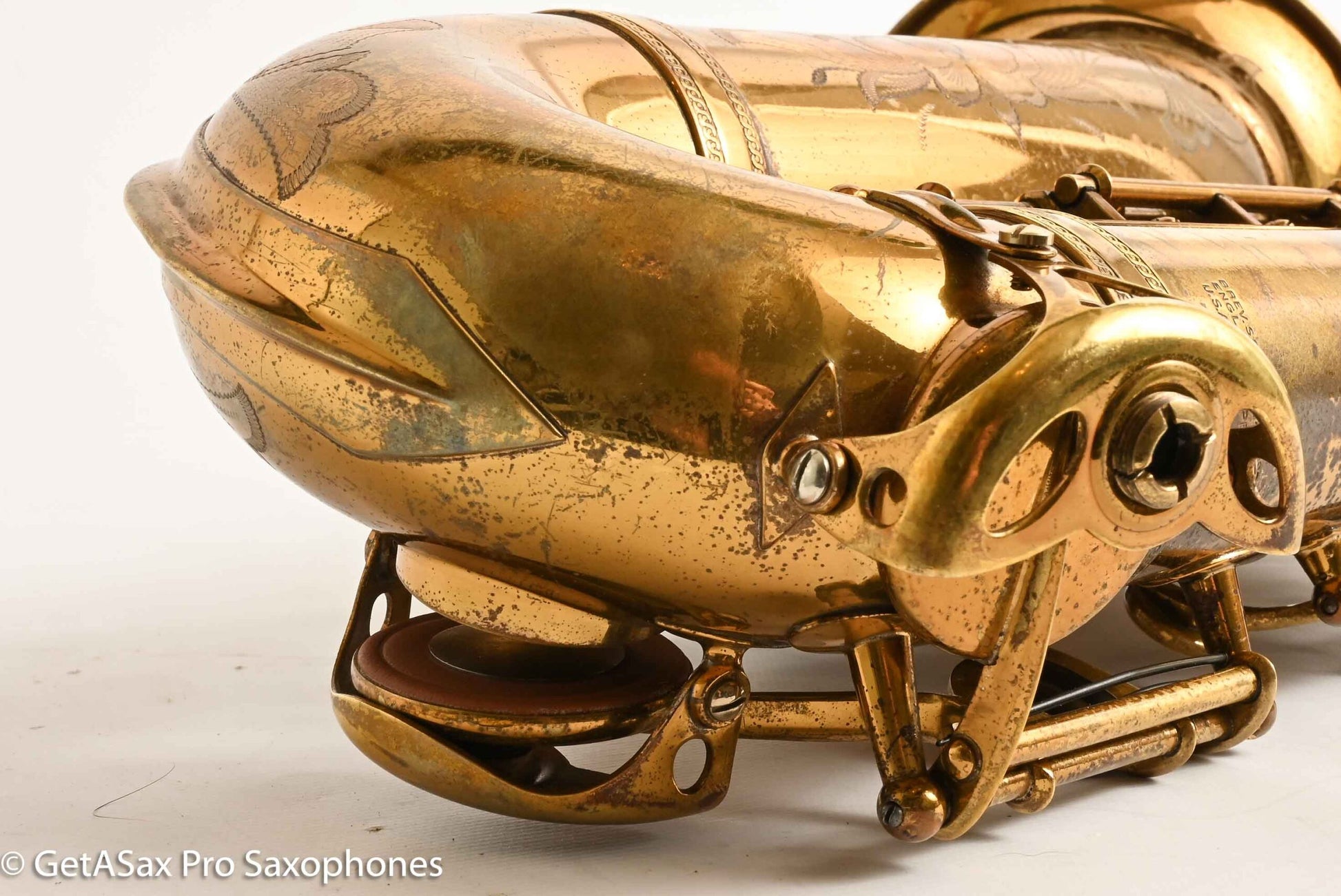 This is a gorgeous, original lacquer Selmer Balanced Action alto saxophone with a recent (a few years ago, very lightly played) overhaul by Boston Sax Shop with Pisoni Italian leather pads and Selmer style (correct) slightly domed resonators. It feels nice and snappy under the fingers and plays effortlessly. I play Balanced Action myself on alto, because it has a warm, sweet, spread, medium dark tone. It brightens up beautifully with a GS New York or keep it cool and darker with the GS Hyperion or Brilhart or MC Gregory (for the Desmond vibe). Selmer Balanced Action altos are some of the best sounding altos ever made, and they don’t sound like any saxophone made today. It’s also one of the most beautiful, with the honey colored original nitrocellulose lacquer intact, and the extensive hand engraving with the little sailboat scene that everybody loves. Can’t beat it. The only past repair I see is a resoldered upper foot of the Eb guard. This always pops off on Selmers because it’s soldered onto an uneven surface. There are no dents or dings, the neck has not been pulled down, and everything is straight and beautiful. Just some normal lacquer wear from use.