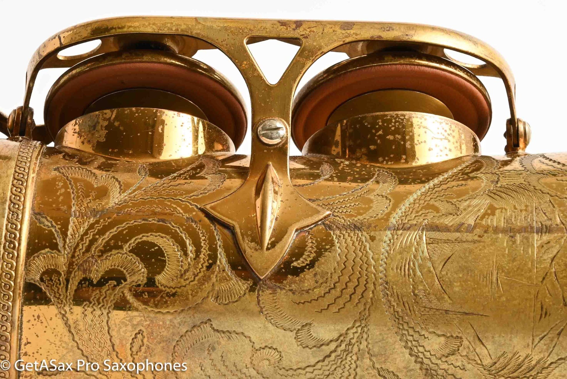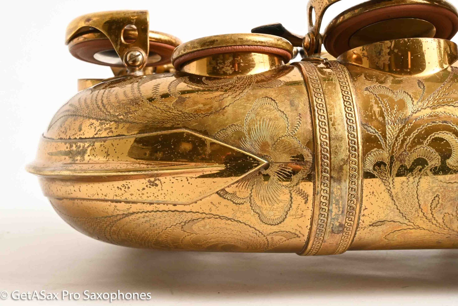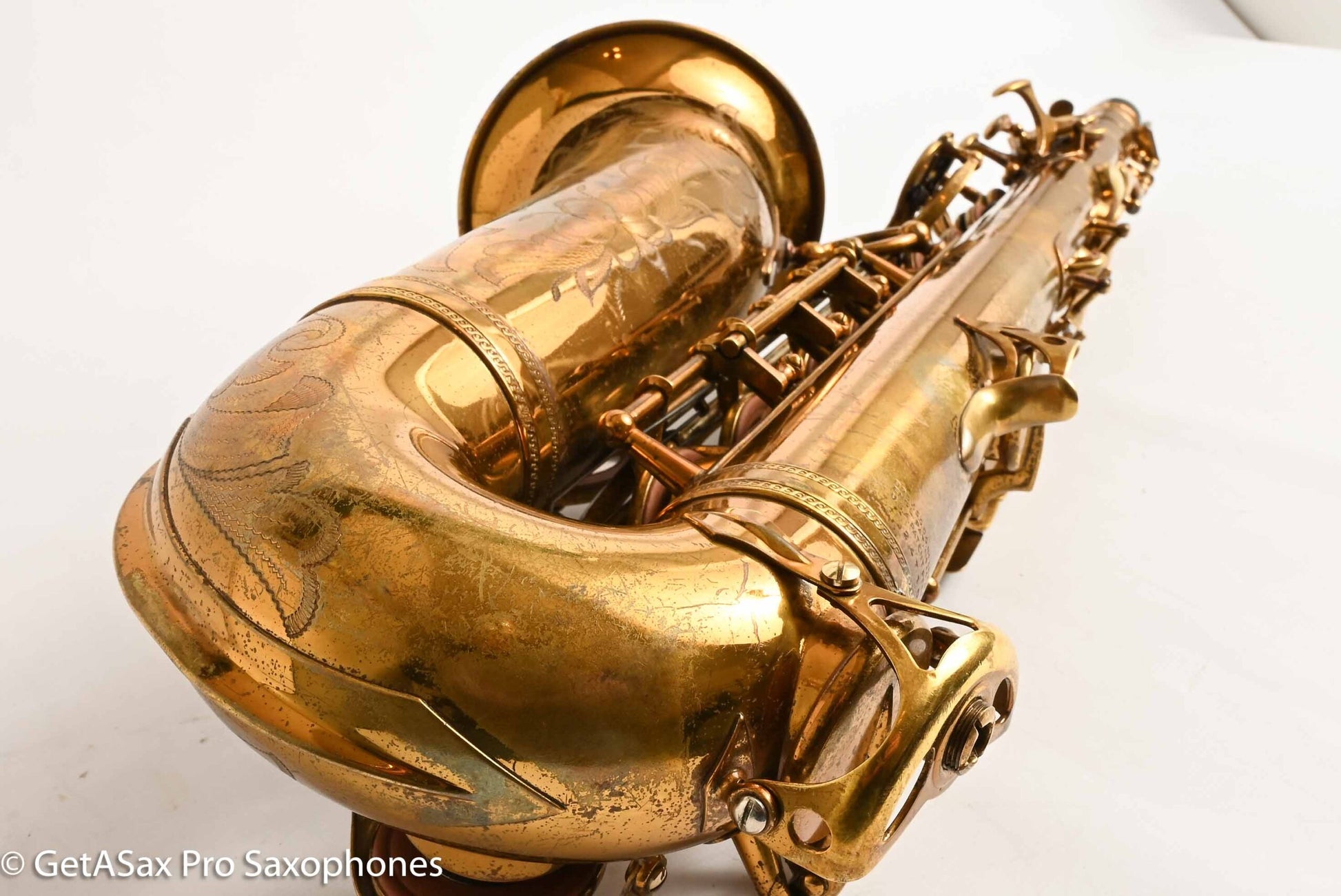 This is a gorgeous, original lacquer Selmer Balanced Action alto saxophone with a recent (a few years ago, very lightly played) overhaul by Boston Sax Shop with Pisoni Italian leather pads and Selmer style (correct) slightly domed resonators. It feels nice and snappy under the fingers and plays effortlessly. I play Balanced Action myself on alto, because it has a warm, sweet, spread, medium dark tone. It brightens up beautifully with a GS New York or keep it cool and darker with the GS Hyperion or Brilhart or MC Gregory (for the Desmond vibe). Selmer Balanced Action altos are some of the best sounding altos ever made, and they don’t sound like any saxophone made today. It’s also one of the most beautiful, with the honey colored original nitrocellulose lacquer intact, and the extensive hand engraving with the little sailboat scene that everybody loves. Can’t beat it. The only past repair I see is a resoldered upper foot of the Eb guard. This always pops off on Selmers because it’s soldered onto an uneven surface. There are no dents or dings, the neck has not been pulled down, and everything is straight and beautiful. Just some normal lacquer wear from use.