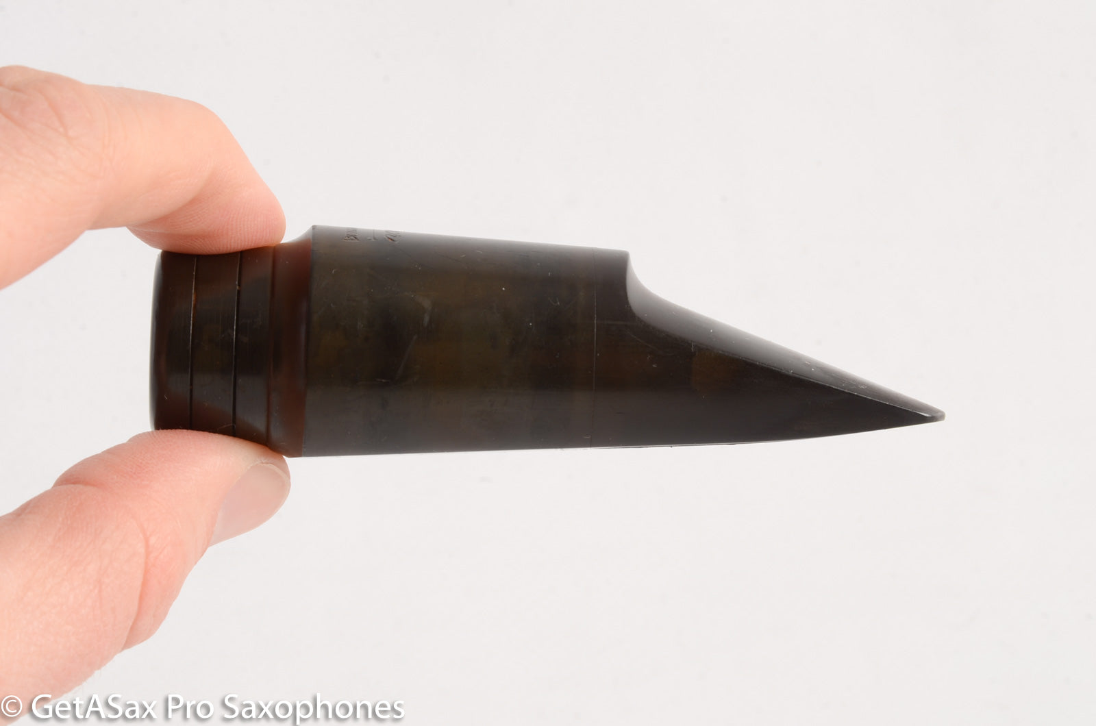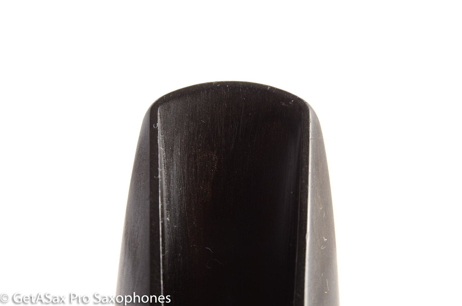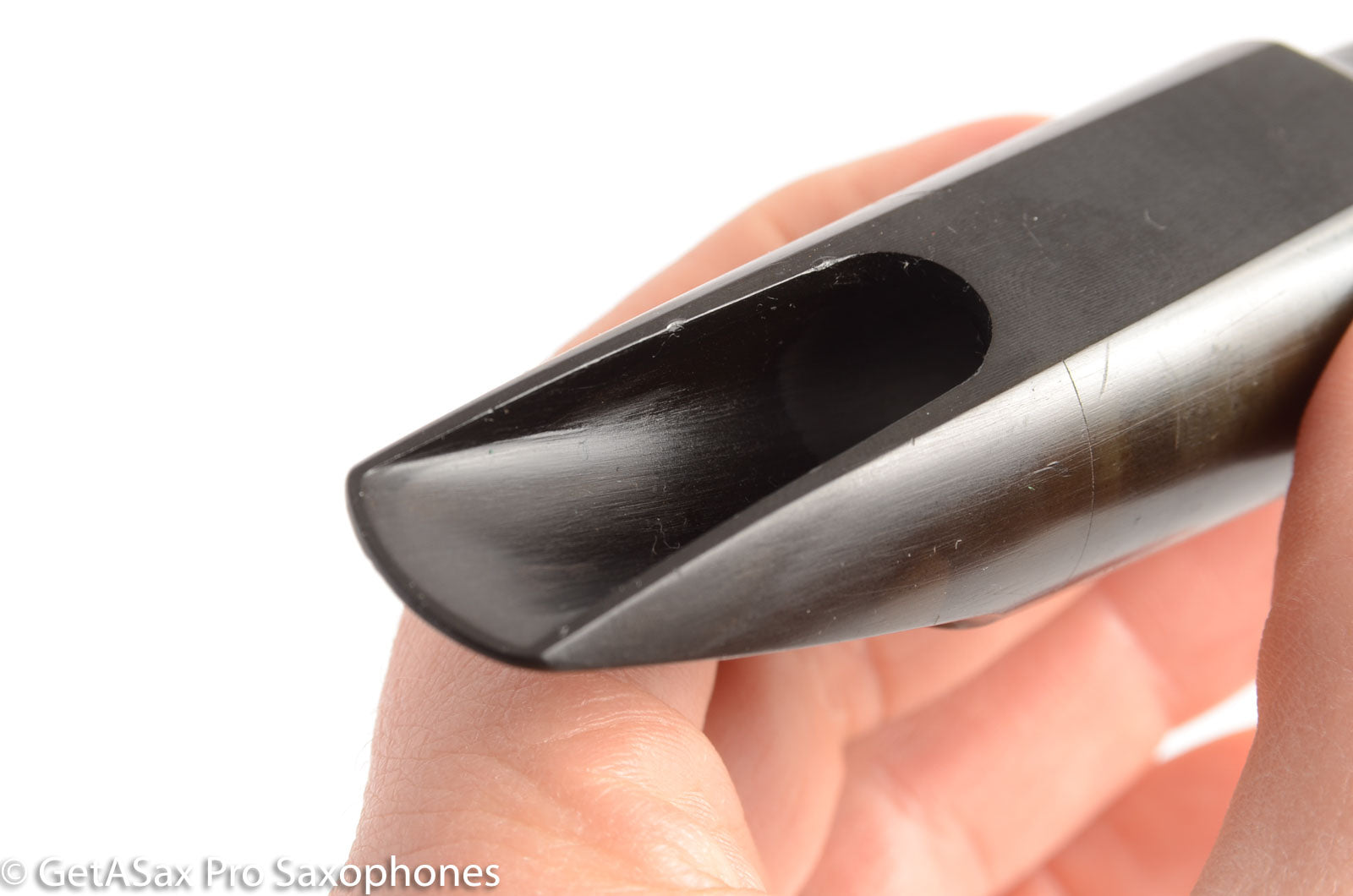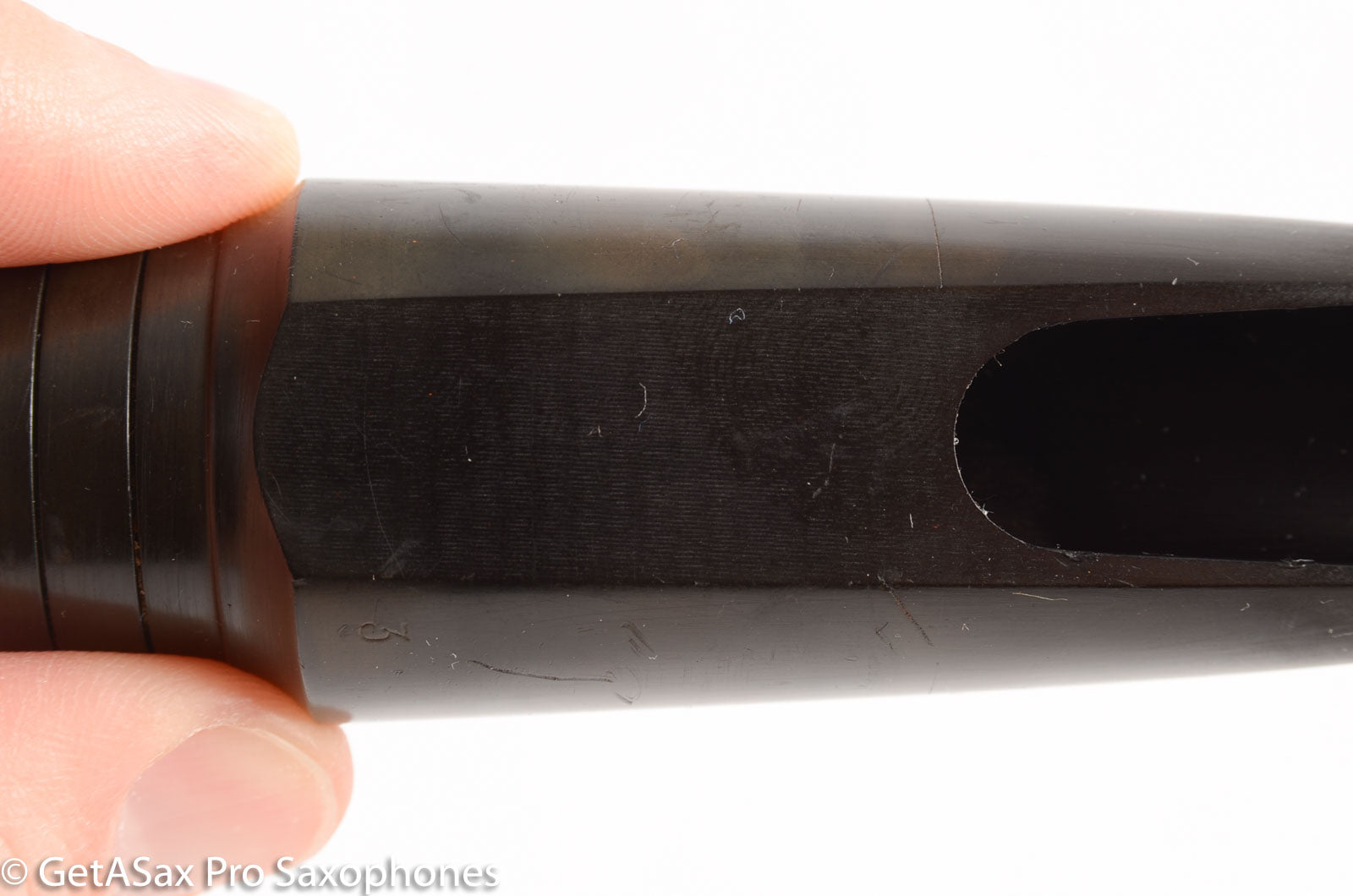 Lightly scooped sidewalls, large chamber, short rollover baffle. Tip opening measures 0.078". This piece has moderate to high resistance, and unusually good projection for this small of a tip opening. Nice denim marks on the table, and good even rails. The tone tends towards dark, but with a buzziness that can provide some tonal flexibility. It would make a great intermediate player piece as is or get it refaced for a budget Dukoff Supersonic clone.