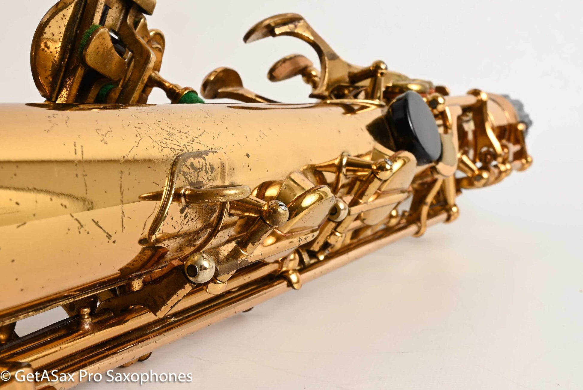 This particular Mark VI alto is in very good condition. It has most of its original lacquer intact and American engraving and assembly. No high F# (which is the more desirable version), and the original neck is in excellent condition with no past damage. There are no dents or dings on the saxophone, and I don’t see any signs of past dent work at all. The only past repair I see is a minor one where the foot of the low Eb keyguard popped loose and got reattached. This very commonly happens and is not a big deal. The pads are older but sealing well enough for you to play this and enjoy it for a little while before getting it overhauled or at least partially repadded. It will be a glorious alto overhauled, I can say with complete confidence. I just reduced the price to give you room to buy it and get it overhauled, and still be lower than these usually sell for. I’ll also include a nice original Selmer case with it, the grey zippered version from 1966 that is the same type that would have originally come with this one. Great deal!