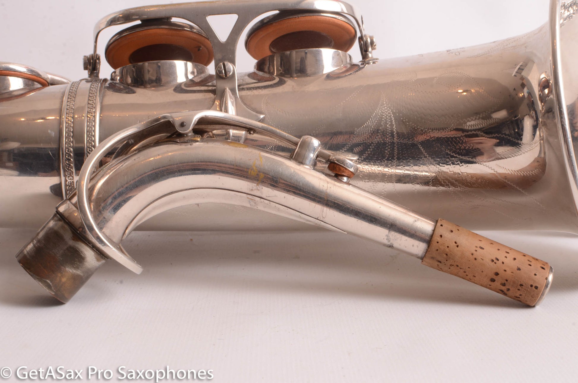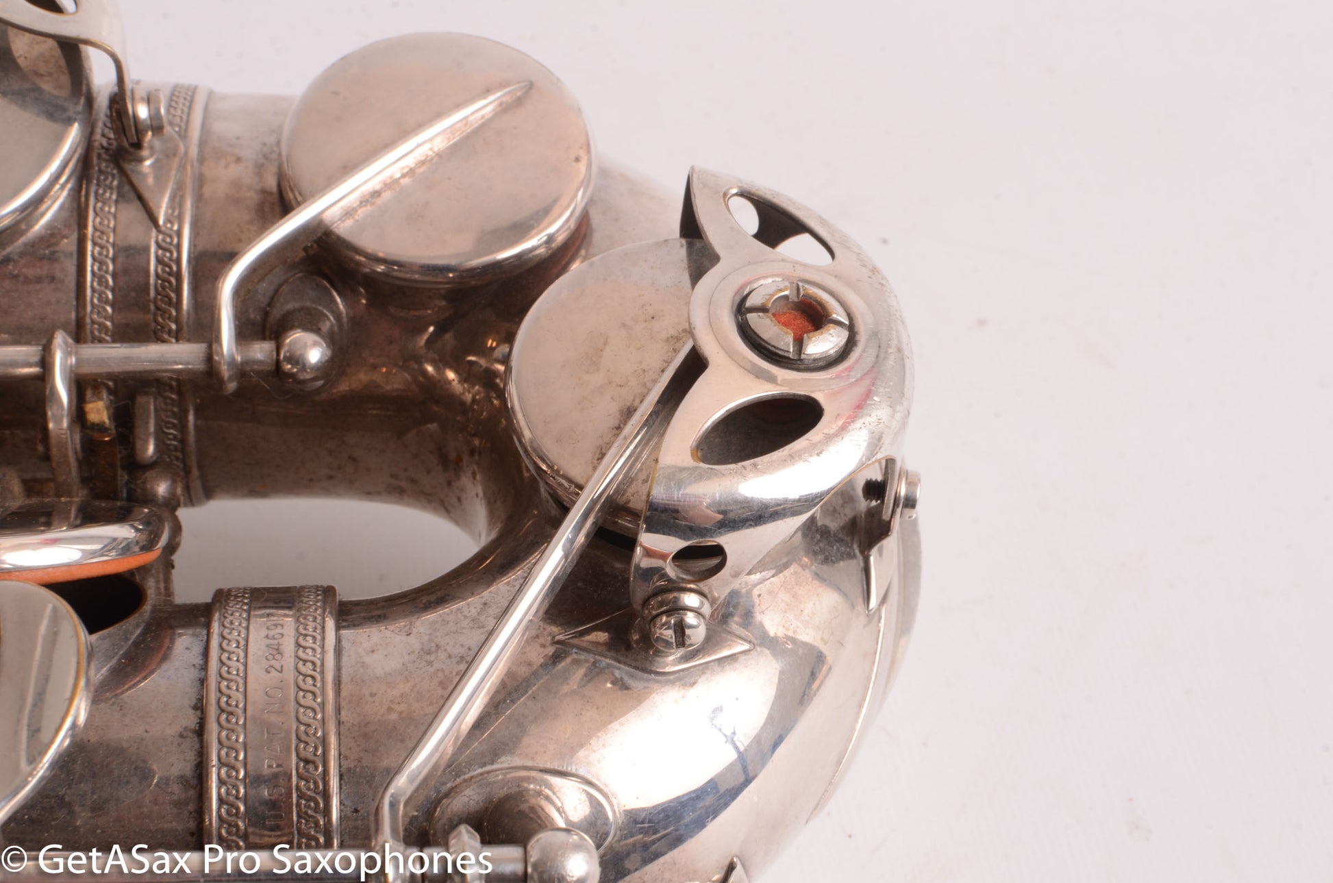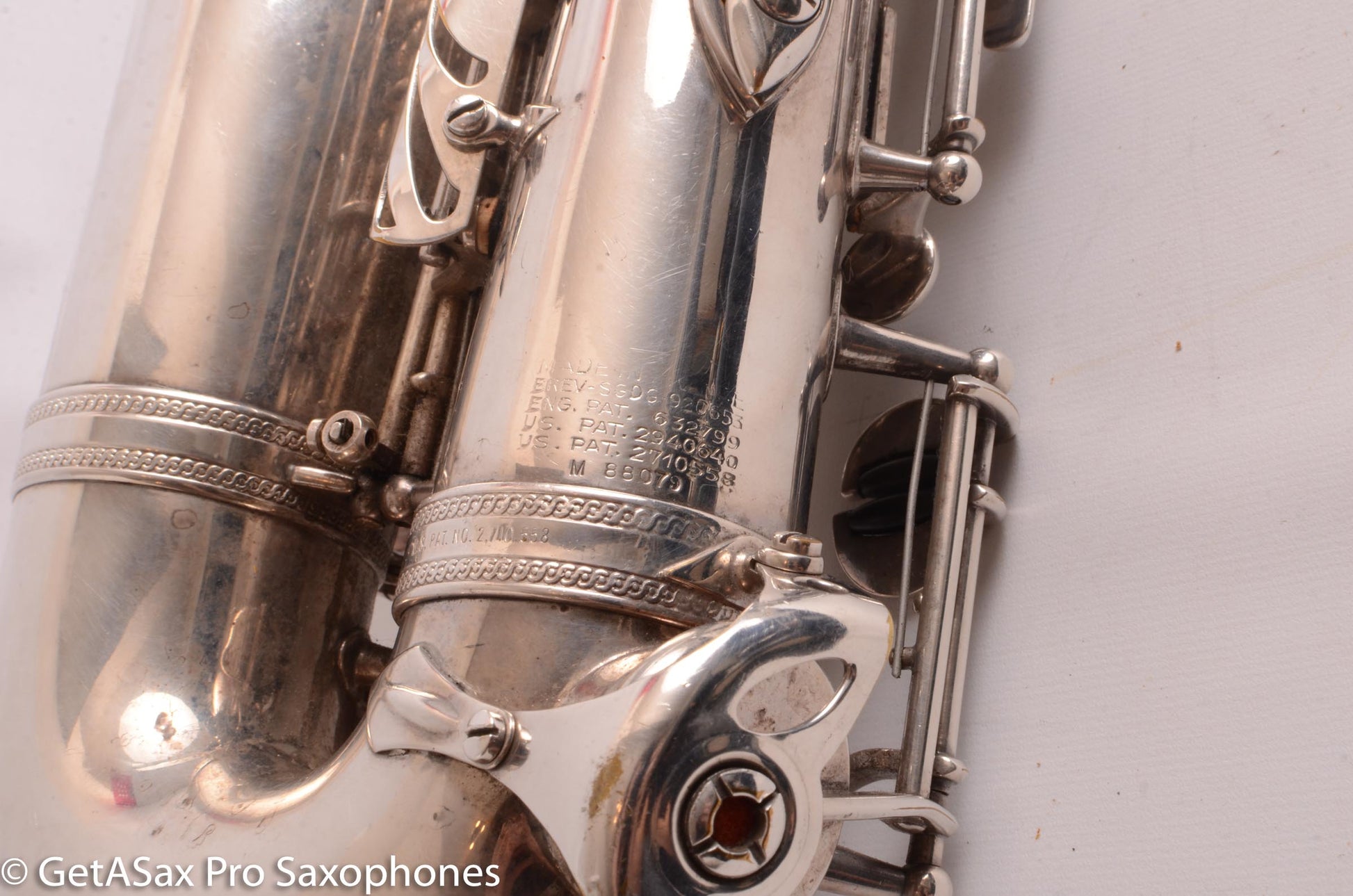 This is a well cared-for Selmer Mark VI alto saxophone from 1960 that has the high F# key and silver plate. The silver plate finish is aftermarket, done so that this would match the other instruments in a military band. It doesn’t look like it was relacquered or buffed significantly as part of that process. Probably just chemically stripped and then plated. It currently has older pads that are still sealing fairly well. It has the original neck with matching serial number. It’s american-engraved, in case you were wondering. Plan on a repad before too long. You would be hard pressed to find a nicer Mark VI for this price. The 80k serials are just about the most desirable version, and they are often priced much higher. Plus you get the high F #, which is a big bonus for many players today.