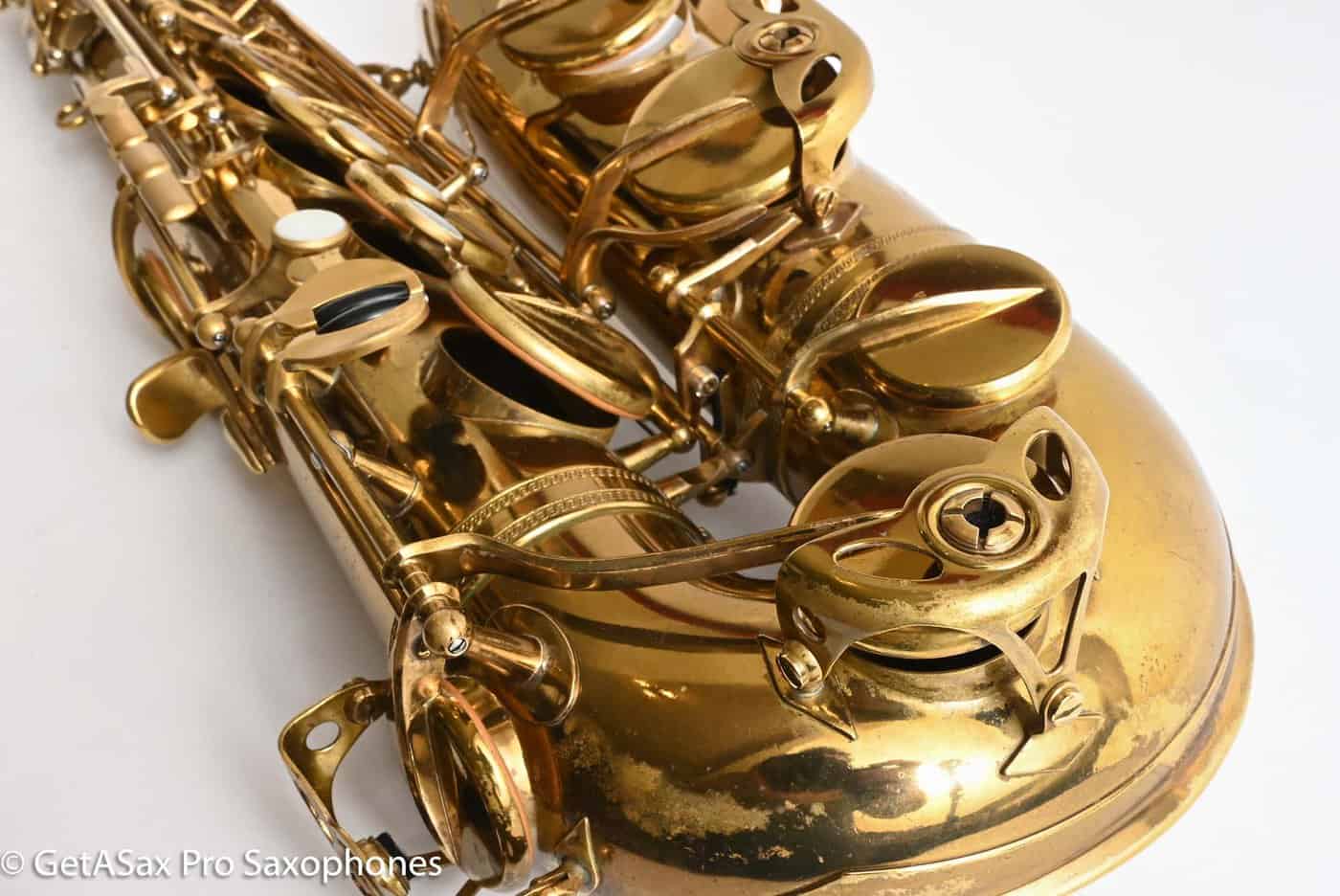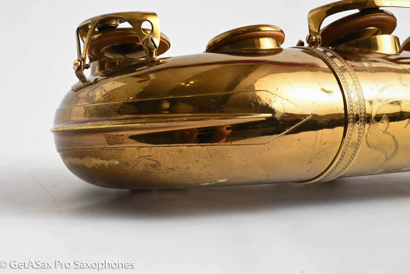 This is a super nice 1964 Selmer Mark VI Tenor saxophone with original lacquer, American engraving, and a full overhaul just completed through GetASax. This horn was the main tenor of a local pro player until he died, and then we got it overhauled to sell for his widow on consignment. It was the one he ended up on after a lot of horn swapping over the years, and it plays beautifully. The overhaul was done with Pisoni Italian leather pads and really nice reusable slightly domed Selmer-style brass resonators similar to what Selmer used in the 1950s. (This is my favorite setup for a Selmer Mark VI). This tenor has been played a fair bit, because it plays well, so it has some signs of wear and use, though the original lacquer is also still looking great. The chromatic F# keyguard is resoldered, there’s some general lacquer wear from use, and there’s a plugged mic pickup on the back of the neck in the Selmer badge (not very noticeable). Some miscellaneous dents and dings removed, as you can see from the lines in the lacquer, back of the bow and body tube area. The neck shows signs of slight pull down, but not bad. It is more just minor flexing over time rather than any actual damage.