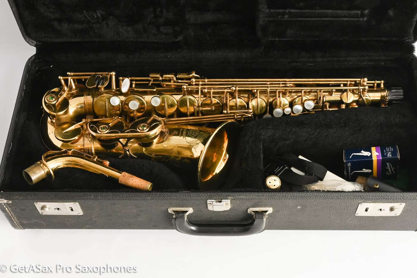 Original lacquer early version Selmer Mark VII alto. This has original pads, but it is American-engraved and assembled just like a late serial Mark VI. Really nice horn with original case included. You’ll need to replace the pads, or at least get a thorough tune up done, but it’s hard to beat for the price.