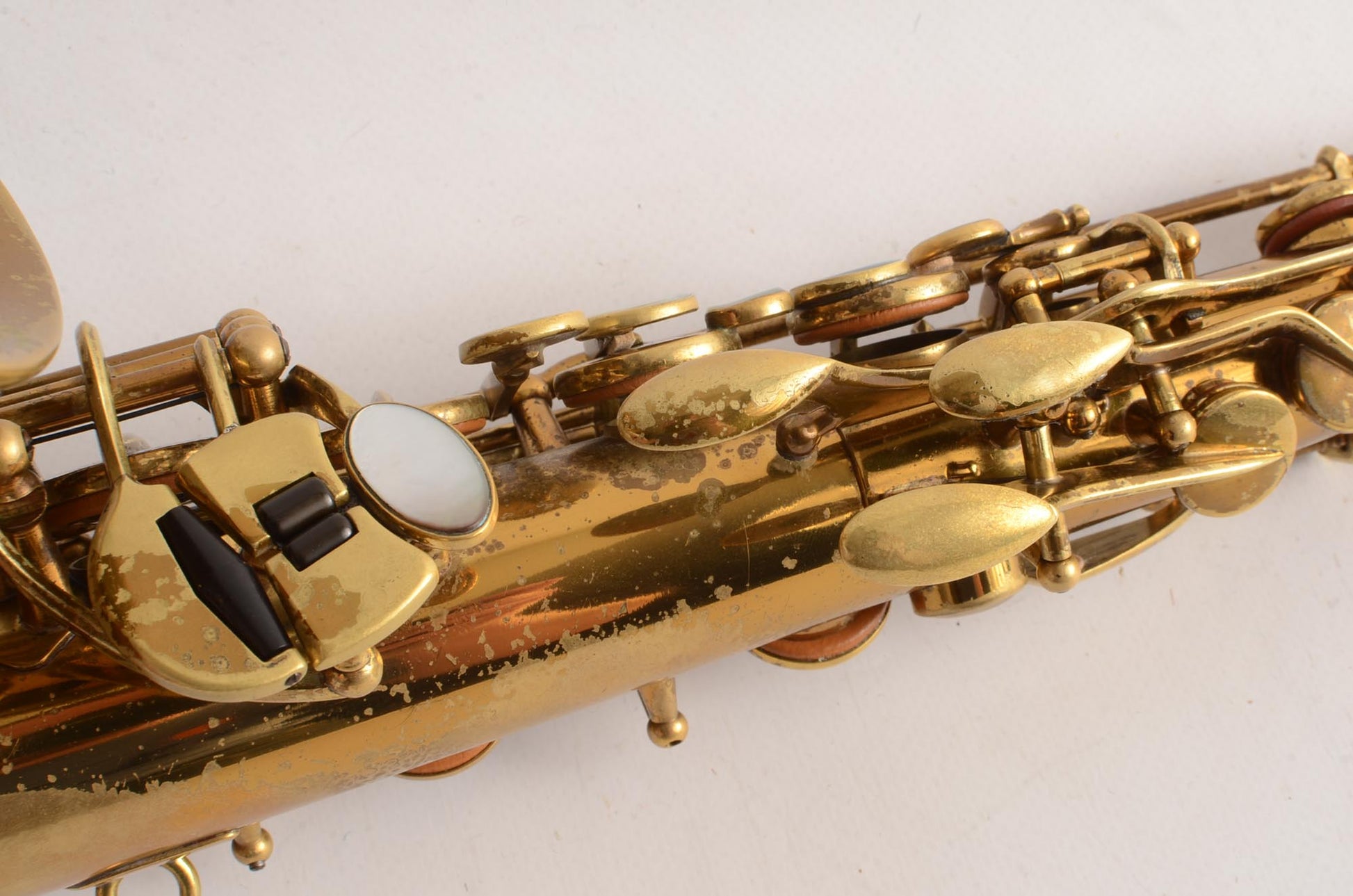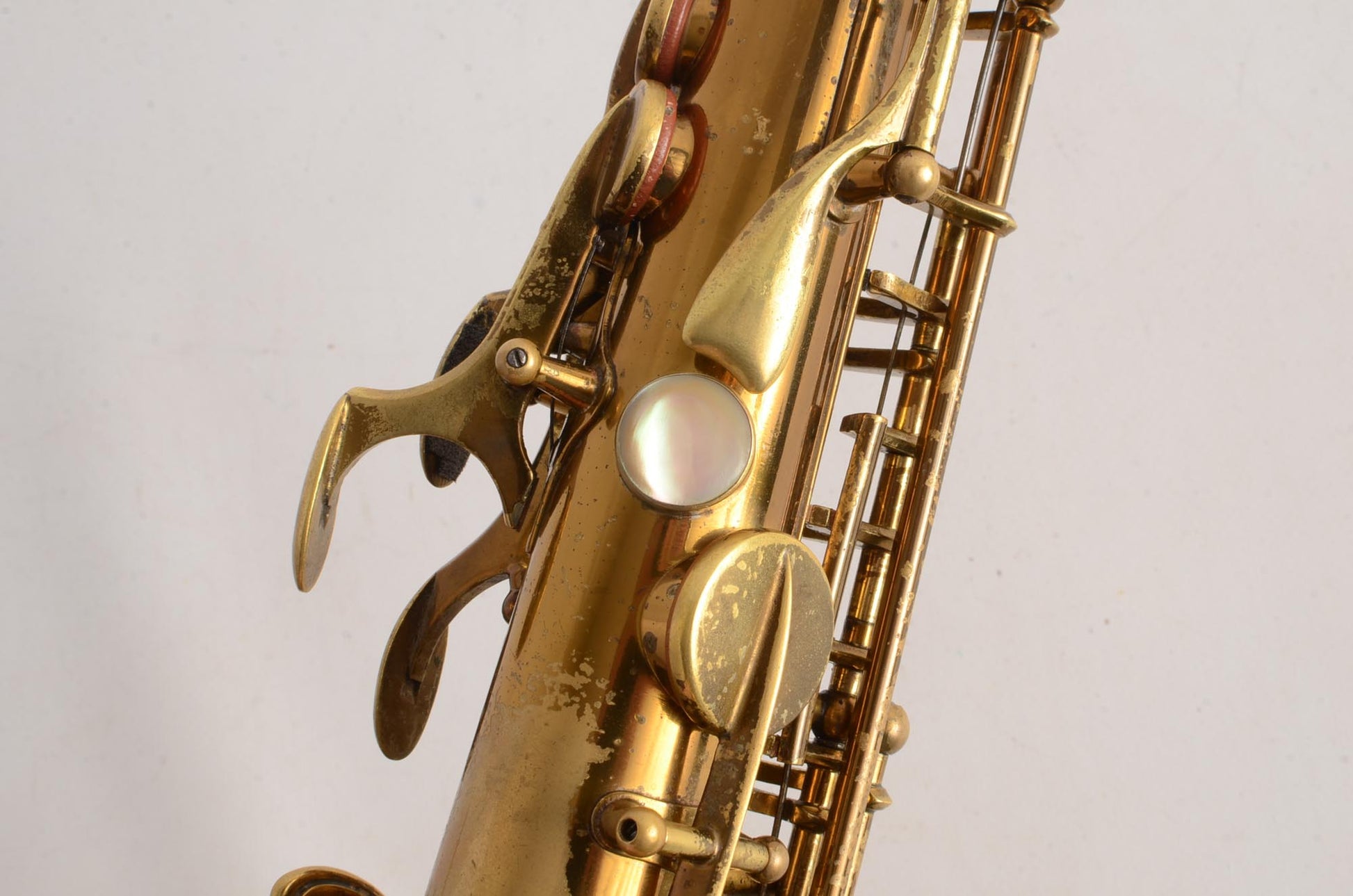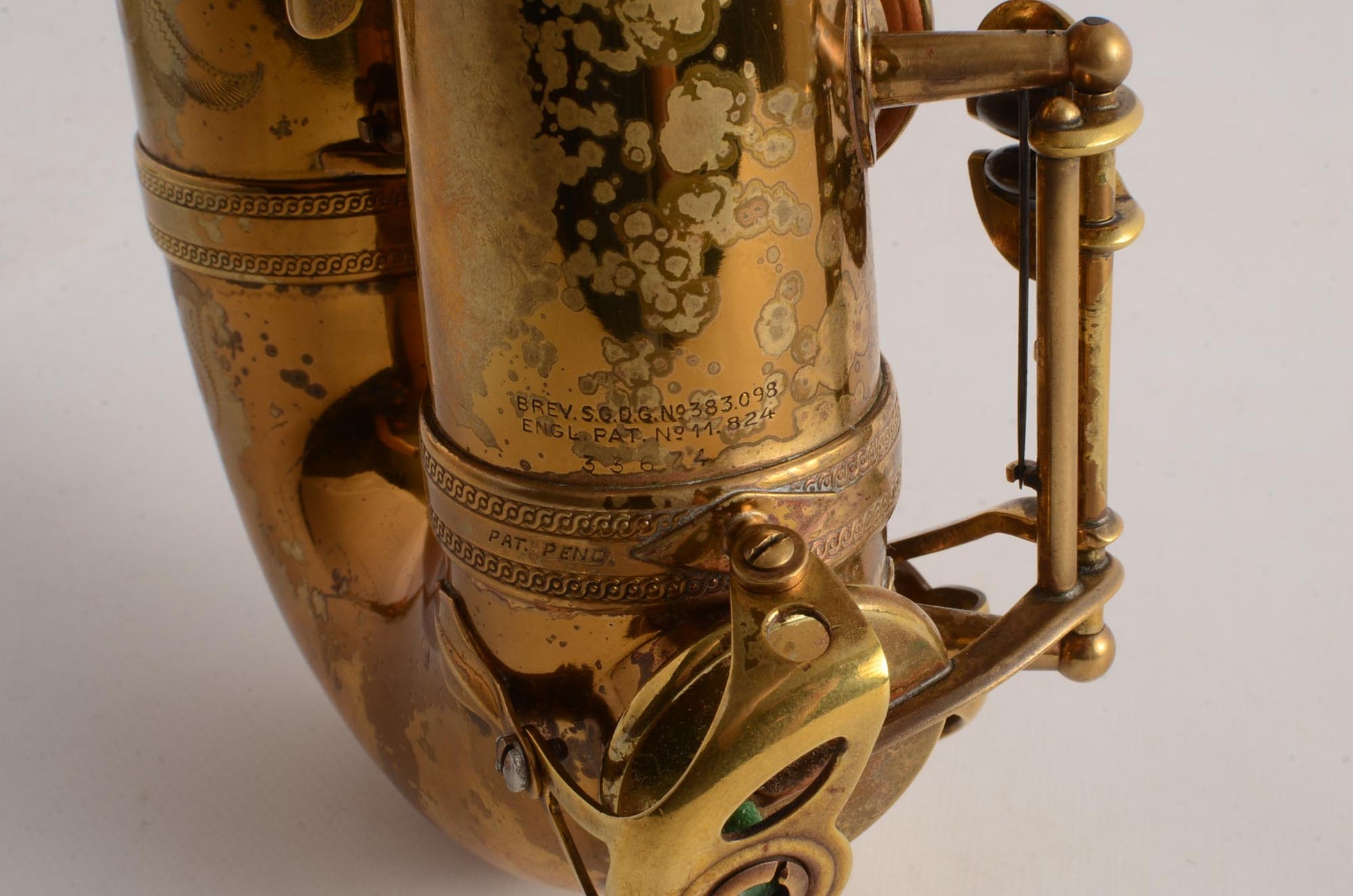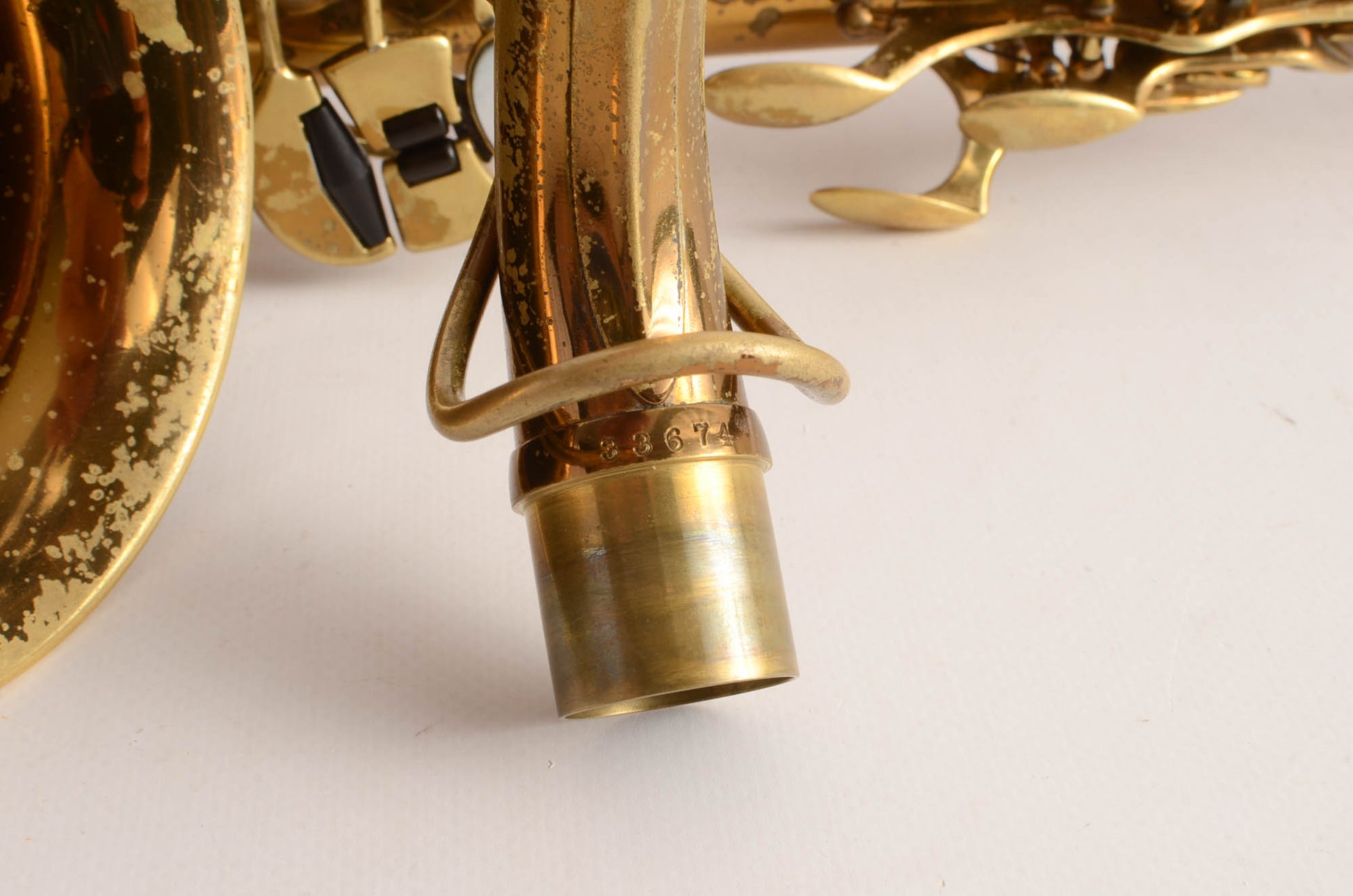 The neck is in excellent condition, body tube, bell flare, and bow are all undamaged. The engraving on this alto is particularly nice, and the exposed part of the brass is developing a beautiful matte patina that accentuates the engraving. This is a horn that looks even better in person than in the photos. It comes from a lifelong saxophone player whose baritone and tenor were also stand out players. He really had three excellent saxophones and this one is no exception.