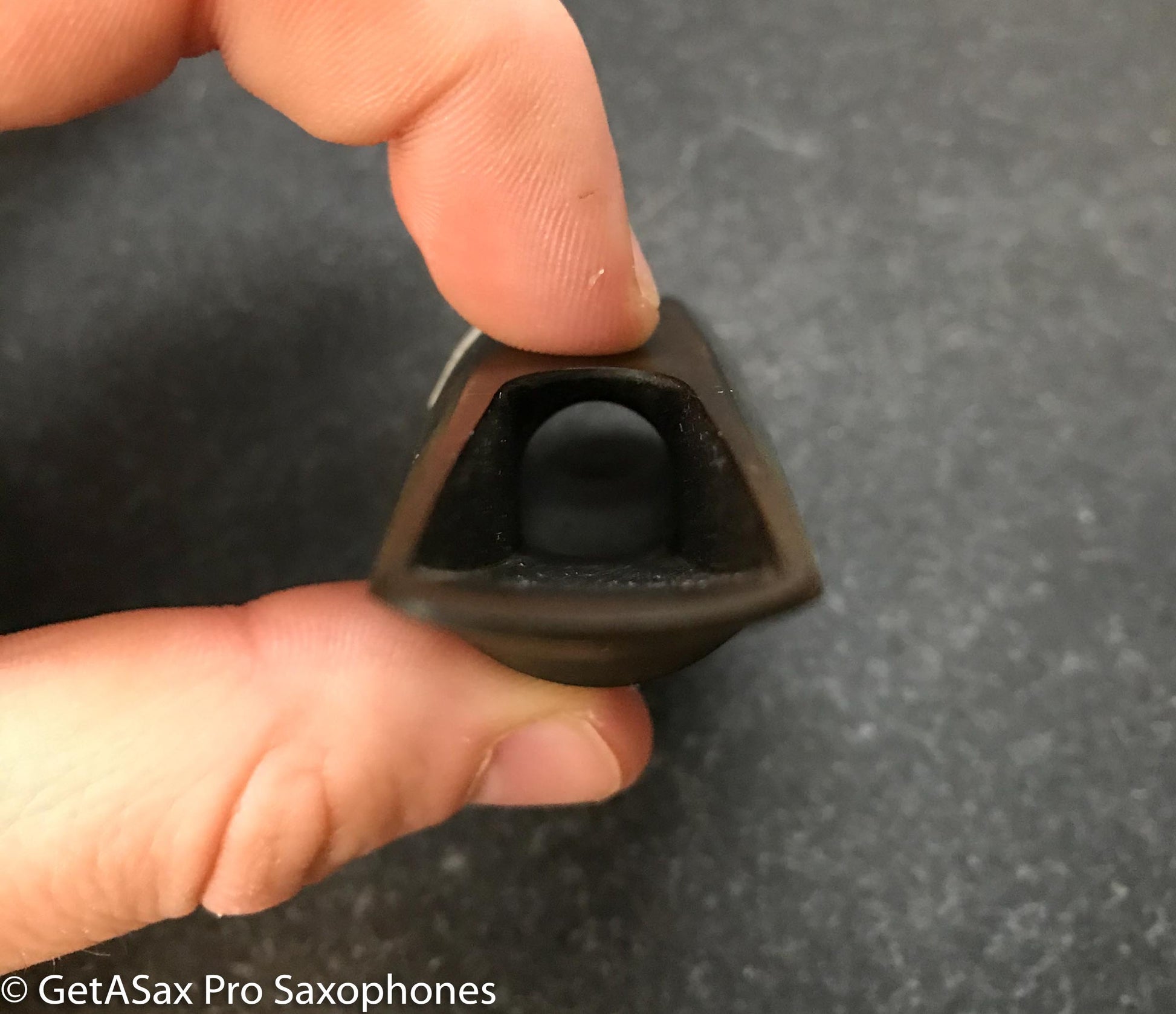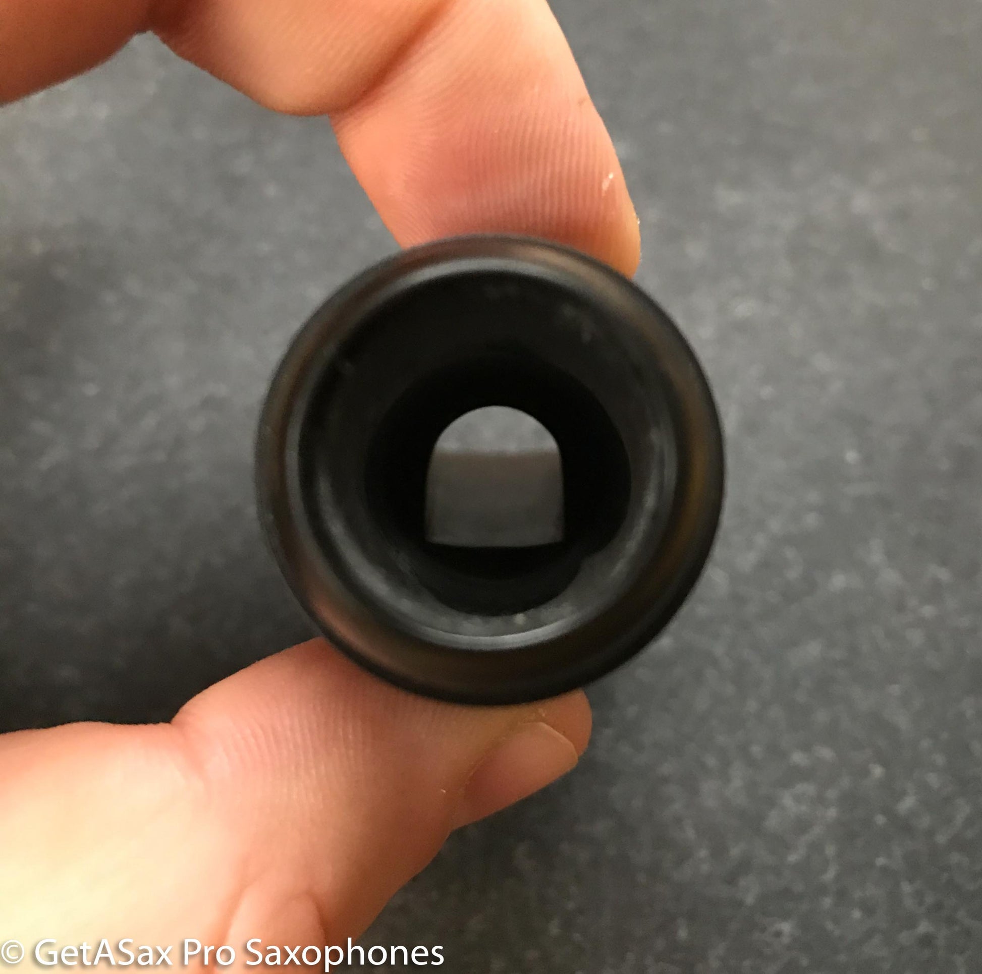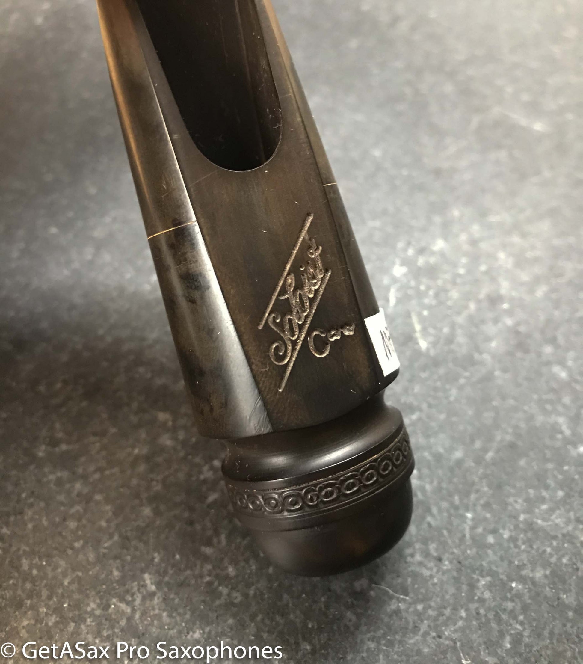 Oxidized vintage hard rubber, but that would clean off if you wanted to. It has light tooth scratches that look worse than they are because of the oxidation. This would look new with a tiny bit of TLC. Hard to find a nicer short shank Soloist. This will either get you a nice classical tone, or complete your set with a 5-digit VI, or you can open it up and do the Kenny Garrett thing for jazz if you like. These sound a lot better than a Meyer on a modern Selmer in my opinion. Kind of a natural upgrade for your Series II or III alto.