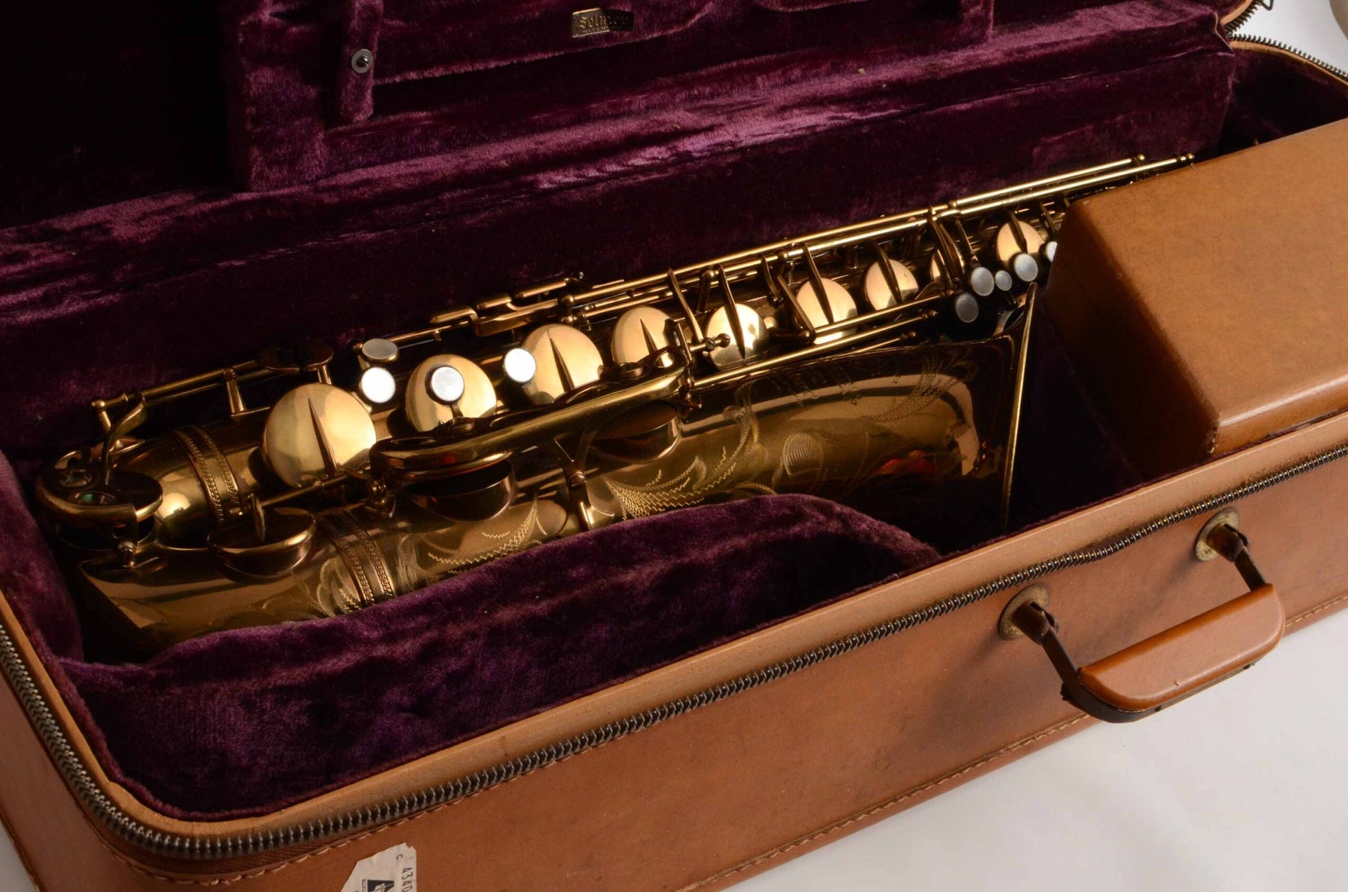 Well, I’m asking a lot for this one, but there hasn’t been an original pads, original case, undamaged, American-engraved, original lacquer Selmer SBA tenor on the site in quite some time, and I think it’s rare and great enough to warrant it. The nicest violins, guitars, flutes, bassoons, pianos, cellos – almost any other instrument – are all way more expensive than this, so I think it’s pretty reasonable relatively speaking. The original case is beautiful, original pads and Tone-x resonators are intact. No damage at all. This one is great!