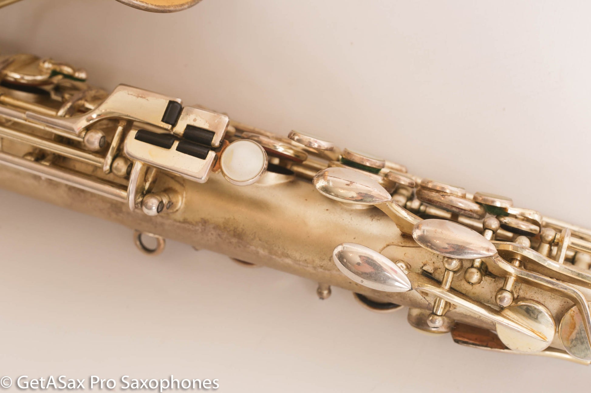 This is an absolute gem of a vintage Selmer alto. It’s a time capsule with original factory lacquer over the original silver plate and original pads, original case, and all-around a remarkably beautiful American-engraved Super (‘cigar cutter’) alto. These altos play with a sweet, lyrical tone that feels about halfway between what you think of as a Selmer, and how a vintage Conn feels to play. That’s not so surprising, since at the time, Conn was the foremost saxophone maker, and all other brands wanted to get some of the Conn wideness into their tone.