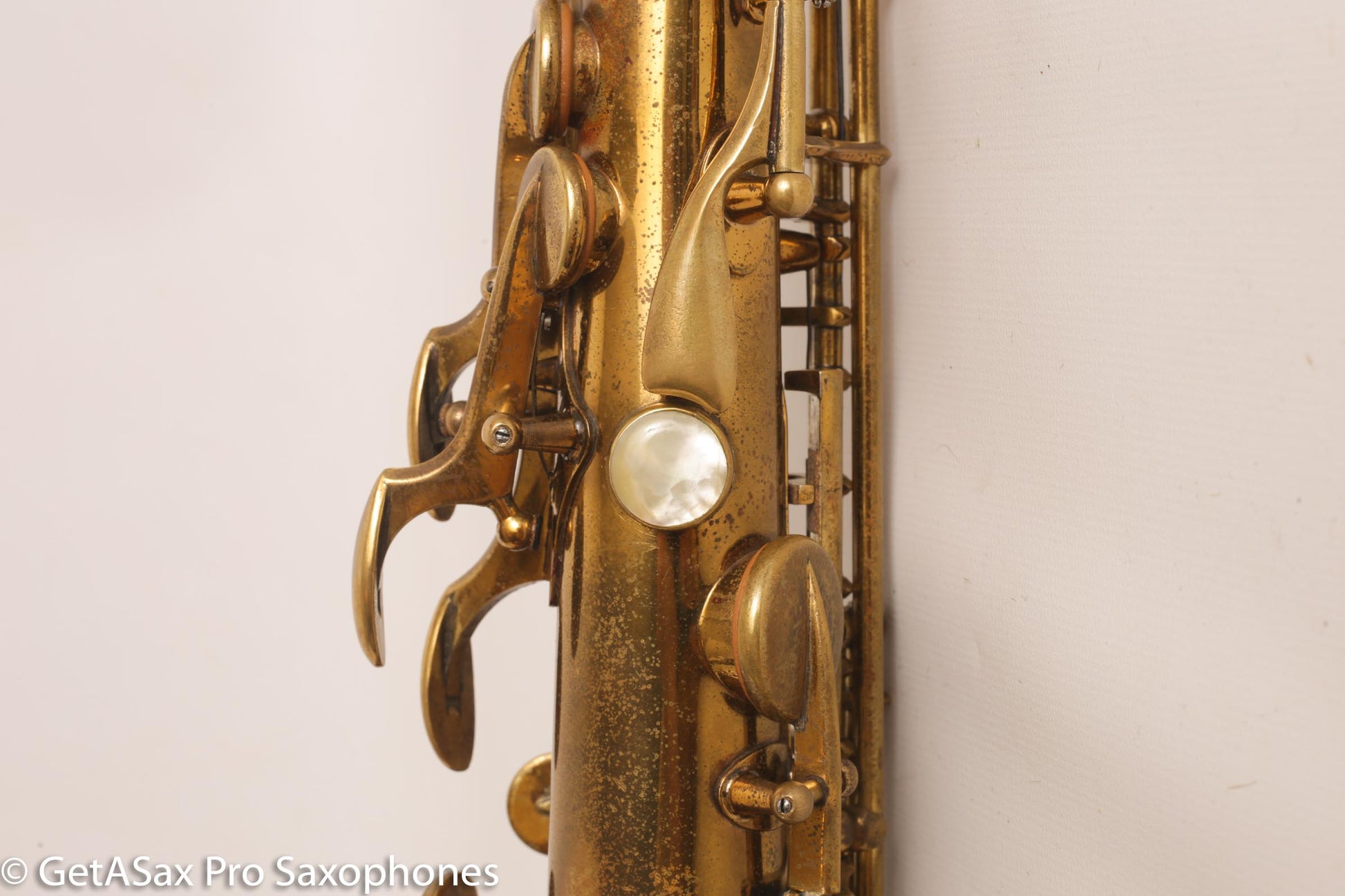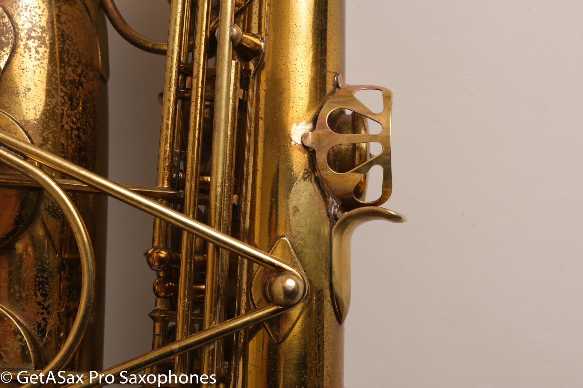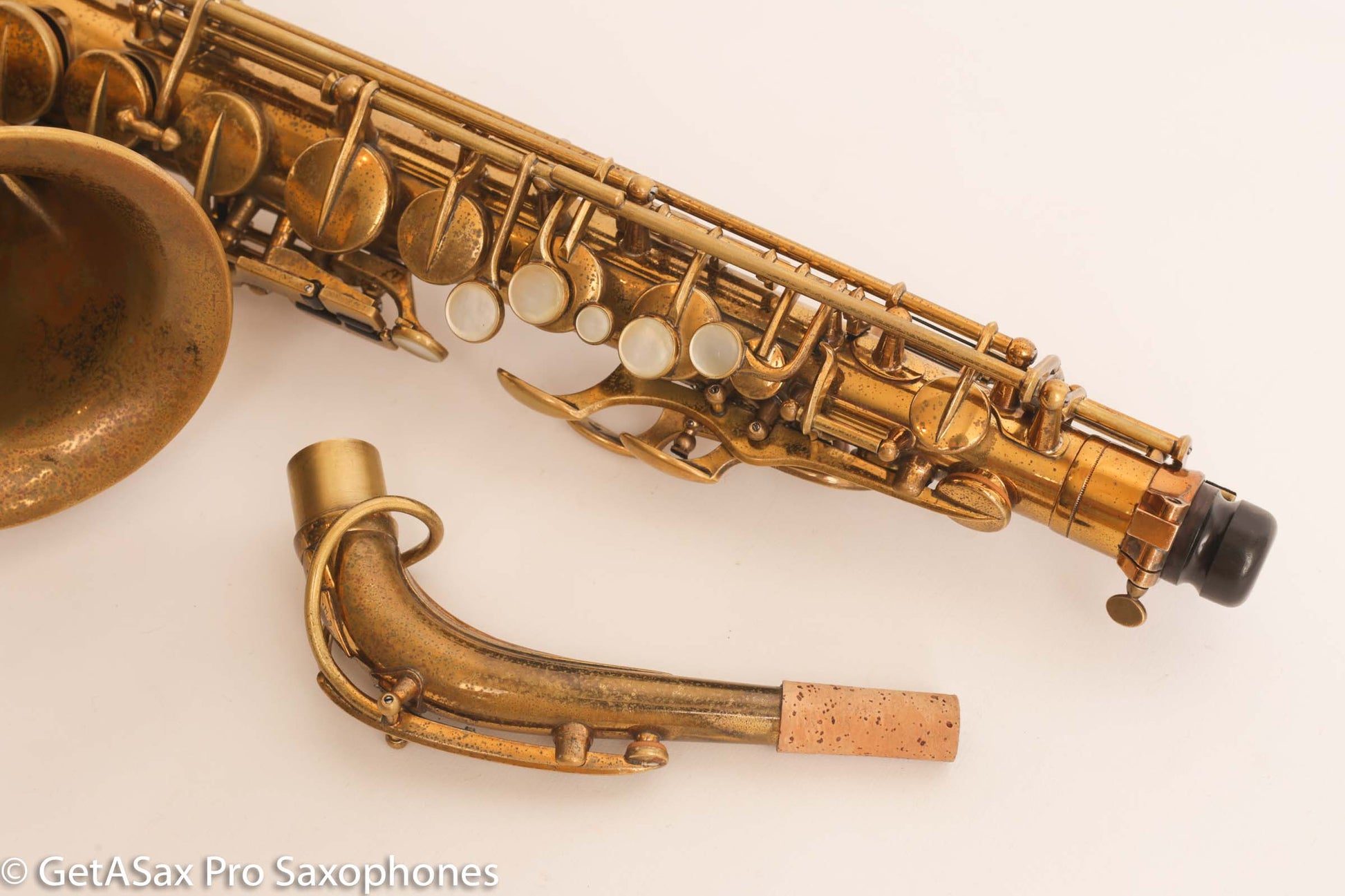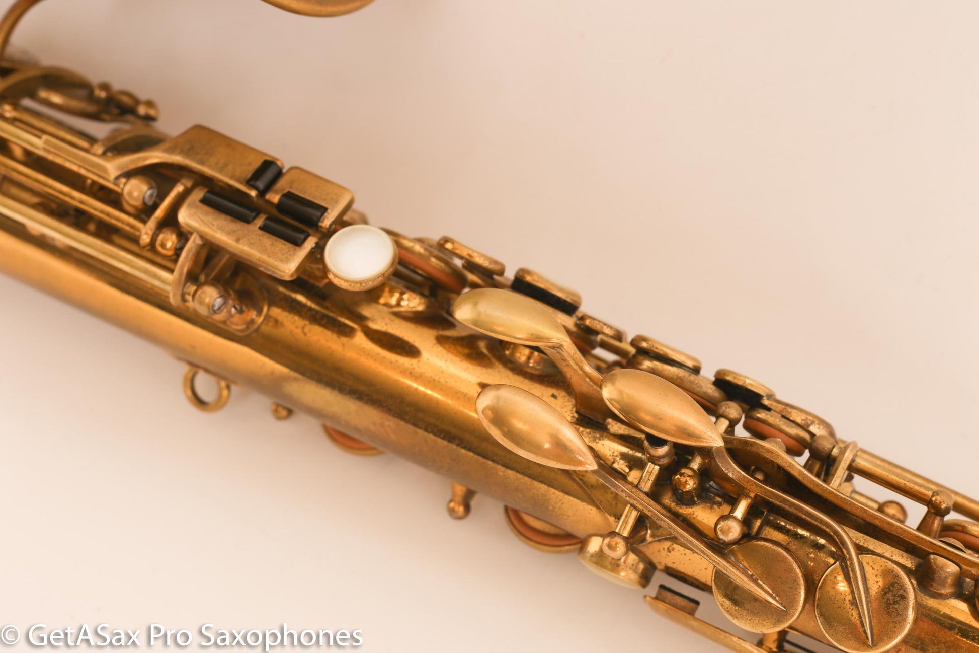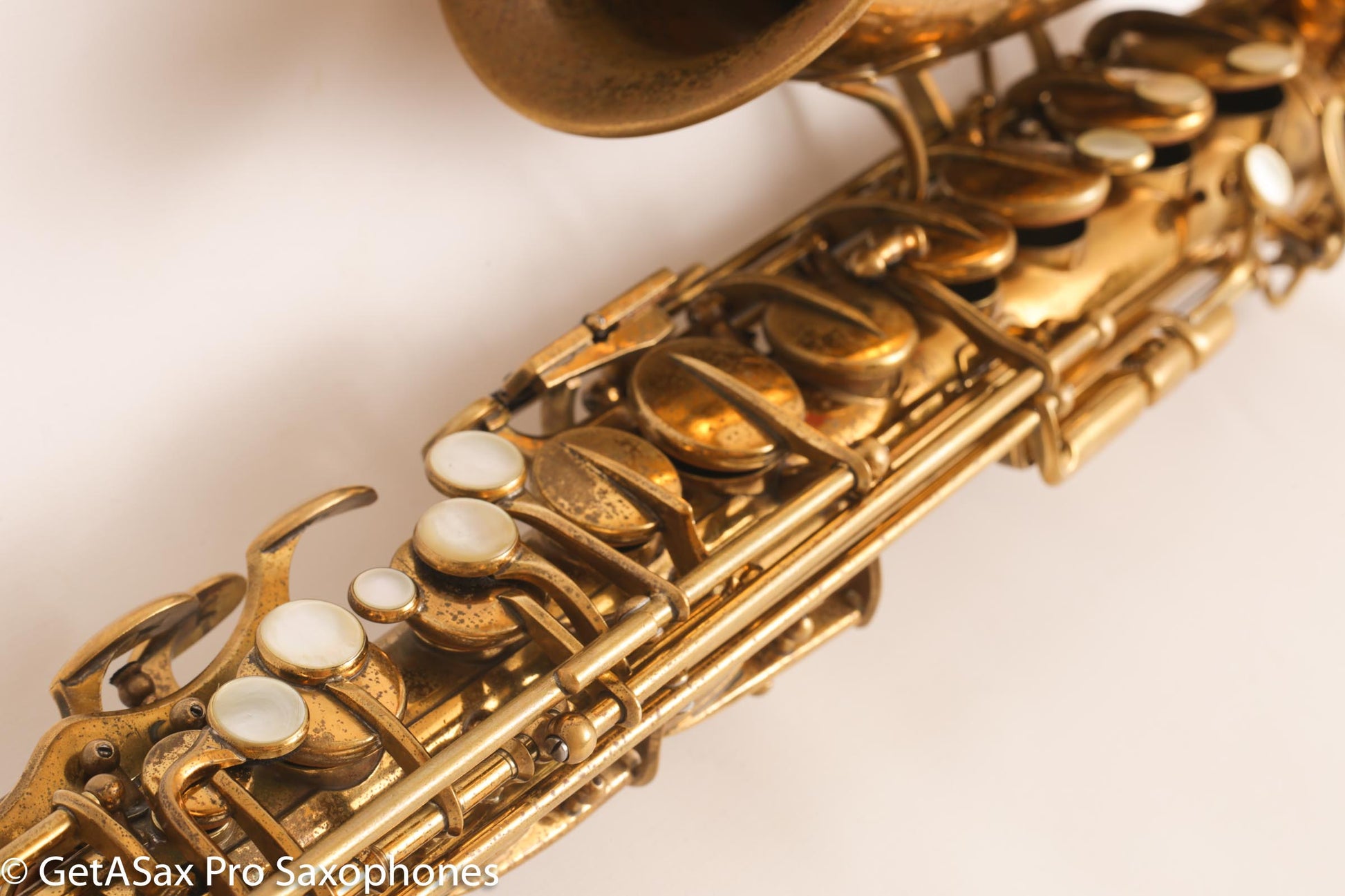 Just overhauled. Photos are before the overhaul. It looks a bit nicer now, and plays ridiculously well. It’s like the warmth and lyrical core of a Selmer Balanced Action, but with the wideness and power of a Conn 6M added in. Keywork is the older style, of course, so you can’t be too fussy about that. We just did a GS NY demo video quick preview with this exact alto, so you can hear it in action on an extremely precise copy of my favorite Meyer Bros NY alto piece in this demo clip. You can tell Tyler is a tenor player from the way he really pushes the horn with tons of air, but it doesn’t back down!