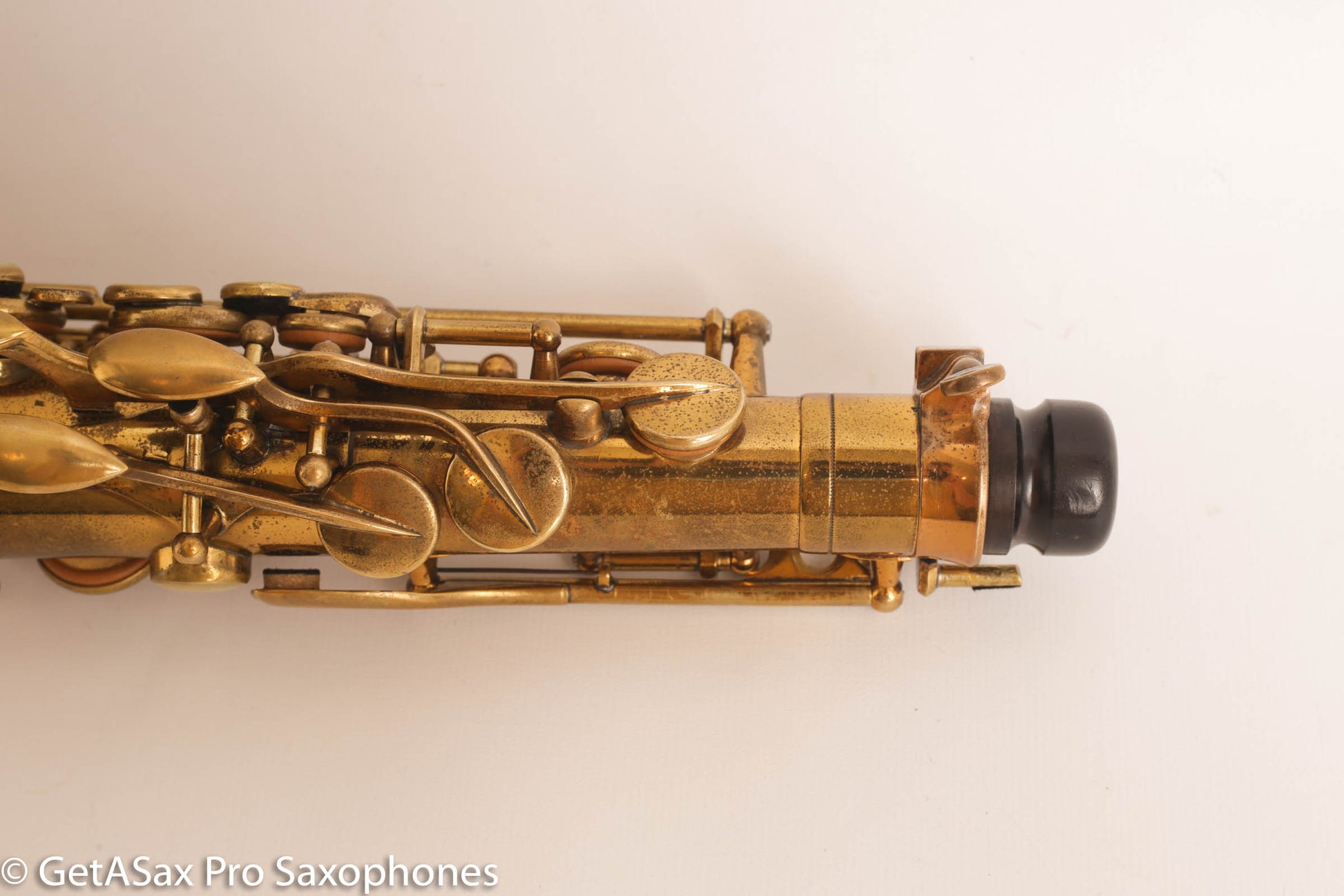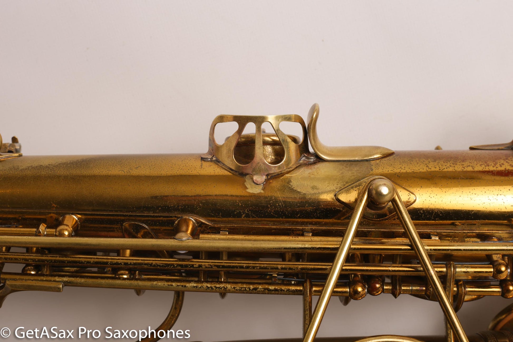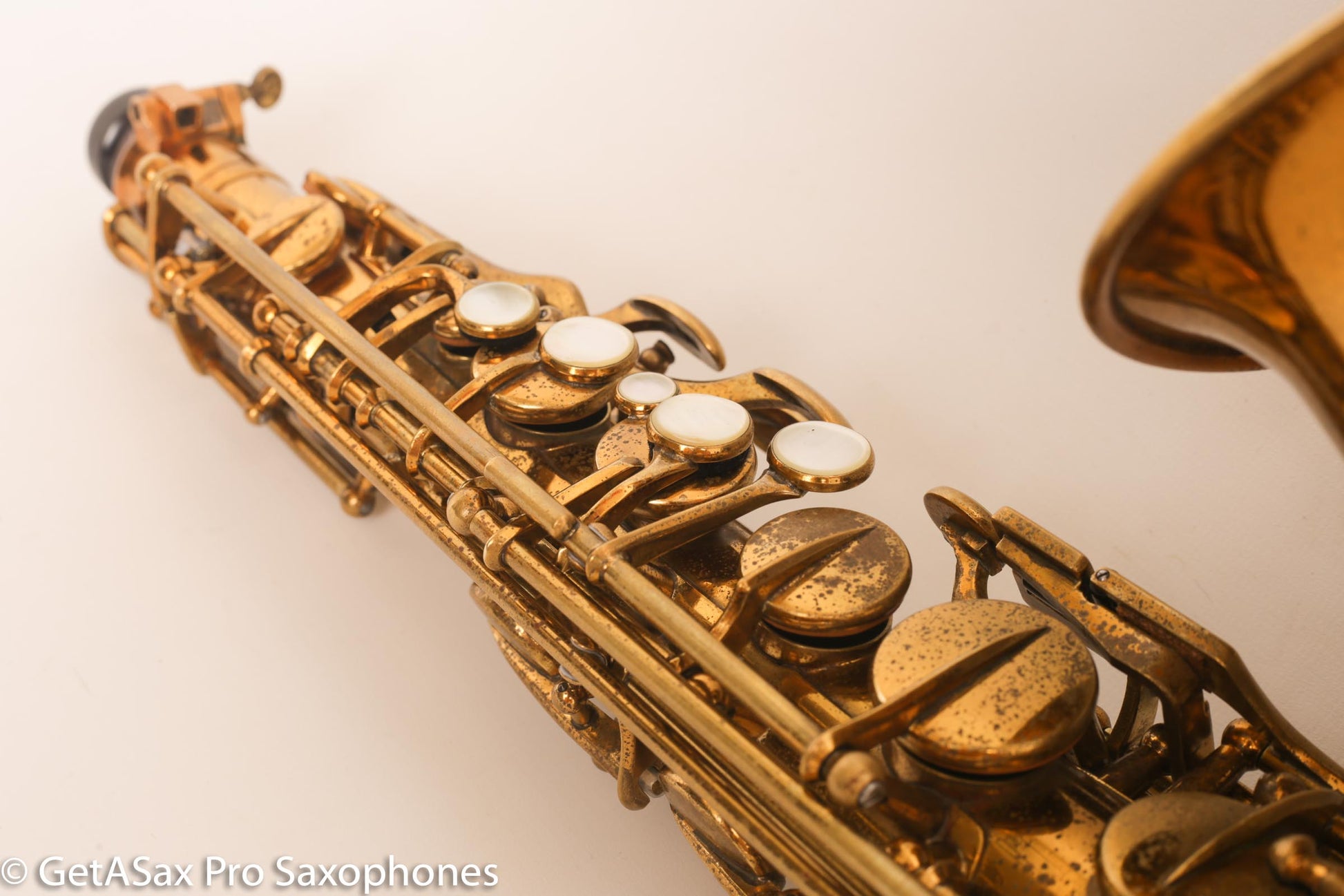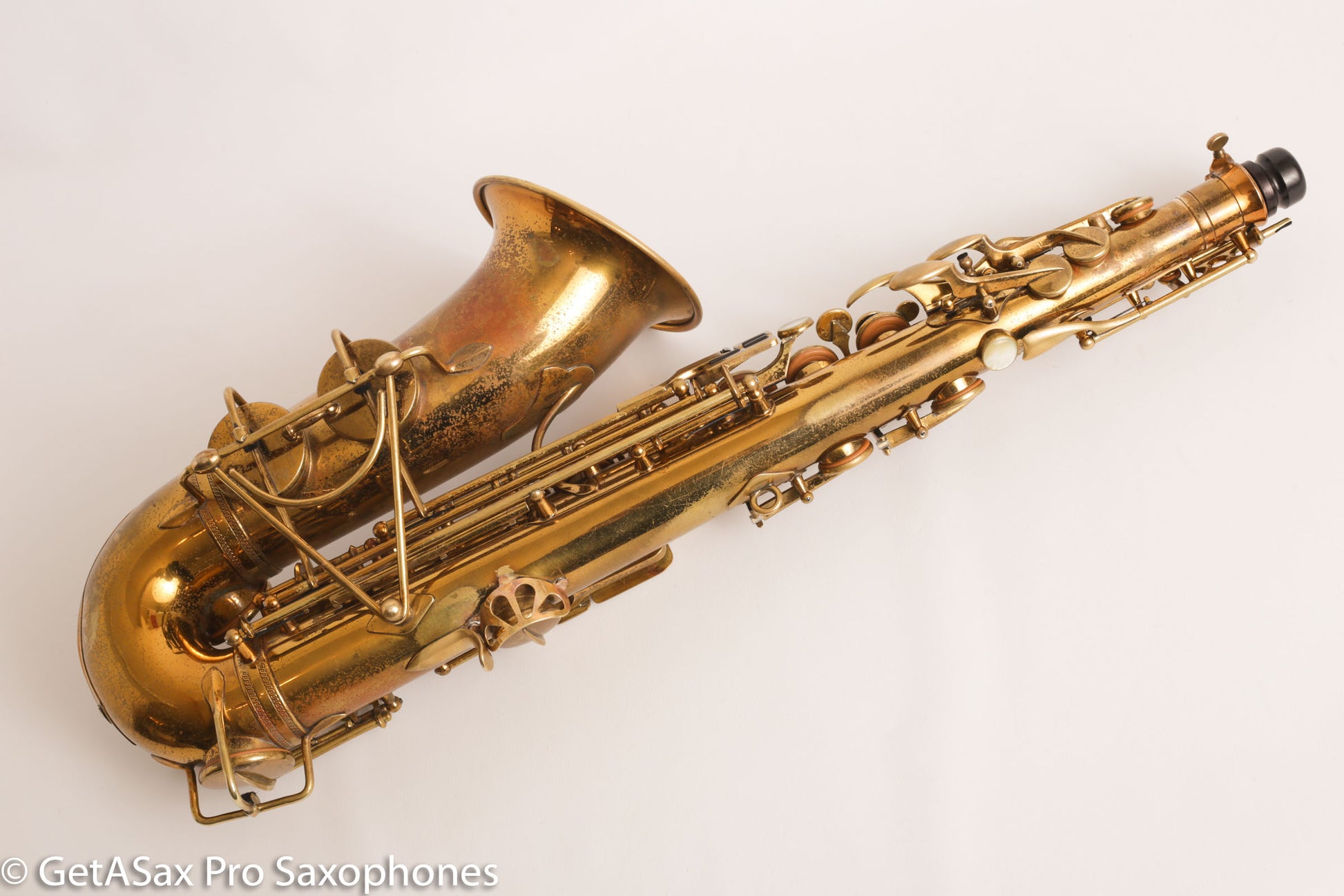 Just overhauled. Photos are before the overhaul. It looks a bit nicer now, and plays ridiculously well. It’s like the warmth and lyrical core of a Selmer Balanced Action, but with the wideness and power of a Conn 6M added in. Keywork is the older style, of course, so you can’t be too fussy about that. We just did a GS NY demo video quick preview with this exact alto, so you can hear it in action on an extremely precise copy of my favorite Meyer Bros NY alto piece in this demo clip. You can tell Tyler is a tenor player from the way he really pushes the horn with tons of air, but it doesn’t back down!