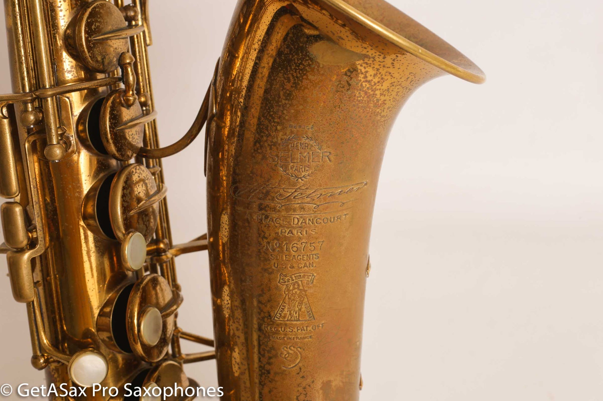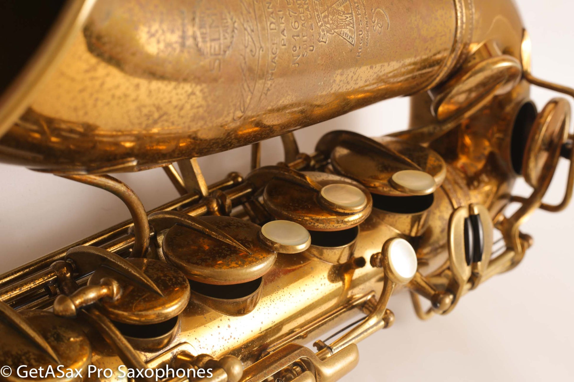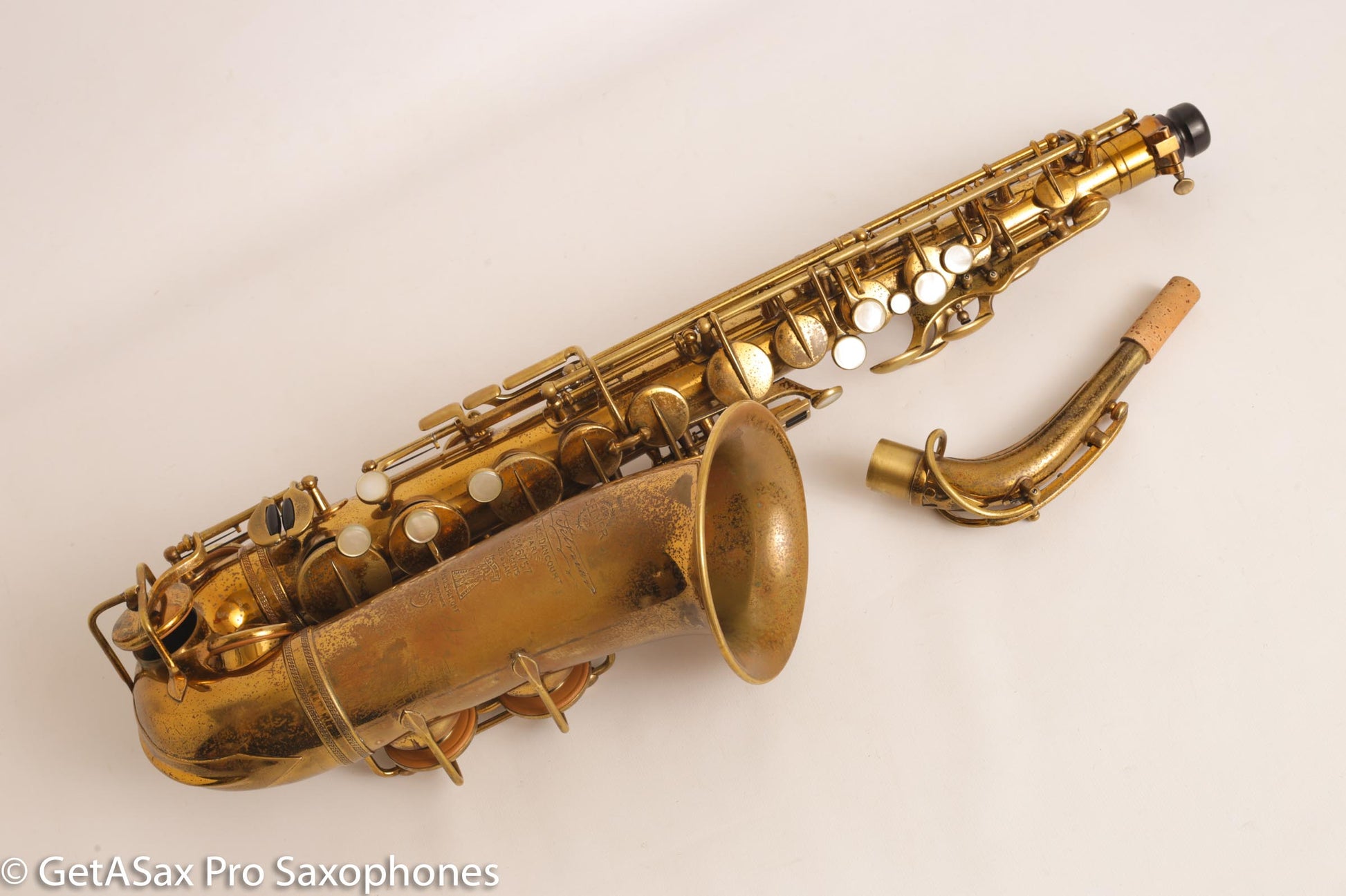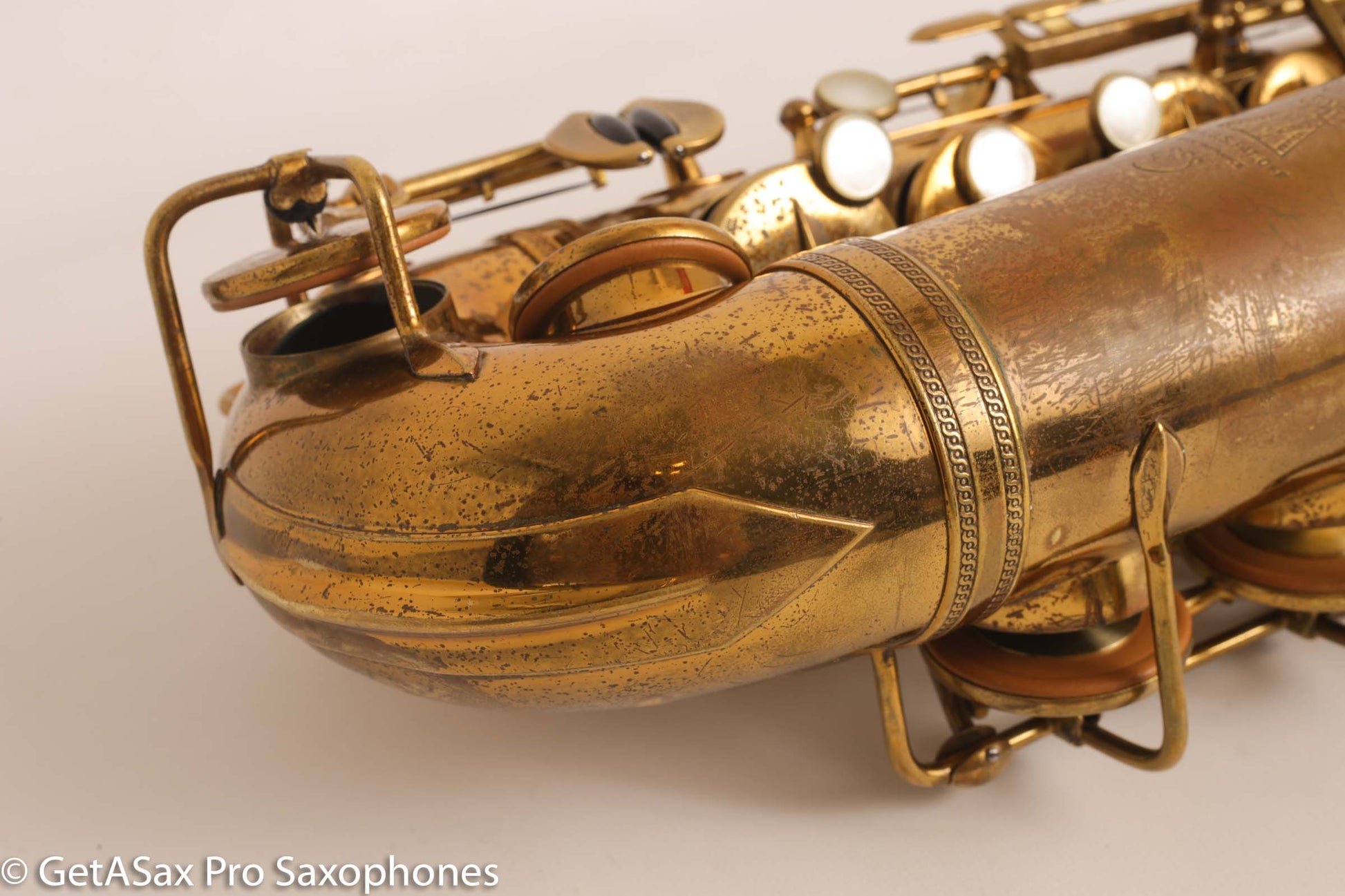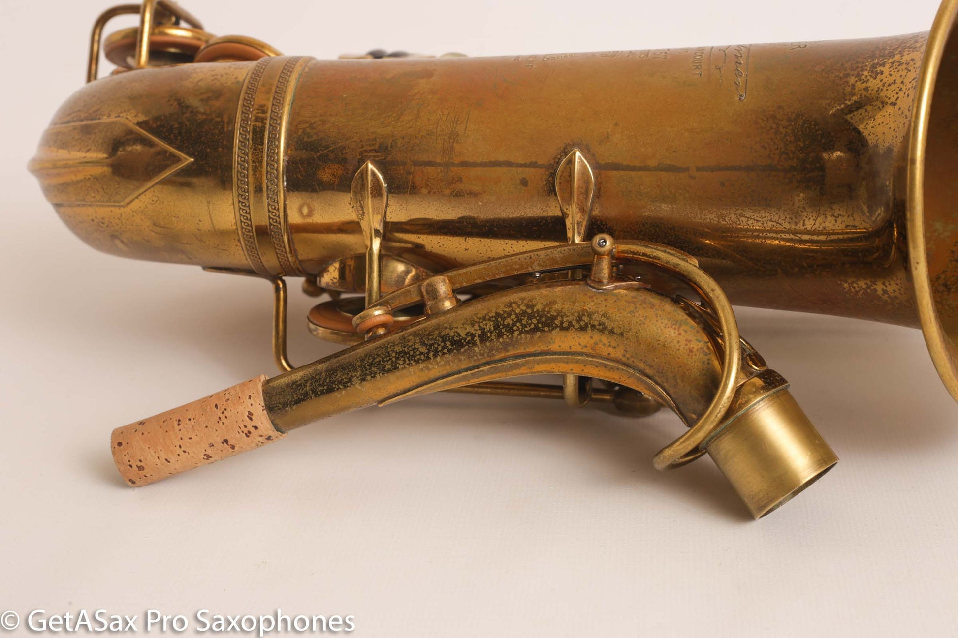 Just overhauled. Photos are before the overhaul. It looks a bit nicer now, and plays ridiculously well. It’s like the warmth and lyrical core of a Selmer Balanced Action, but with the wideness and power of a Conn 6M added in. Keywork is the older style, of course, so you can’t be too fussy about that. We just did a GS NY demo video quick preview with this exact alto, so you can hear it in action on an extremely precise copy of my favorite Meyer Bros NY alto piece in this demo clip. You can tell Tyler is a tenor player from the way he really pushes the horn with tons of air, but it doesn’t back down!