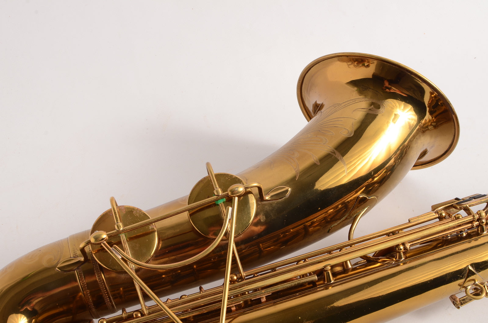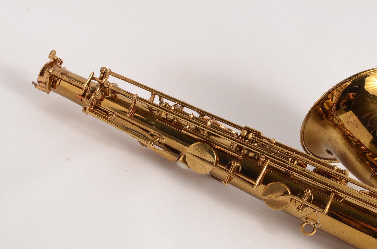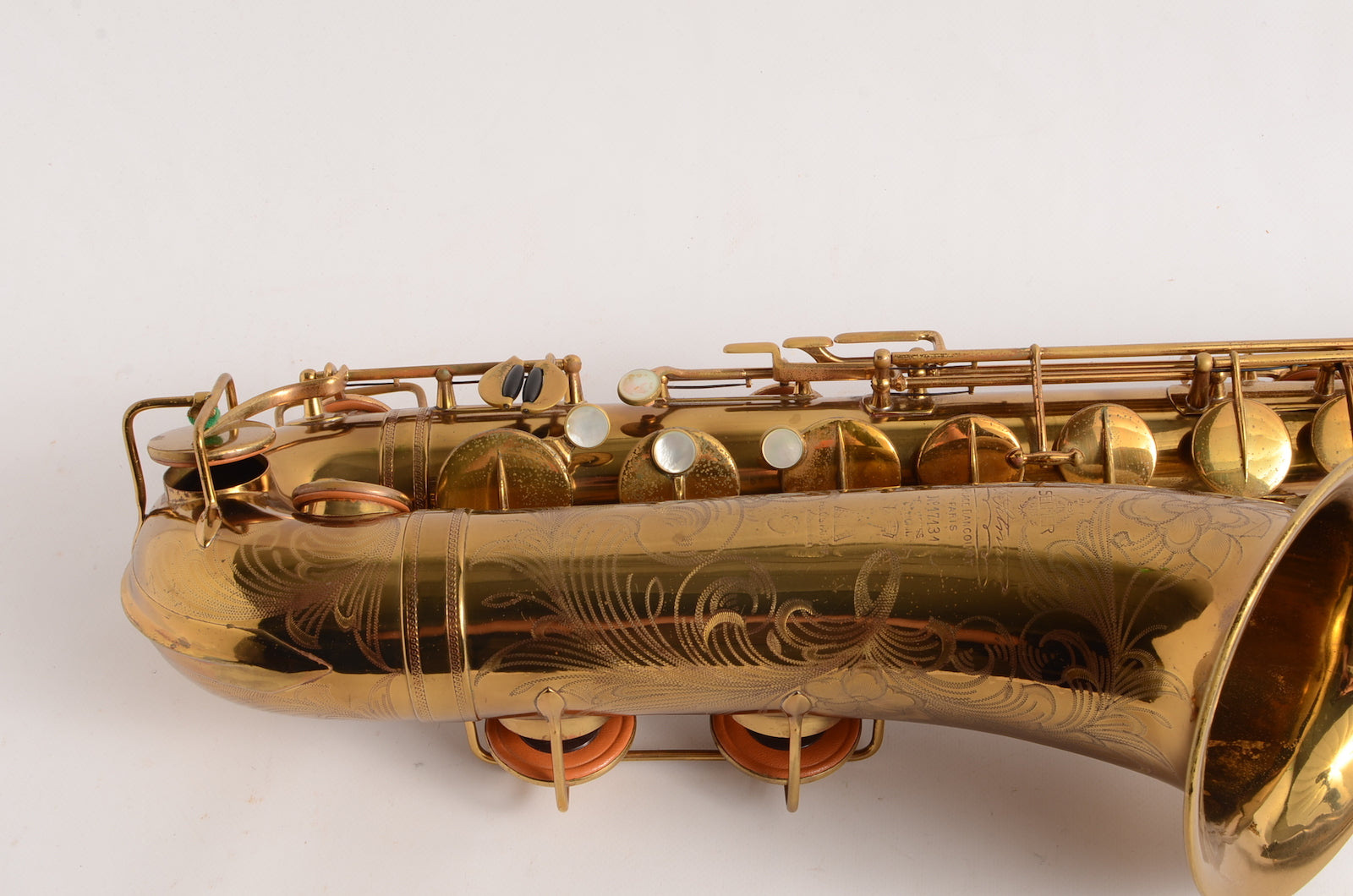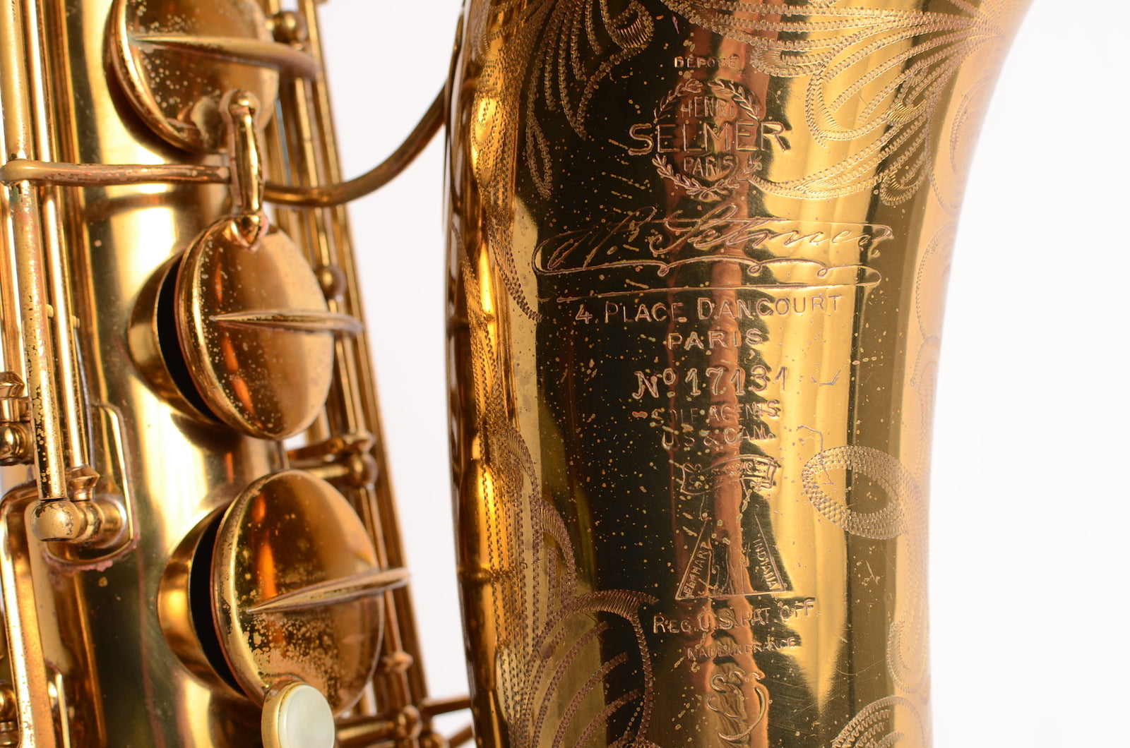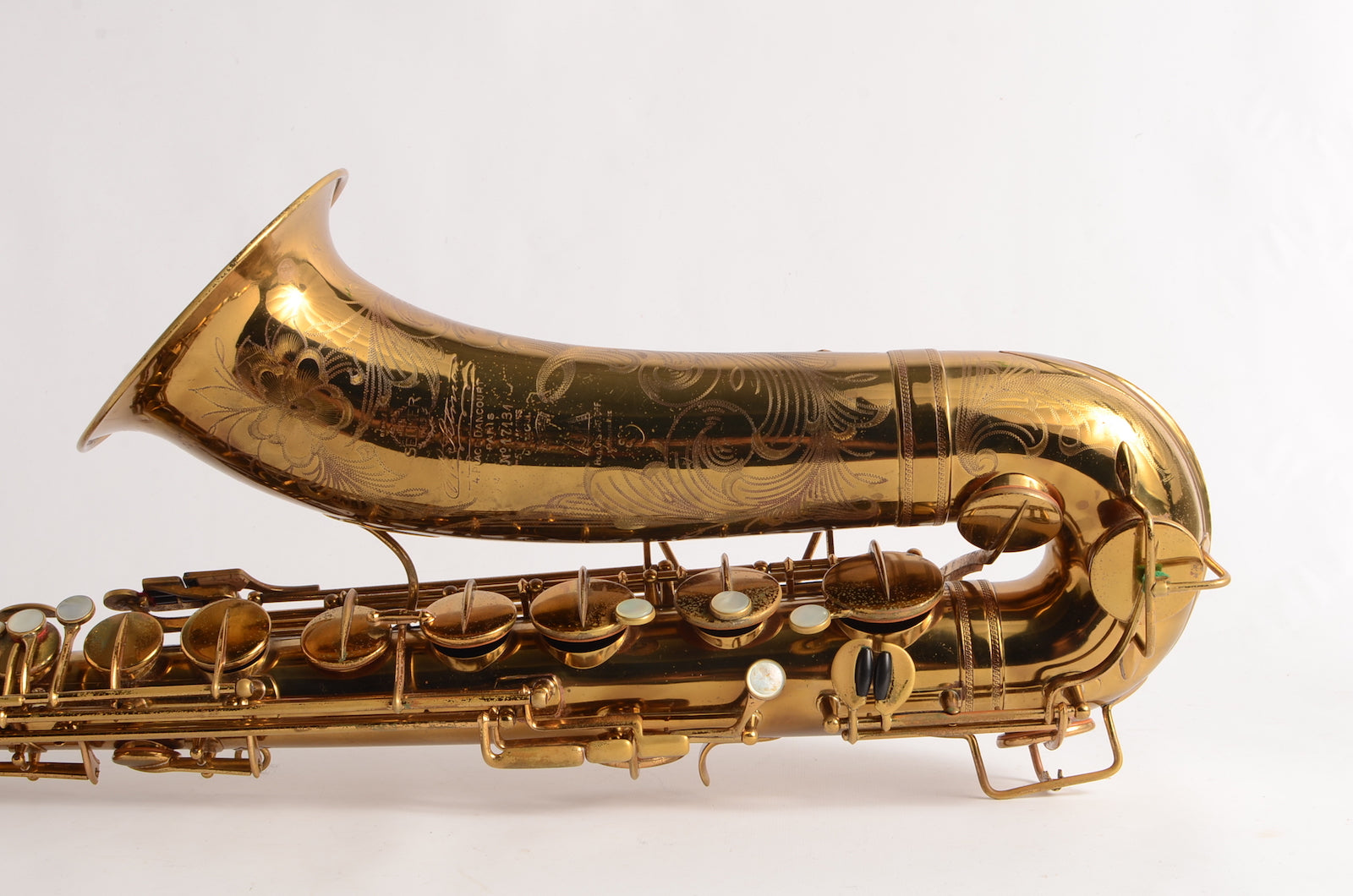 This is a horn to make any early Selmer enthusiast salivate. It's a gorgeous 17xxx (1933) Selmer Super Sax tenor in very fine condition with American-engraving. The neck looks great, body tube and bow look great. There was a small dent removed from the bell flare that is now looking good as well. The lacquer may be original, or it may not. It's hard to tell on Super Sax and Radio Improved Selmers, because they were lacquered after being engraved. (This is the opposite of how Balanced Action or SBA /Mark VI were finished.) This horn is priced low like it is not original, but the engraving is super sharp and the lacquer is the right color to be original. Either way, it is a great deal. Needs an overhaul.