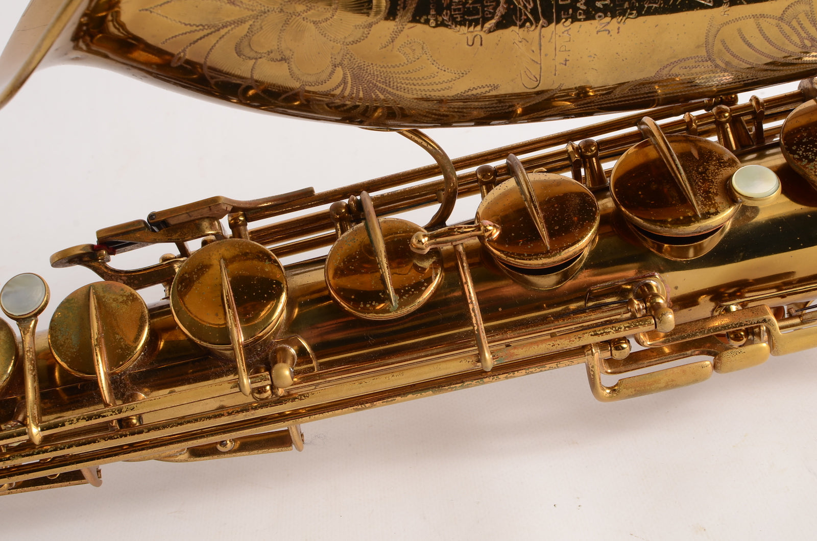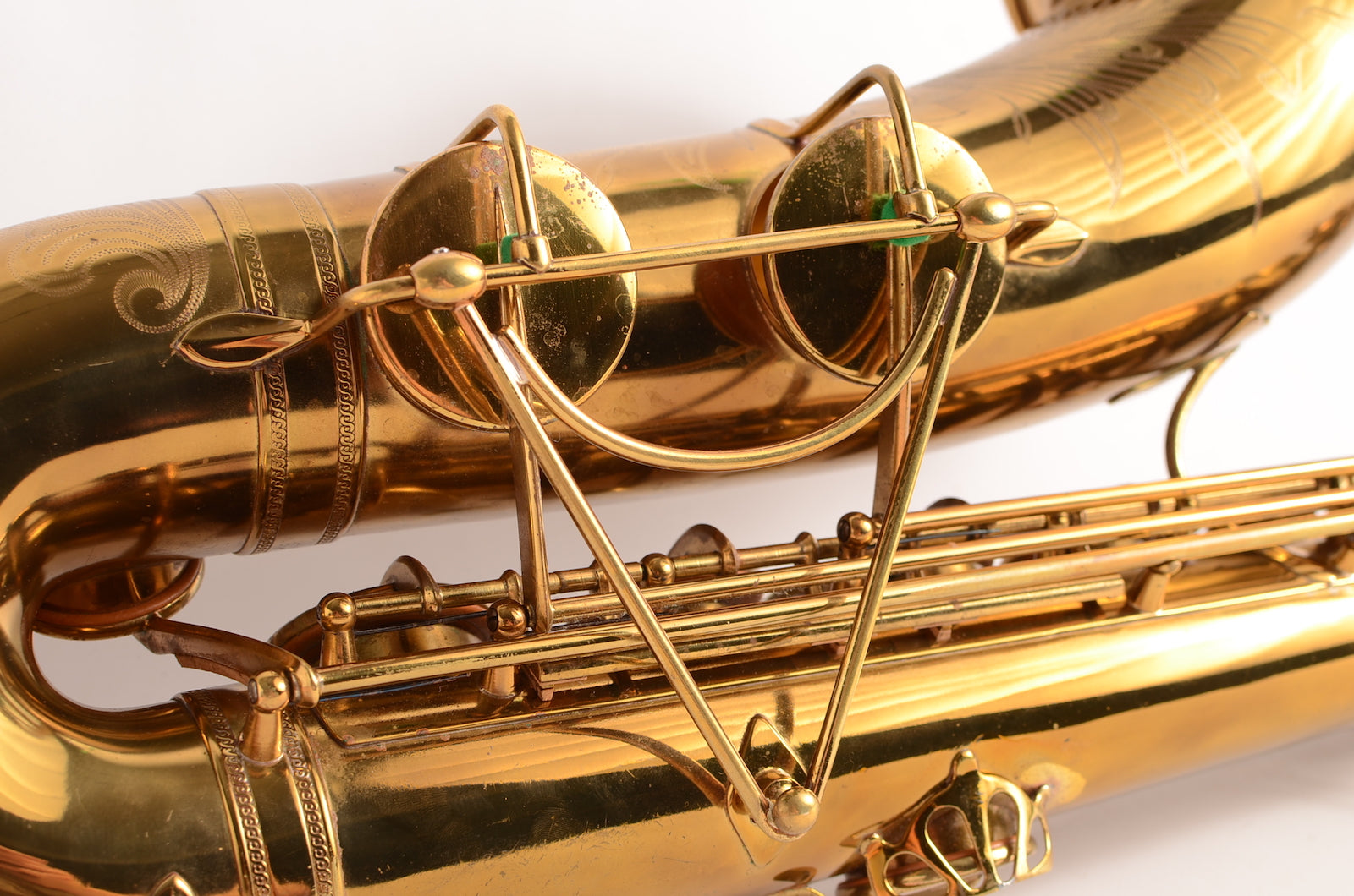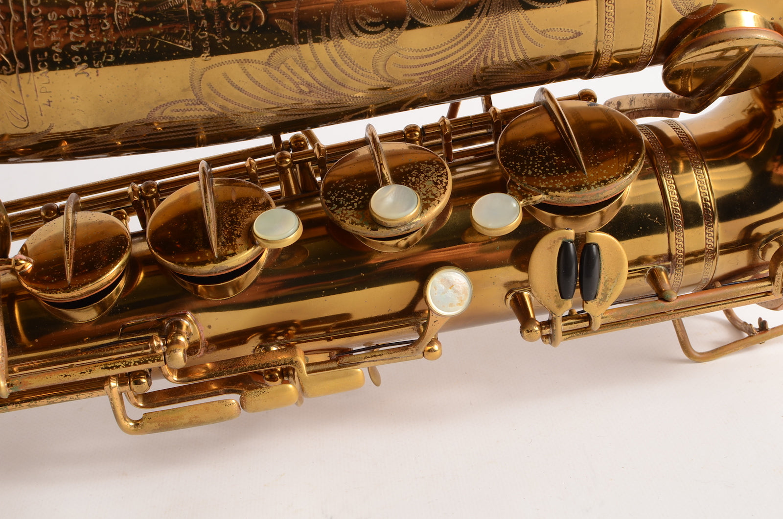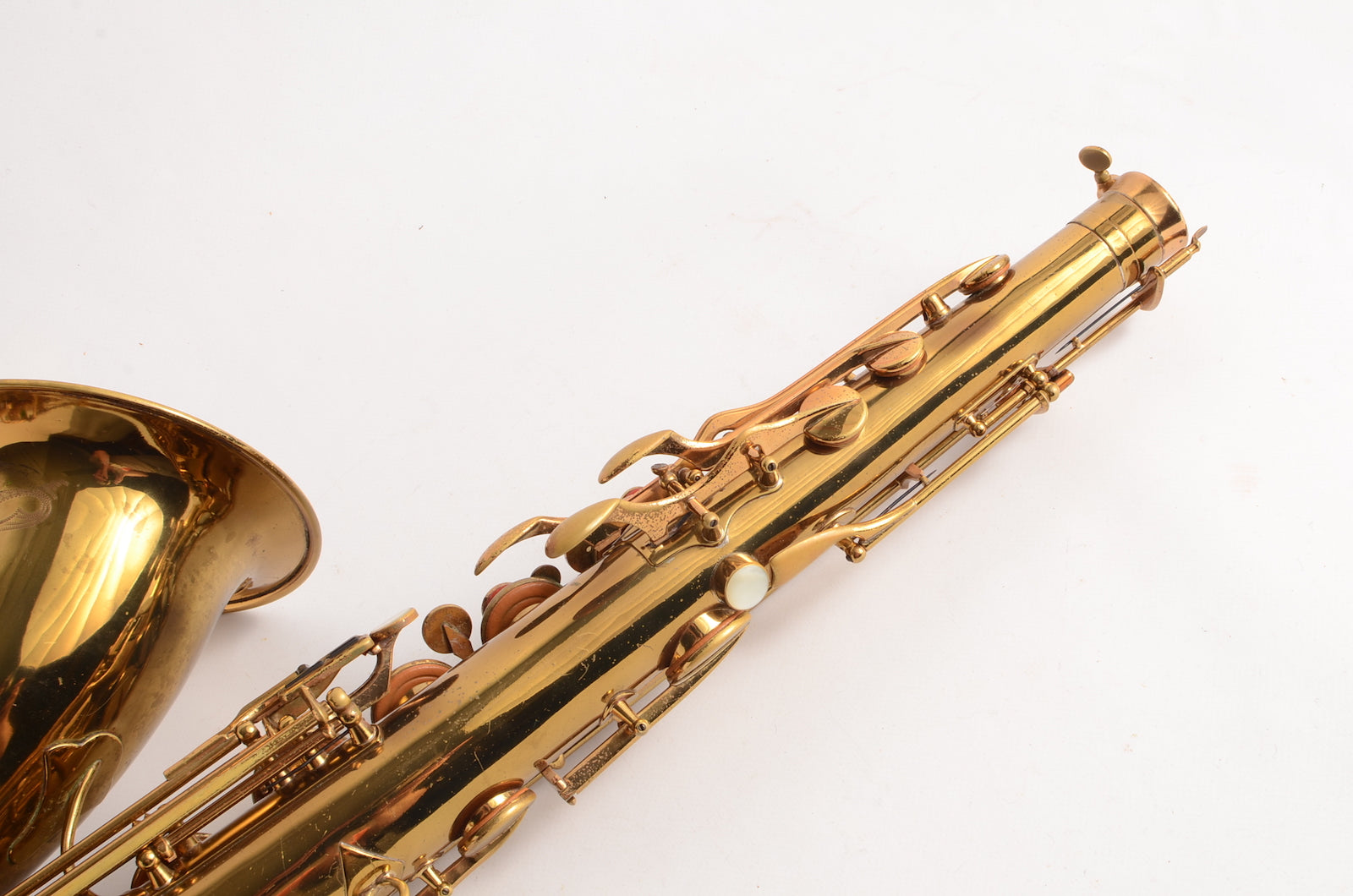 This is a horn to make any early Selmer enthusiast salivate. It's a gorgeous 17xxx (1933) Selmer Super Sax tenor in very fine condition with American-engraving. The neck looks great, body tube and bow look great. There was a small dent removed from the bell flare that is now looking good as well. The lacquer may be original, or it may not. It's hard to tell on Super Sax and Radio Improved Selmers, because they were lacquered after being engraved. (This is the opposite of how Balanced Action or SBA /Mark VI were finished.) This horn is priced low like it is not original, but the engraving is super sharp and the lacquer is the right color to be original. Either way, it is a great deal. Needs an overhaul.