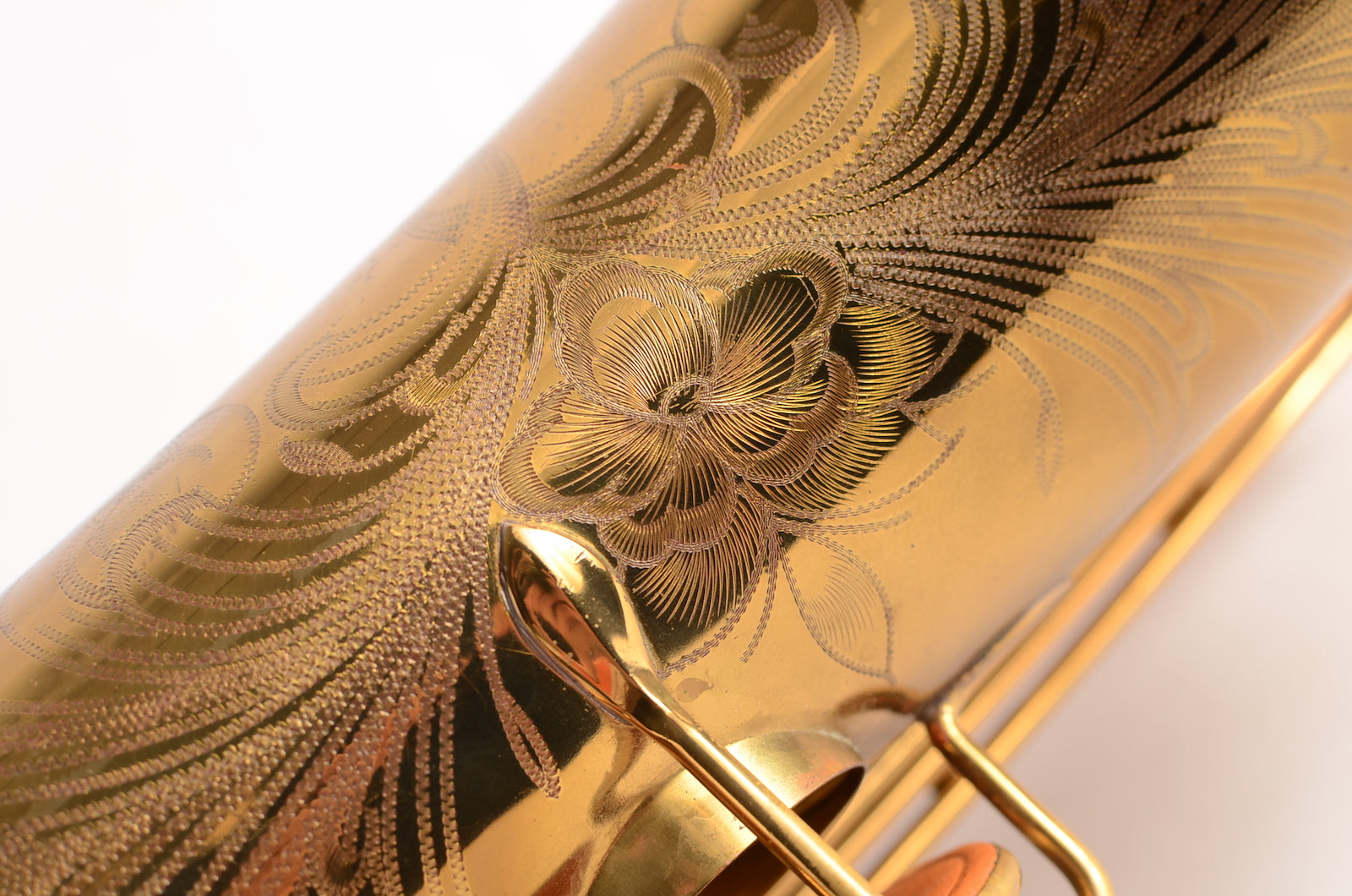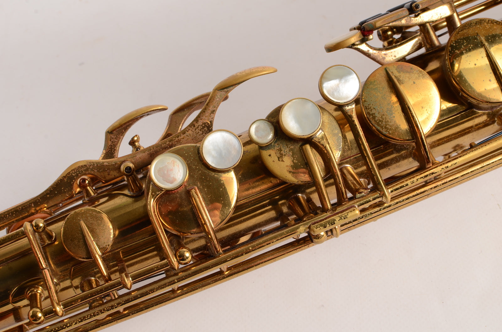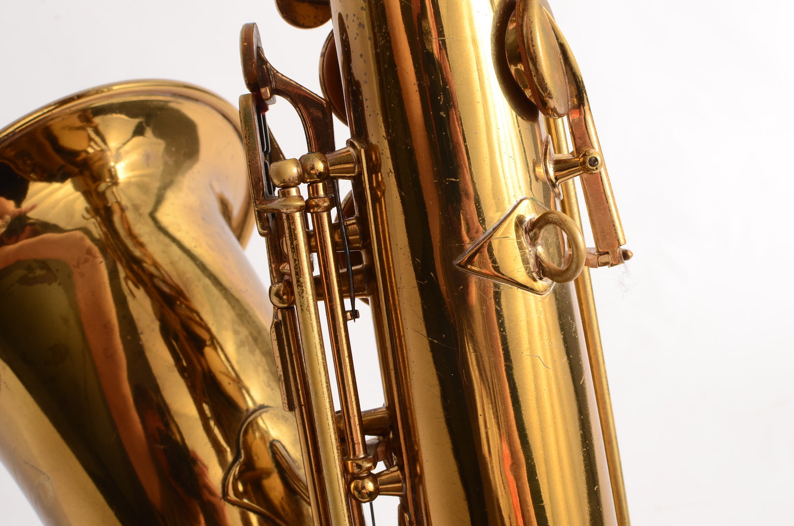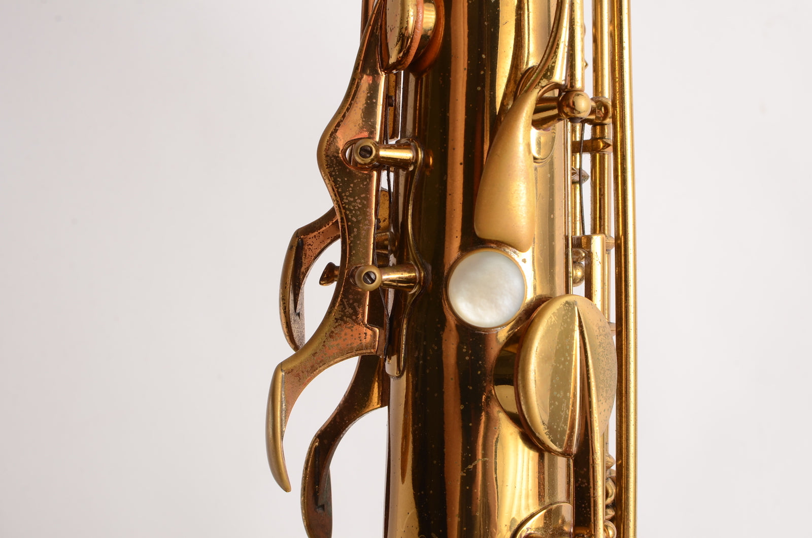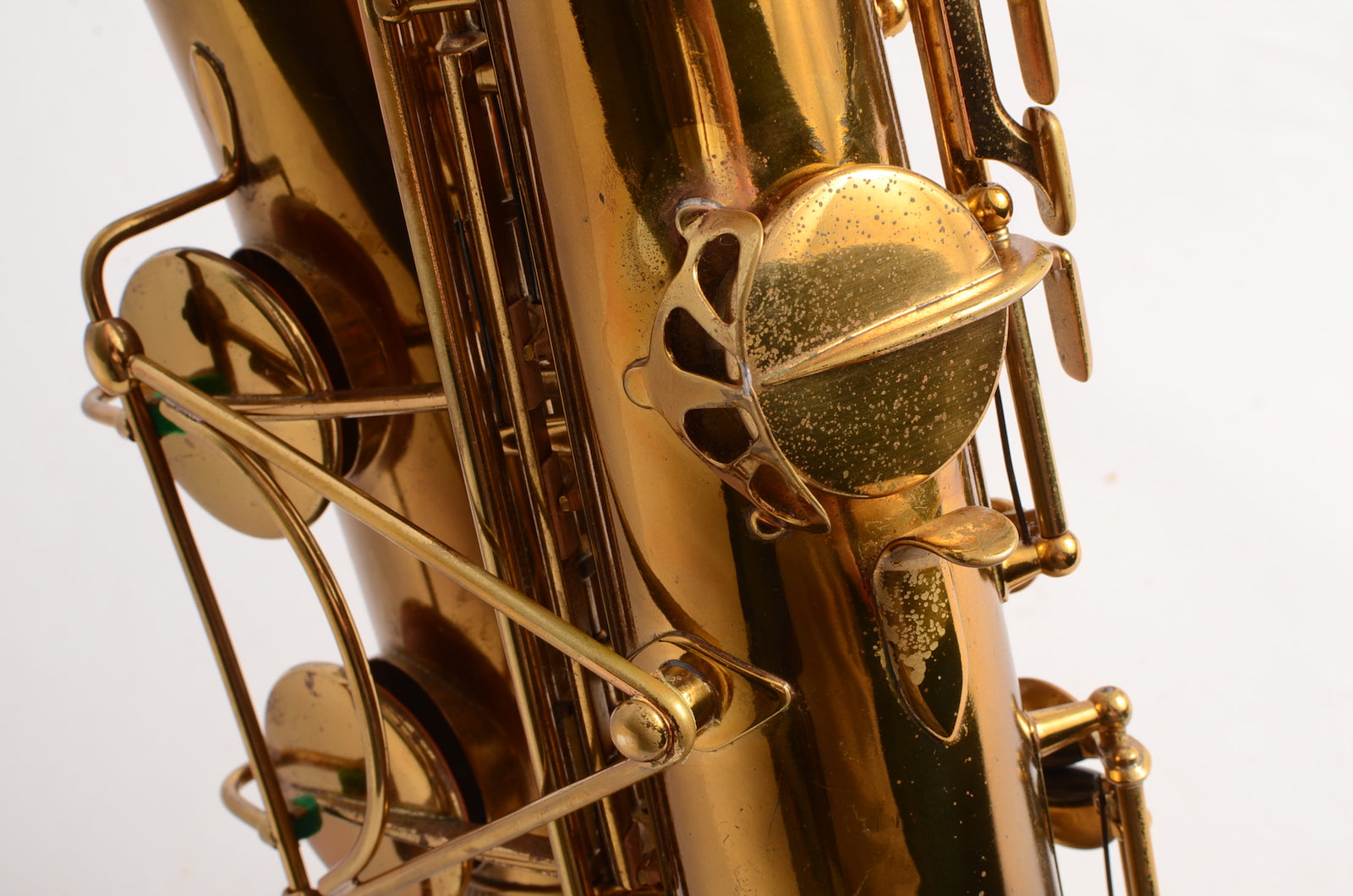 This is a horn to make any early Selmer enthusiast salivate. It's a gorgeous 17xxx (1933) Selmer Super Sax tenor in very fine condition with American-engraving. The neck looks great, body tube and bow look great. There was a small dent removed from the bell flare that is now looking good as well. The lacquer may be original, or it may not. It's hard to tell on Super Sax and Radio Improved Selmers, because they were lacquered after being engraved. (This is the opposite of how Balanced Action or SBA /Mark VI were finished.) This horn is priced low like it is not original, but the engraving is super sharp and the lacquer is the right color to be original. Either way, it is a great deal. Needs an overhaul.