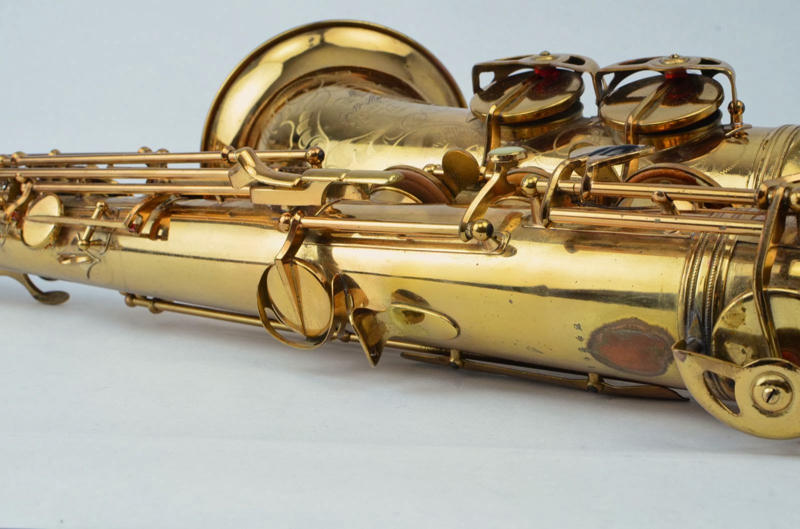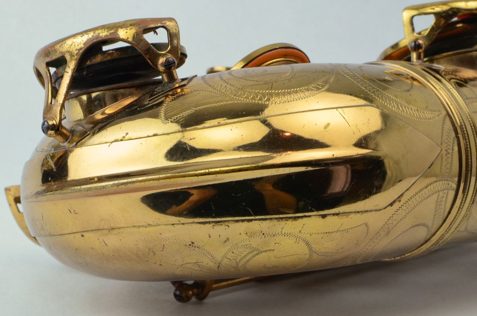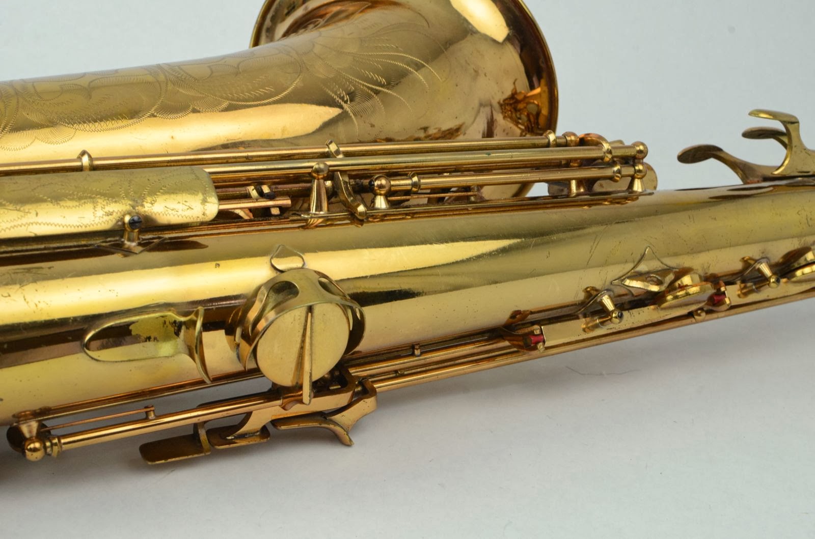 This is a beautiful rolled tone holes Gold Medal tenor that has fancy deluxe engraving including inside the bell. The original lacquer on the horn body is a beautiful rose gold color, and the neck either aged differently (you see this on Buffet's sometimes) or was relacquered at some point to a honey gold color (though the neck is slightly darker, not lighter, than the horn, so go figure.). As for the rest of the horn, there are some small dents in the back of the bow that are getting removed, the bell flare has a crease that was removed, and the low Eb key cage leg was resoldered. This horn has not been played much, and it shows minimal play wear. It was a one-owner saxophone and sat in the closet for most of its life. It comes in a nice, new Protec XL tenor case, which costs around $175. The pads are older, so plan on a repad or at least replacing several pads. If I have time, I'll get this done myself and sell this baby with a fresh overhaul. These horns have the biggest, darkest tone and really play great.