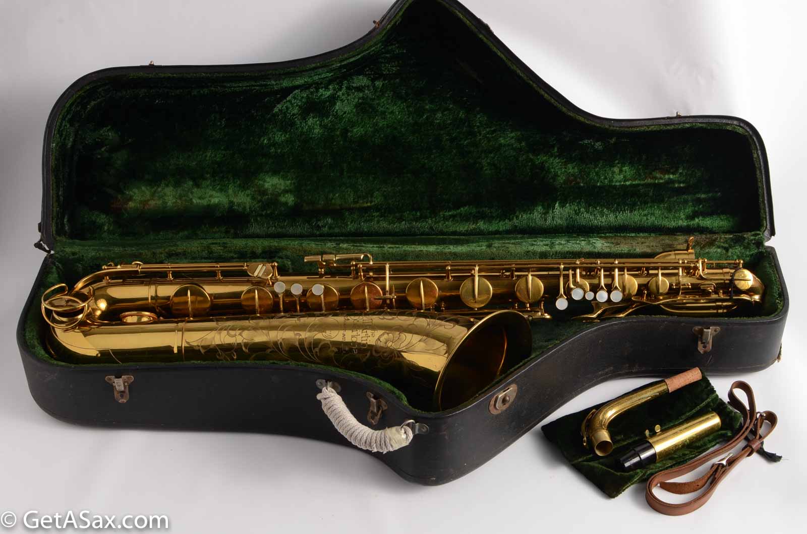 This horn includes the beautiful original case, original neck with matching serial number 187812 from 1955, and even the original Martin baritone mouthpiece, which I had not seen before.