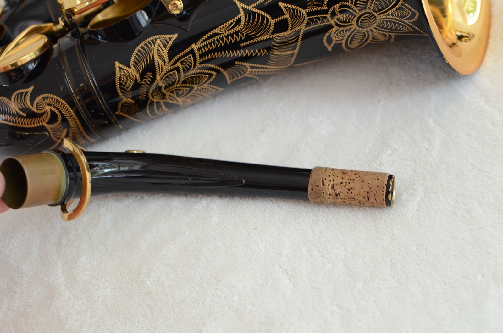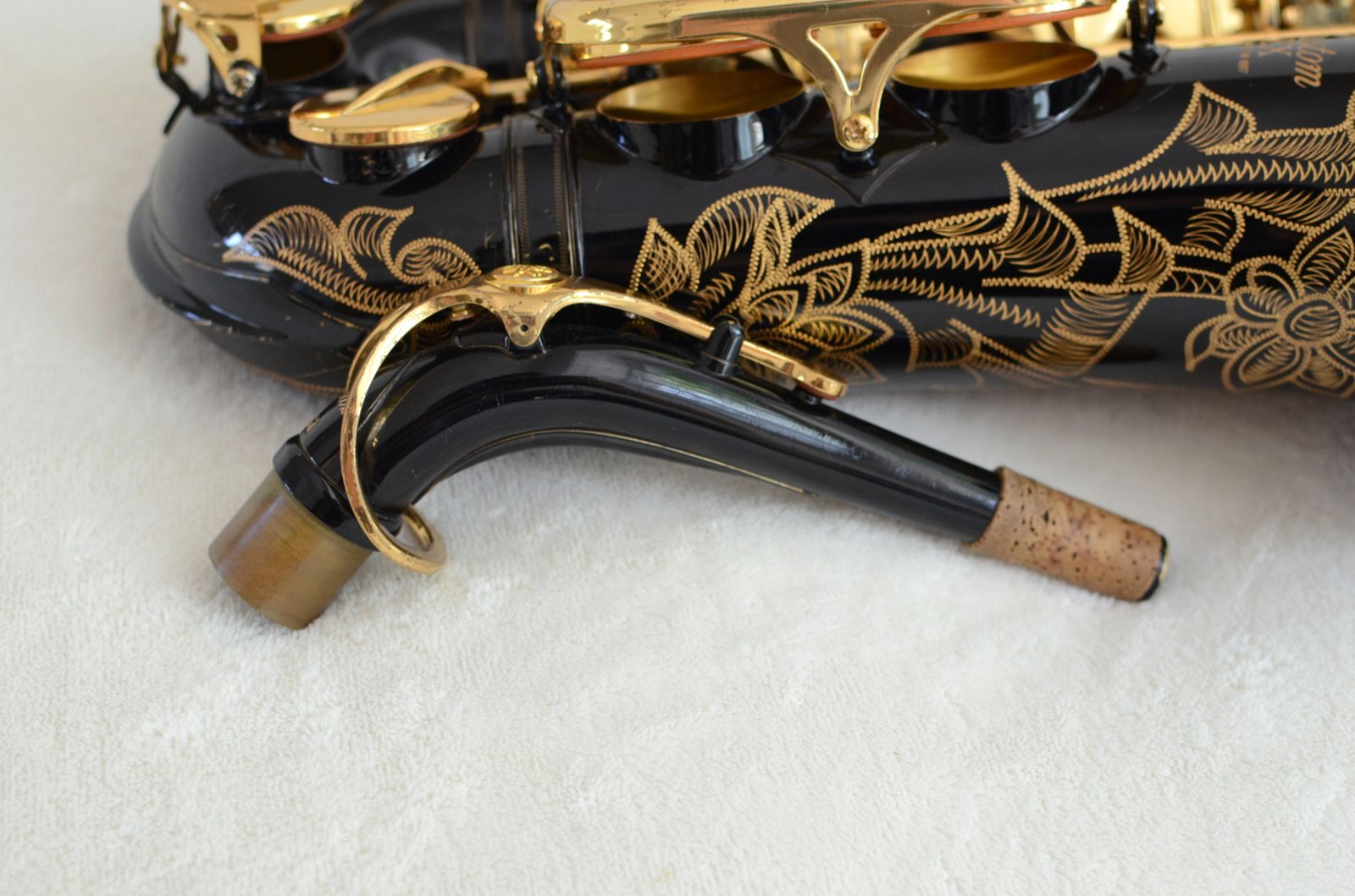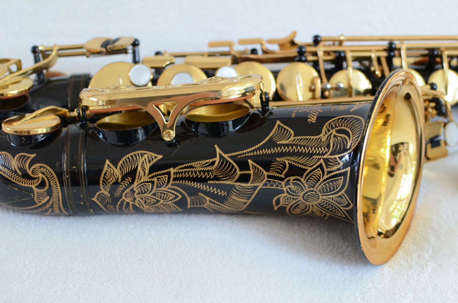 This particular horn came from a very good pro saxophone player and teacher who used this horn for classical and jazz playing in studio settings. It has been very carefully maintained since it was new, and there is only one small dent inside the bell which is only a minor cosmetic factor and makes no difference whatsoever to sound. The black lacquer is gorgeous and besides some light scratches in a couple of places, it is almost all there. The pads are in great condition and this horn is totally setup and ready to go as is. It plays wonderfully with a clear, round sound that is medium bright and flexible, depending on what mouthpiece you use. Get it before it is gone! Because demand is high, these horns tend to sell quickly (and are also easy to re-sell down the road, should you ever want to.)
