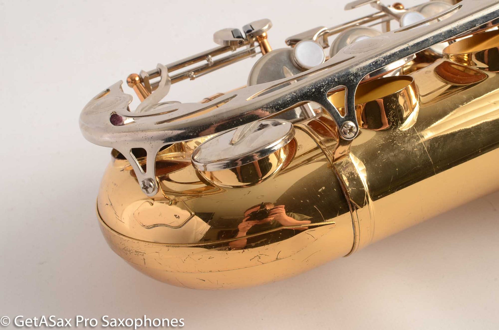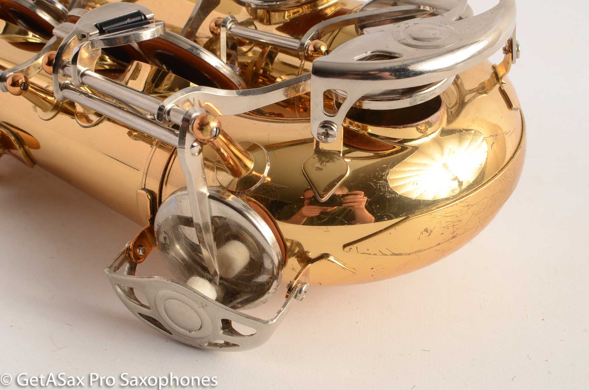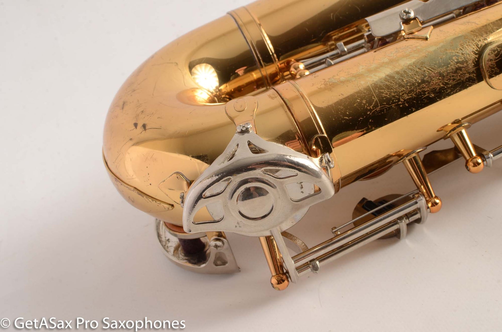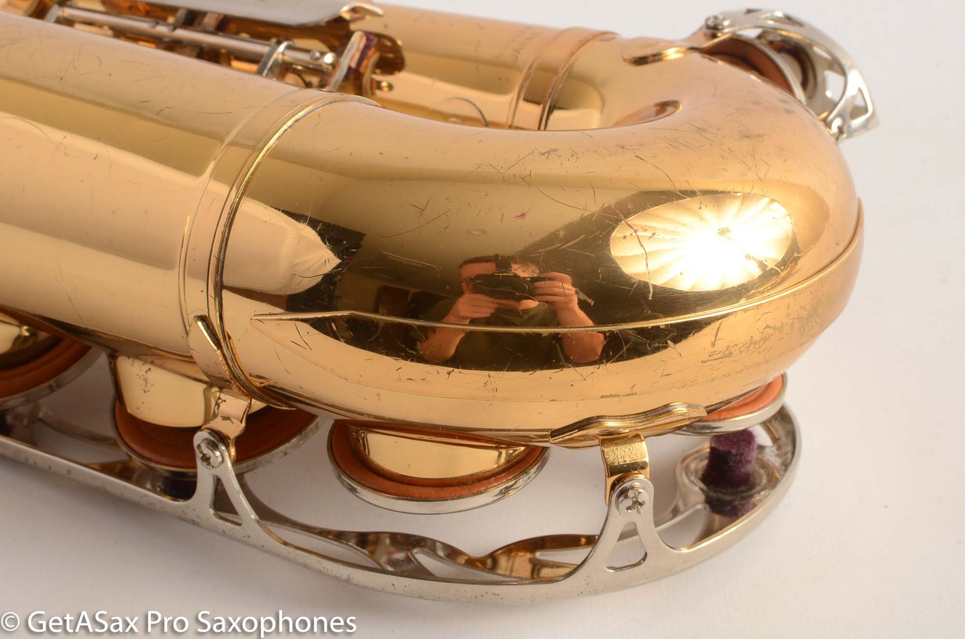 This alto just got a bunch of new pads and is now playing quite well, with an easy low register, and a nicely in tune scale. It includes all the stuff in the photos, and I can throw in a Yamaha 4C or help you pick a good beginner mouthpiece to go with it. (Mouthpiece is important.)