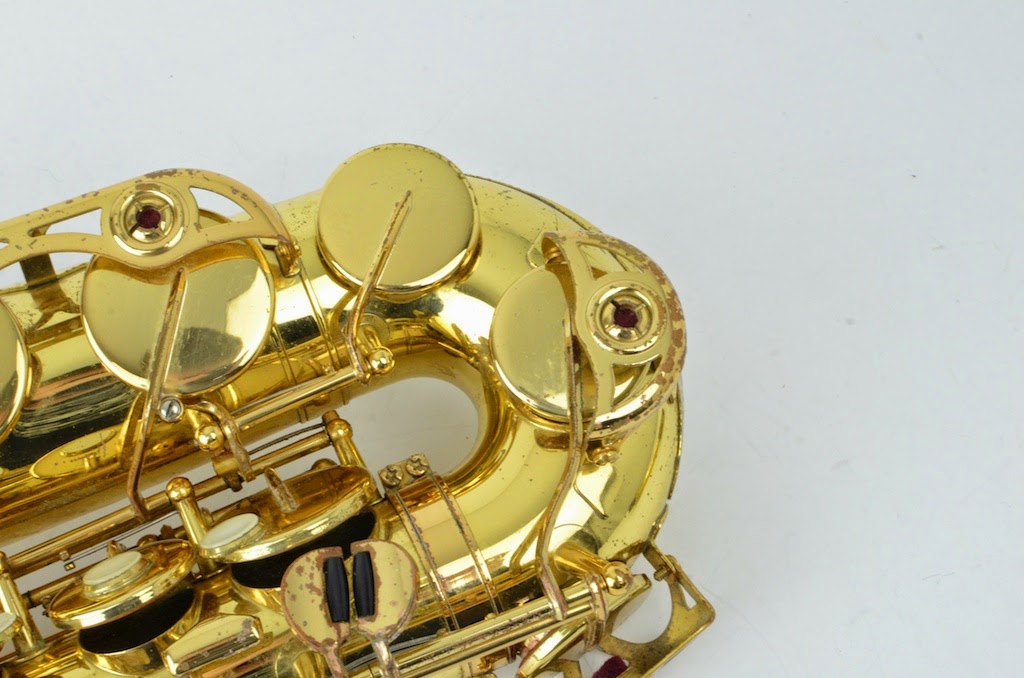 Here's an early Yamaha 475 alto, which is actually a surprisingly good alto. It looks like it was made with the tooling for the original version of the professional Yamaha purple logo 62, so it's a good deal for the money. (The soprano 475 of this is a real sleeper by the way - basically a purple logo 62 soprano for cheap!) This horn needs a repad, and it would be a perfect repad project for someone who is interested in doing a first repad, because it's a Yamaha - it comes apart and goes back together easily, the keywork is modern and has no surprises, it's well made etc. It has some moderate lacquer wear from use, and it has had a couple of dents removed to make it an easier project for someone (one from the back of the bow, and one from the bell flare). This includes the original case in good condition. It's way way better than your standard Chinese or Taiwanese student saxophone - it's more like a pro horn in disguise. This would be perfect for someone who doubles on alto, needs a gigging alto, or a student who needs a good alto to grow into, but who has a tight budget. As long as you have a local music store to put some pads in, you can get a good horn for a great price that should serve you well for years.