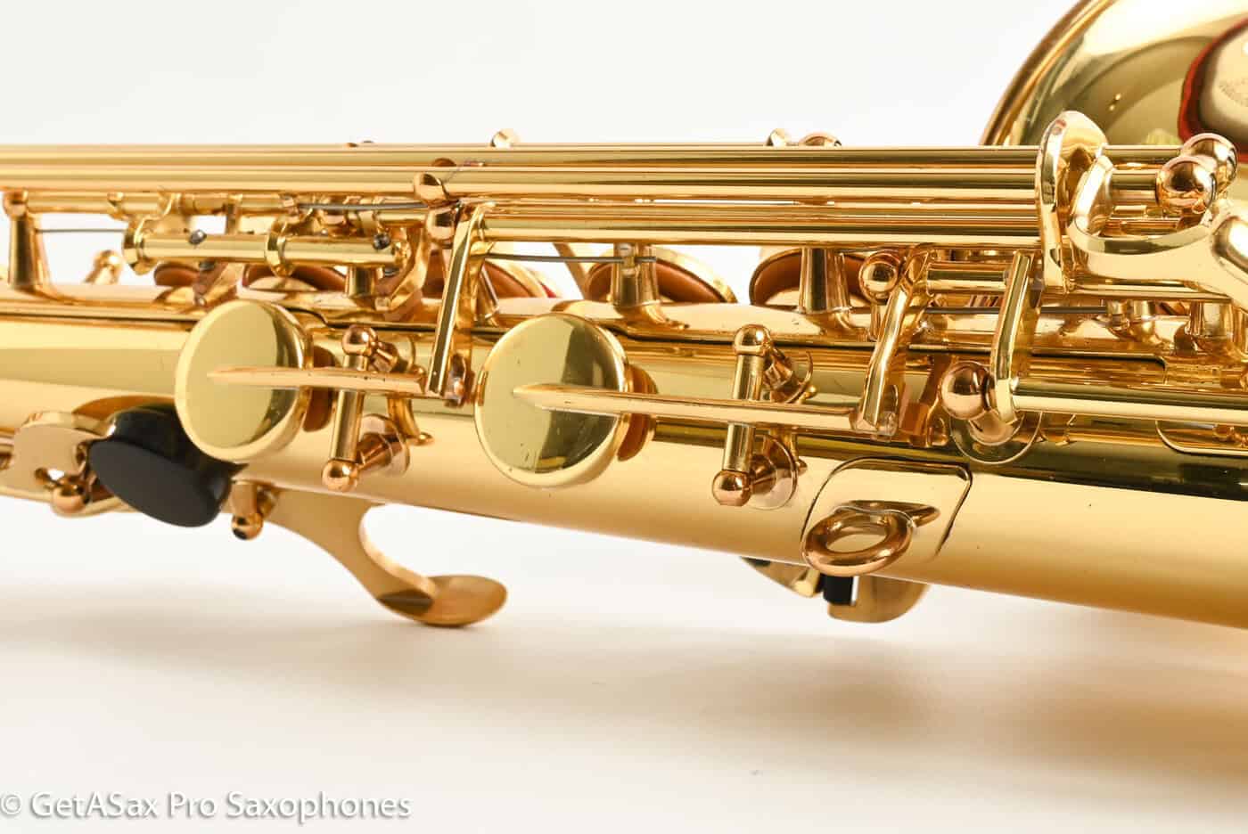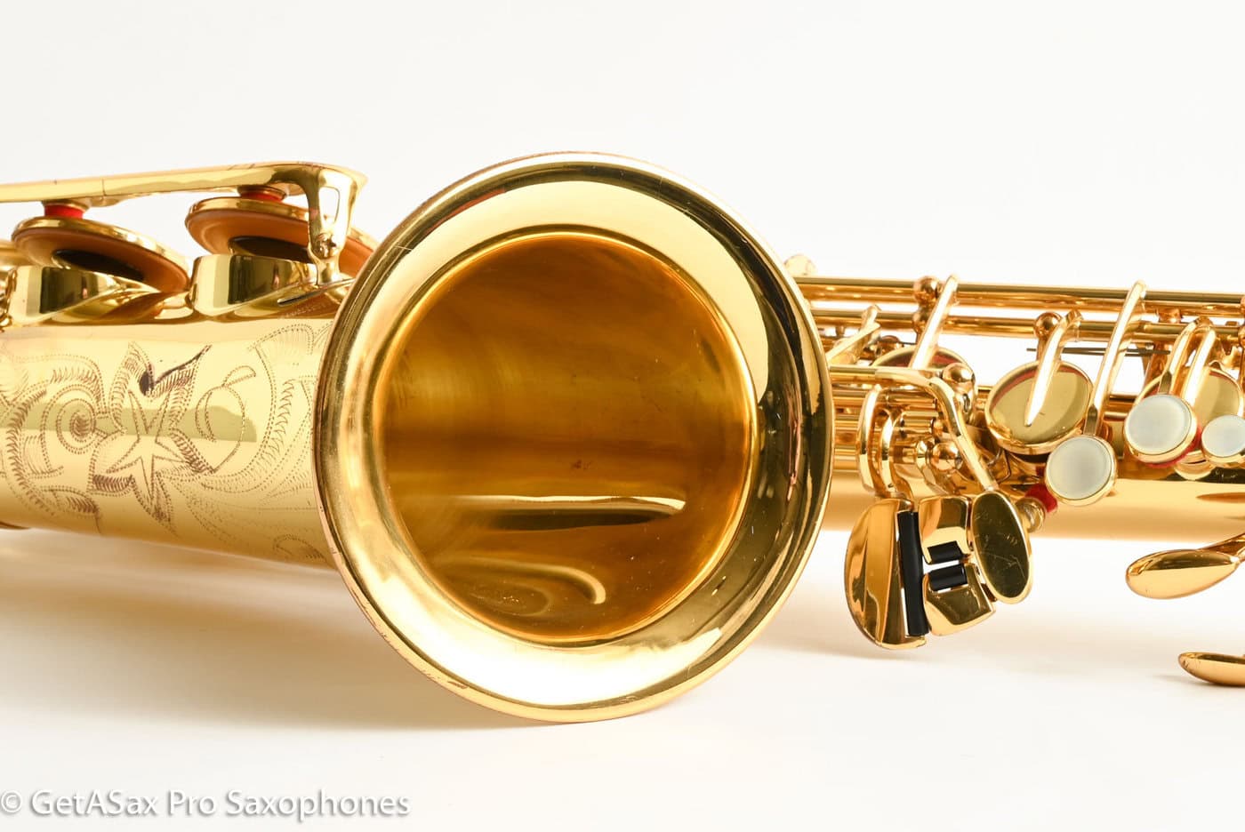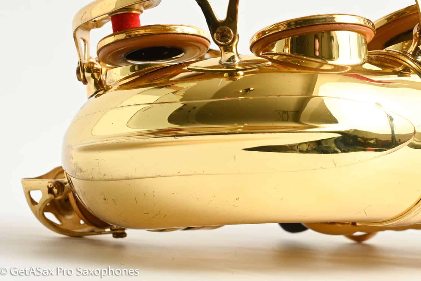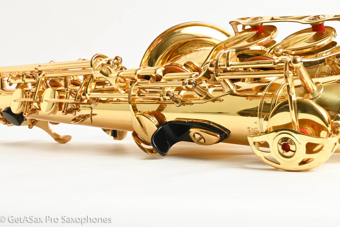 The Yamaha YAS-62 Purple Logo is the first version of the Yamaha 62 that was made, and it is still my favorite. I think Yamaha was interested in getting a Selmer Mark VI style tone out of the purple logo, while improving the intonation and ergonomics of the VI just a bit. So that means it’s an excellent value in a professional alto sax. It really does everything pretty well. The tone is warm, somewhat complex, and more pleasant than the later 62’s to my year. The intonation is good, and the keywork is comfortable. It’s the Toyota Camry of alto saxophones. It just works; it’s reliable; and it’s even fun to drive. This particular example just had a full overhaul completed on it. The only past dent work is on the bell flare, where some wavy light reflections are all that remain of a dent in that spot. There’s no other dent work, and there are no other repairs, nor any dents or dings or outstanding repair issues. It’s a clean, nice, freshly overhauled saxophone that plays as well as it did when it was brand new, or better. The pads are my favorite, Italian leather Pisoni, and the keywork feels dry and snappy under the fingers. It has the correct slightly domed plastic resonators, and it plays beautifully on this setup. With a complete overhaul just done, you won’t have to spend any significant money maintaining this horn for a long time. Just the occasional checkup as you break in the pads is all that you should need to do. Low Bb pops out effortlessly and is ‘just another note’, as it should be on a freshly-overhauled saxophone. If you’re looking for something reliable, pleasant-sounding, and easy to play and own, this purple logo 62 will not disappoint. It comes in the original case in good shape. Only one available!