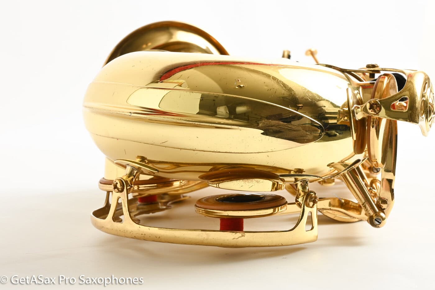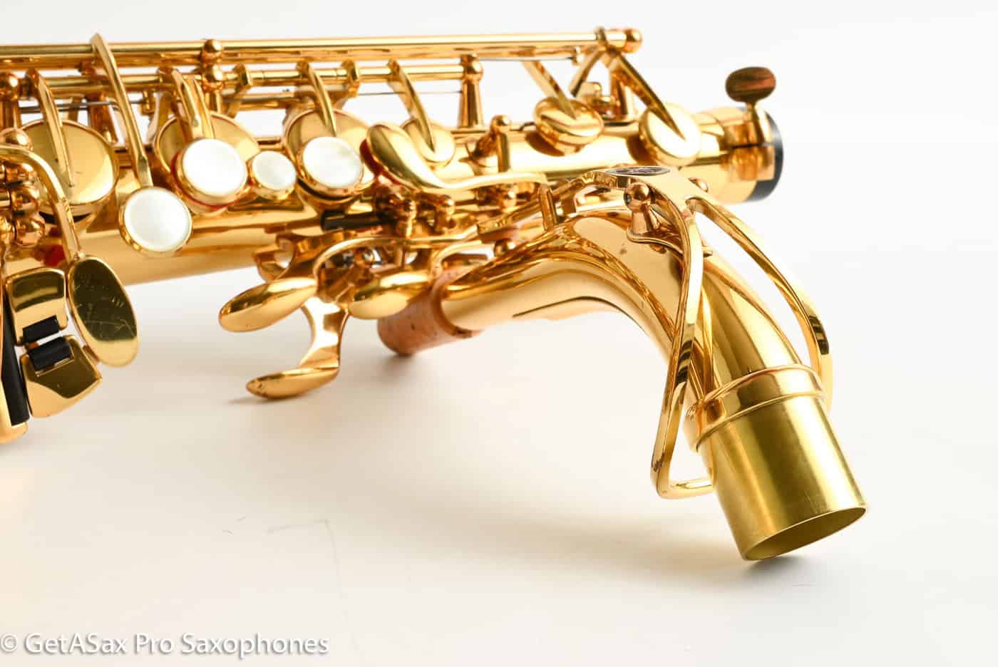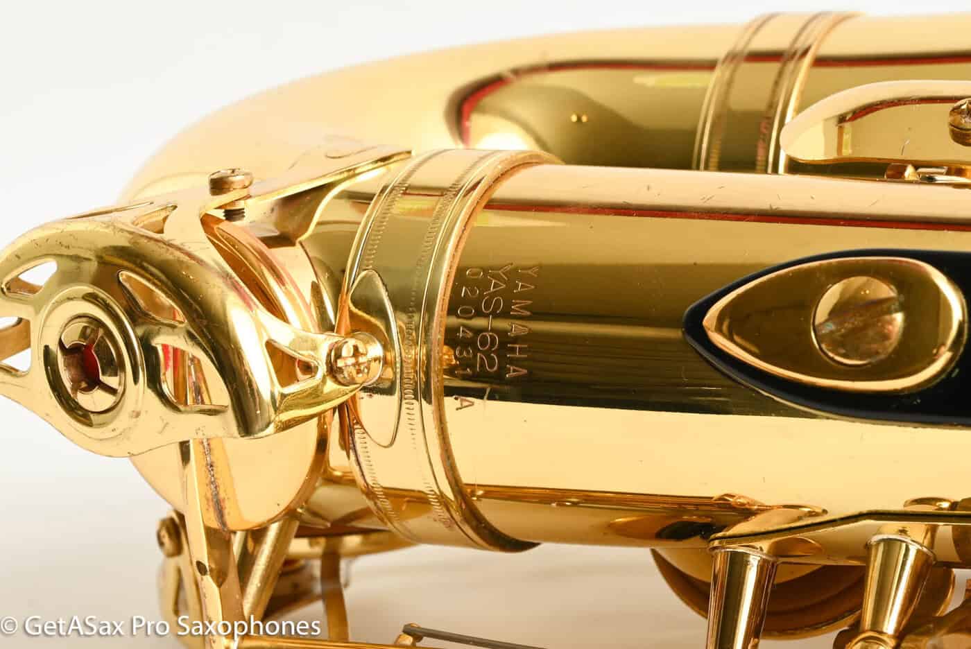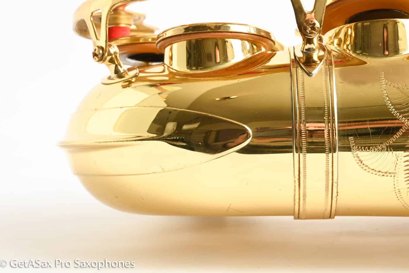 The Yamaha YAS-62 Purple Logo is the first version of the Yamaha 62 that was made, and it is still my favorite. I think Yamaha was interested in getting a Selmer Mark VI style tone out of the purple logo, while improving the intonation and ergonomics of the VI just a bit. So that means it’s an excellent value in a professional alto sax. It really does everything pretty well. The tone is warm, somewhat complex, and more pleasant than the later 62’s to my year. The intonation is good, and the keywork is comfortable. It’s the Toyota Camry of alto saxophones. It just works; it’s reliable; and it’s even fun to drive. This particular example just had a full overhaul completed on it. The only past dent work is on the bell flare, where some wavy light reflections are all that remain of a dent in that spot. There’s no other dent work, and there are no other repairs, nor any dents or dings or outstanding repair issues. It’s a clean, nice, freshly overhauled saxophone that plays as well as it did when it was brand new, or better. The pads are my favorite, Italian leather Pisoni, and the keywork feels dry and snappy under the fingers. It has the correct slightly domed plastic resonators, and it plays beautifully on this setup. With a complete overhaul just done, you won’t have to spend any significant money maintaining this horn for a long time. Just the occasional checkup as you break in the pads is all that you should need to do. Low Bb pops out effortlessly and is ‘just another note’, as it should be on a freshly-overhauled saxophone. If you’re looking for something reliable, pleasant-sounding, and easy to play and own, this purple logo 62 will not disappoint. It comes in the original case in good shape. Only one available!