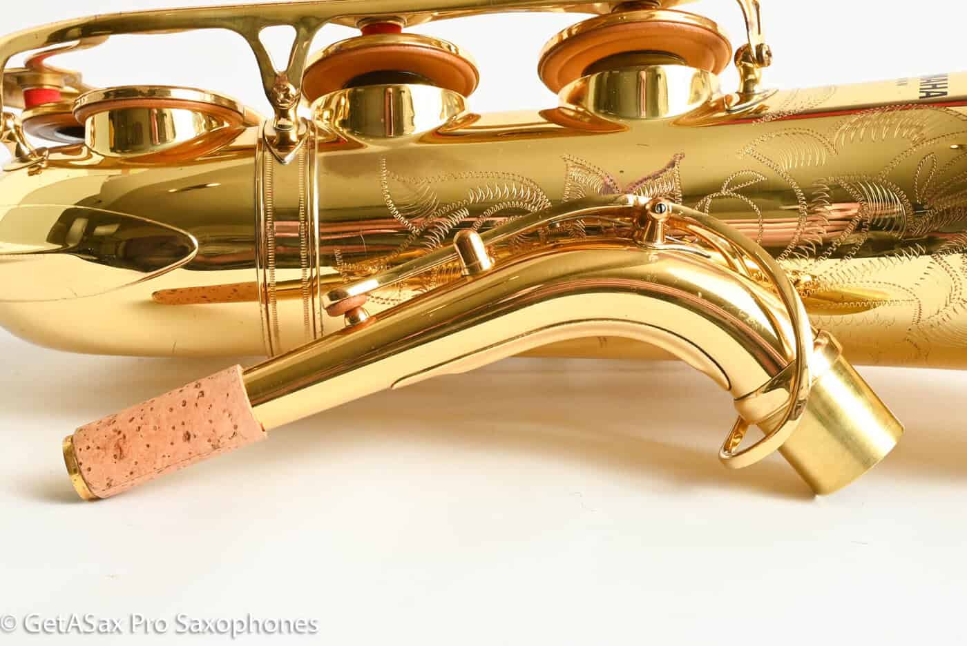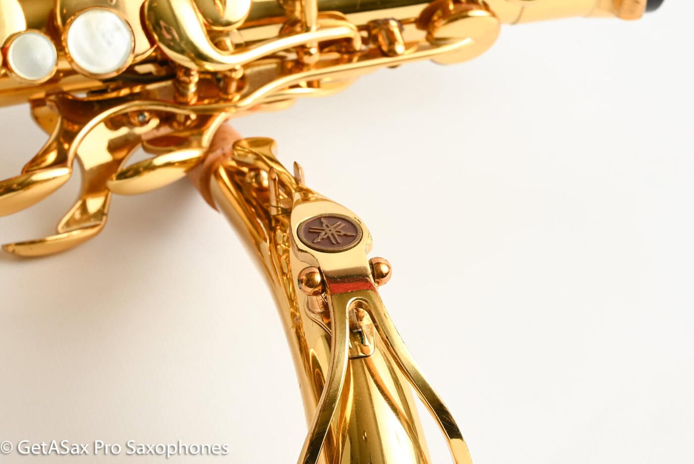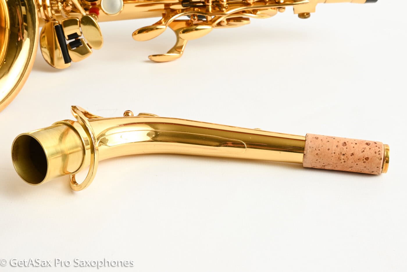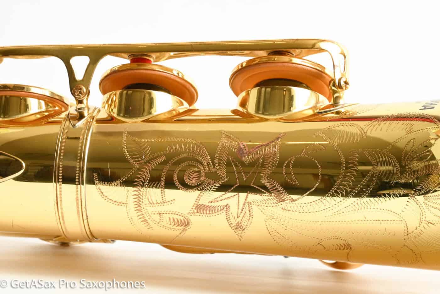 The Yamaha YAS-62 Purple Logo is the first version of the Yamaha 62 that was made, and it is still my favorite. I think Yamaha was interested in getting a Selmer Mark VI style tone out of the purple logo, while improving the intonation and ergonomics of the VI just a bit. So that means it’s an excellent value in a professional alto sax. It really does everything pretty well. The tone is warm, somewhat complex, and more pleasant than the later 62’s to my year. The intonation is good, and the keywork is comfortable. It’s the Toyota Camry of alto saxophones. It just works; it’s reliable; and it’s even fun to drive. This particular example just had a full overhaul completed on it. The only past dent work is on the bell flare, where some wavy light reflections are all that remain of a dent in that spot. There’s no other dent work, and there are no other repairs, nor any dents or dings or outstanding repair issues. It’s a clean, nice, freshly overhauled saxophone that plays as well as it did when it was brand new, or better. The pads are my favorite, Italian leather Pisoni, and the keywork feels dry and snappy under the fingers. It has the correct slightly domed plastic resonators, and it plays beautifully on this setup. With a complete overhaul just done, you won’t have to spend any significant money maintaining this horn for a long time. Just the occasional checkup as you break in the pads is all that you should need to do. Low Bb pops out effortlessly and is ‘just another note’, as it should be on a freshly-overhauled saxophone. If you’re looking for something reliable, pleasant-sounding, and easy to play and own, this purple logo 62 will not disappoint. It comes in the original case in good shape. Only one available!