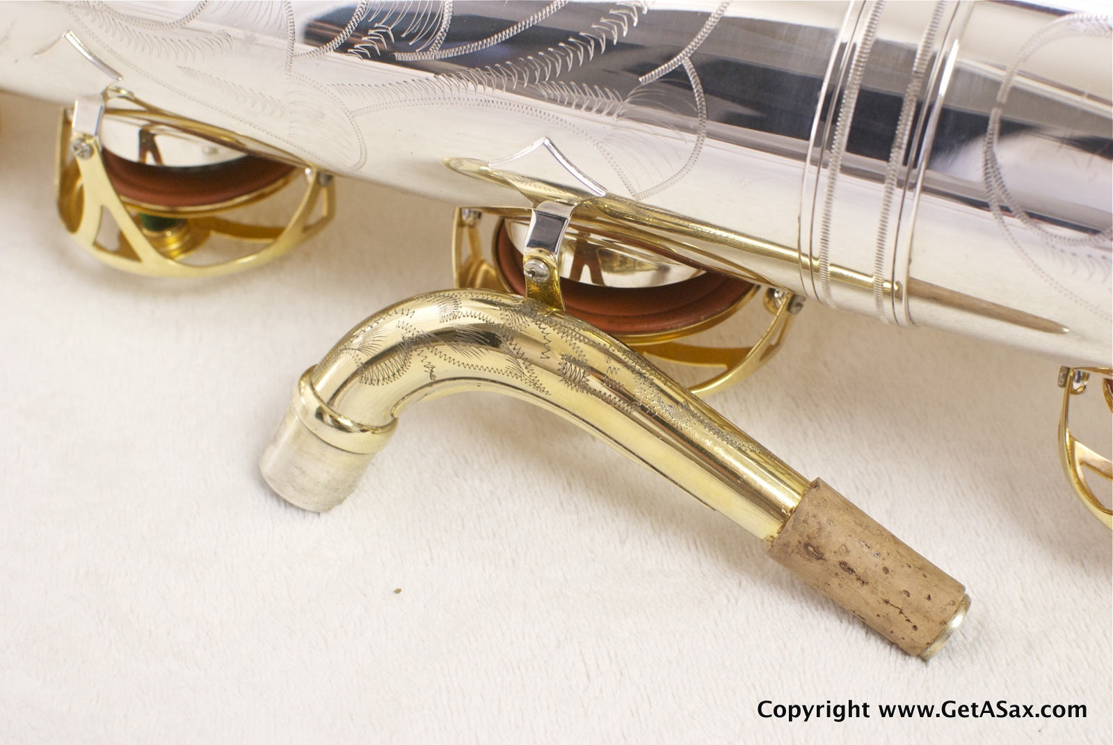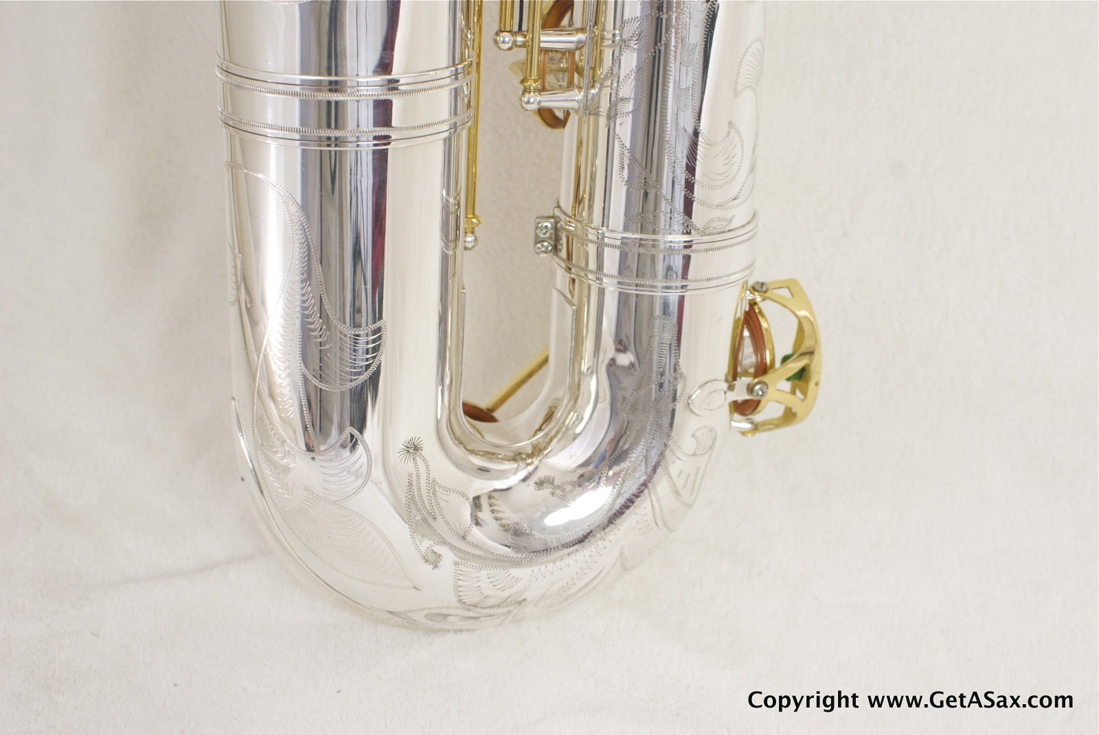 The Yamaha 62 is arguably the best model of baritone saxophone ever made.This is a rare silver model with aftermarket gold plated keys and neck, and full engraving which was added in the same style as the bell engraving. This horn is ready to go as is and has no past damage or current dents or dings.