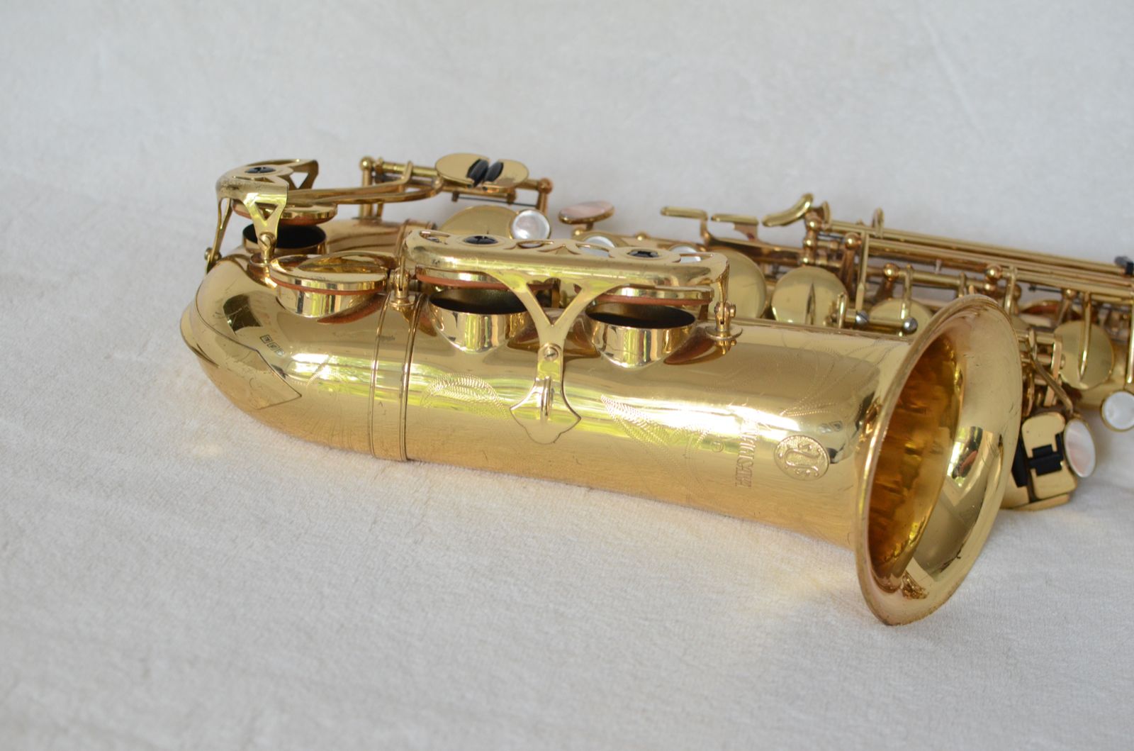 This is a freshly-overhauled 880 alto with a little bit of lacquer wear. If you read around on here, you'll know that I think that the 880 is one of the best alto saxophones that you can buy for a number of reasons (great tone, great ergonomics, great build quality, great intonation). This horn sings with a medum bright tone with a nice substantial core to it. It has a beefy kind of core to it, and it sounds great for a wide range of styles of music, a lot like a Mark VI. The intonation is excellent, as is the build quality generally. It has a high F#. The ergonomics are modern and very comfortable. This horn will do it all, and it's quite a bit cheaper than most other altos of this calibre.