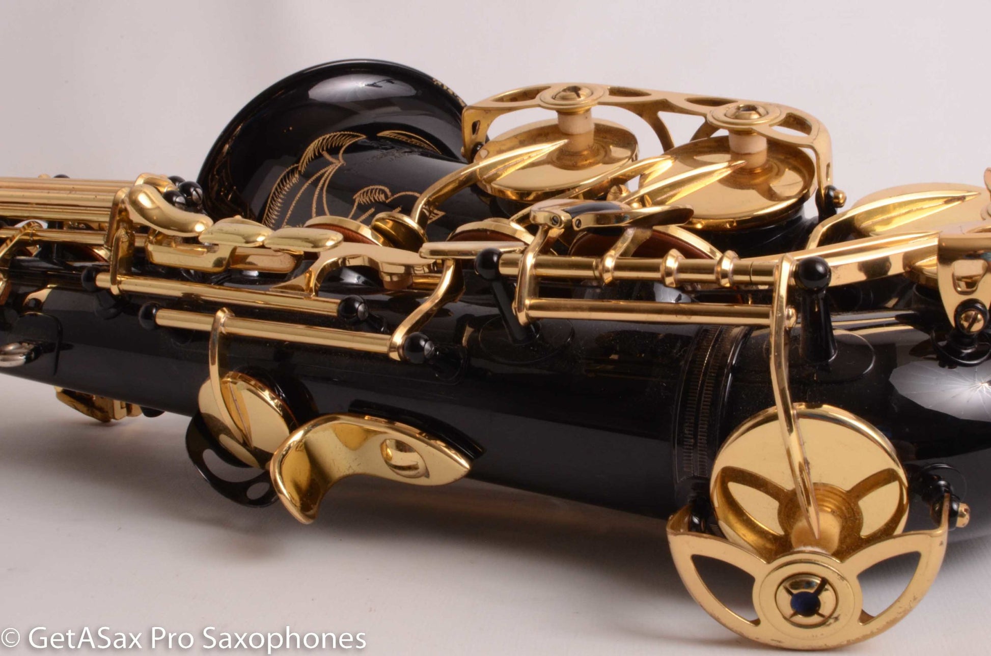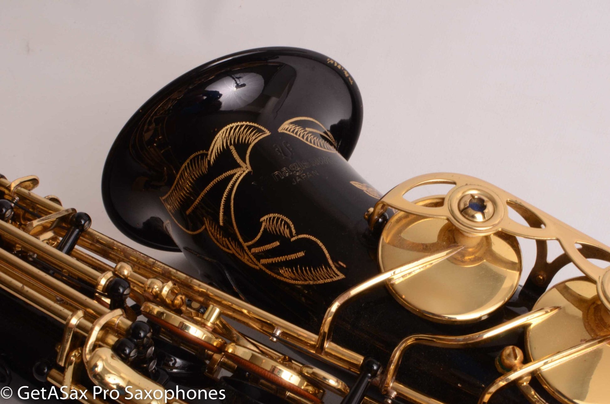 Beautiful example of an original black-lacquered Yanagisawa ‘Elite’ Professional A991B Alto Saxophone. This premium alto plays great, and is ready to go, with good pads, and no damage or problems. I love how the black lacquer looks with the engraving cut through it into the brass. You might upgrade to a fully engraved, gold plated neck, if you want even more eye-turning bling on this horn. I have one of those available by special request.