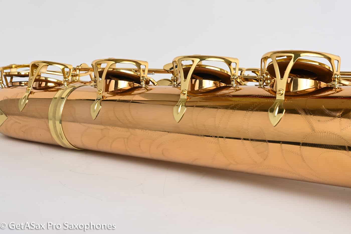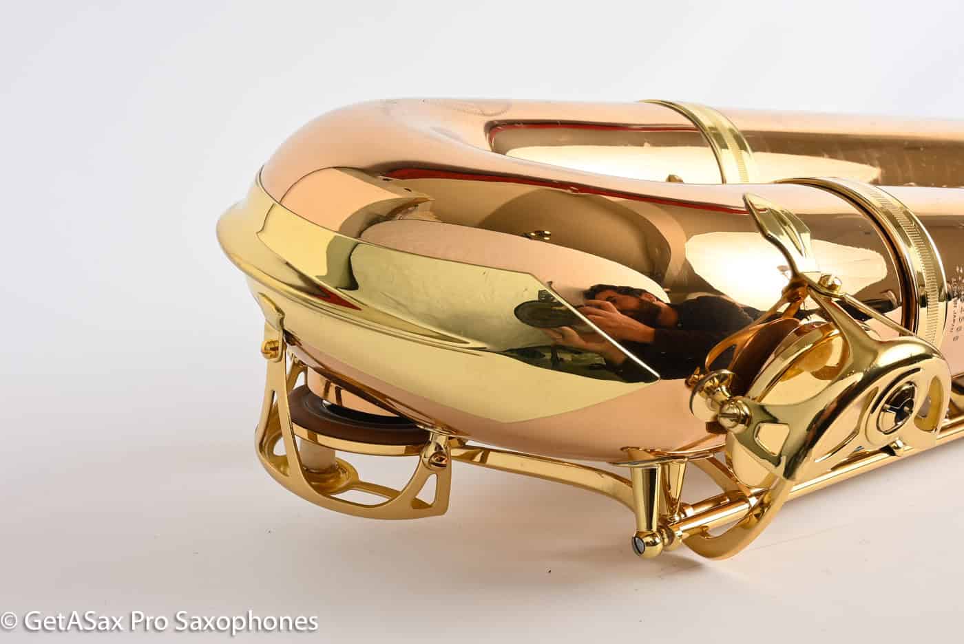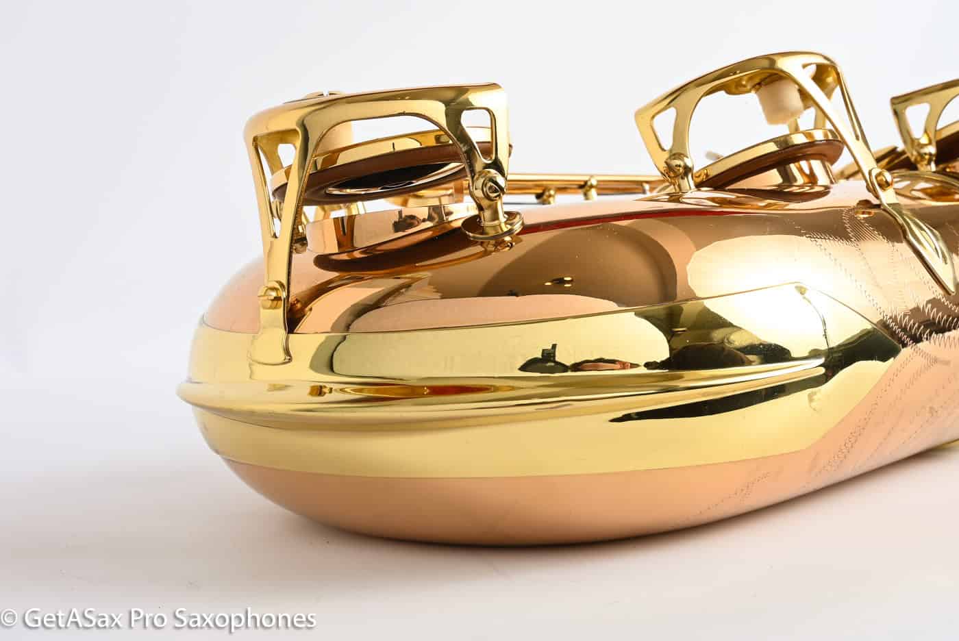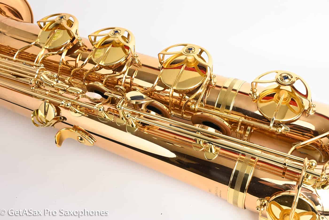 Here’s a chance to get the equivalent of a new BWO20 for an absurd $6000 off the new price. The B-992 is Yanagisawa’s top of the line, solid bronze baritone saxophone, and this particular one is in nearly mint condition. I sold it originally, and my customer recently traded it back to switch his horn collection around. He took amazing care of it and it has a professional new horn setup done, and very low playing hours since it was new. It’s about as close to a new B992 as you are likely to find, and it has excellent original lacquer that is nice and durable, not scratched or worn at all. You would be hard pressed to find a better baritone saxophone of any kind for this price. Some lucky player is going to grab a great horn here for a great price. Low A is effortless on it, intonation is great. There are no past repairs, and no current repair issues. The original pads are in excellent condition as well, and the horn needs no work at all.