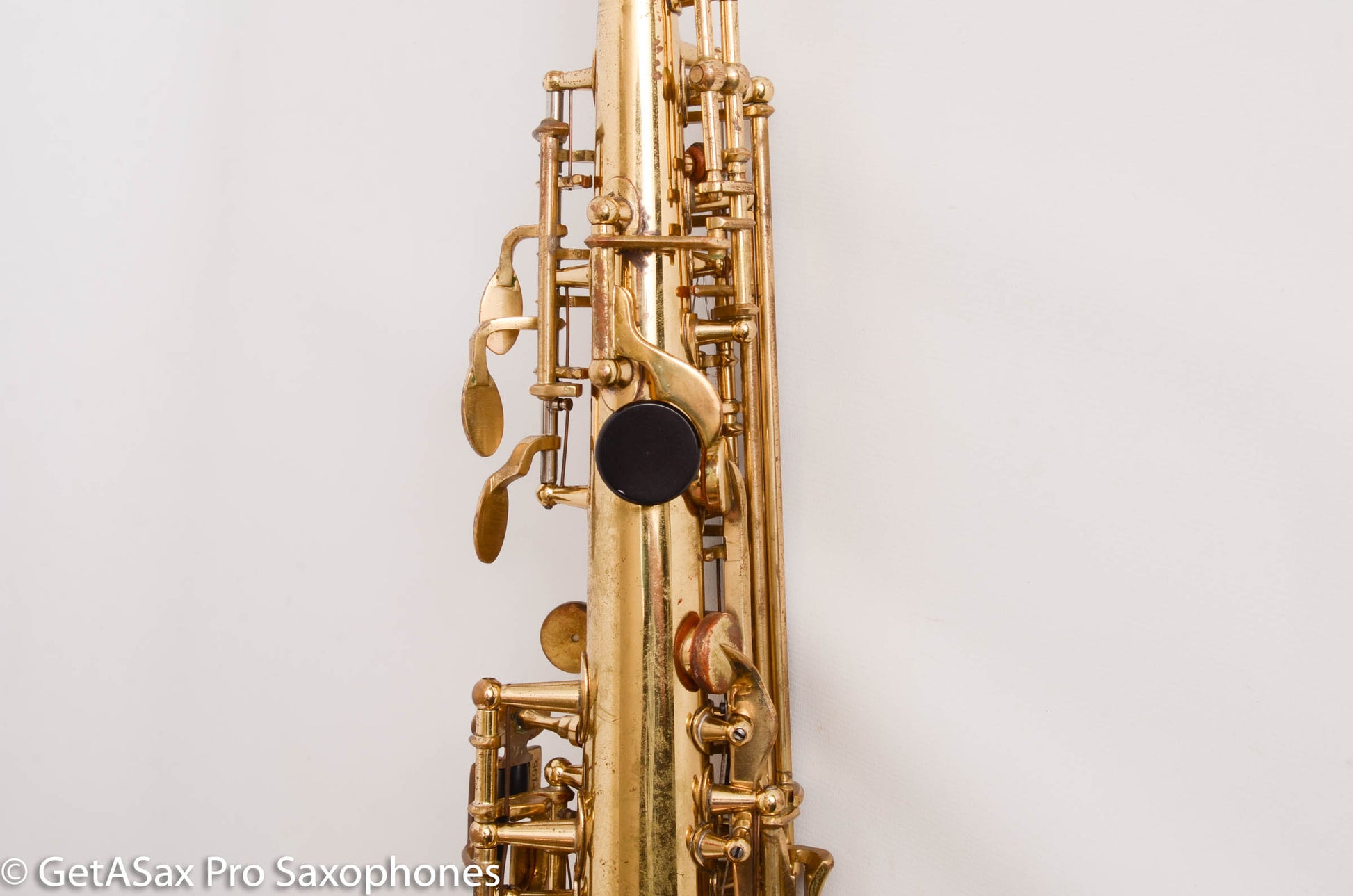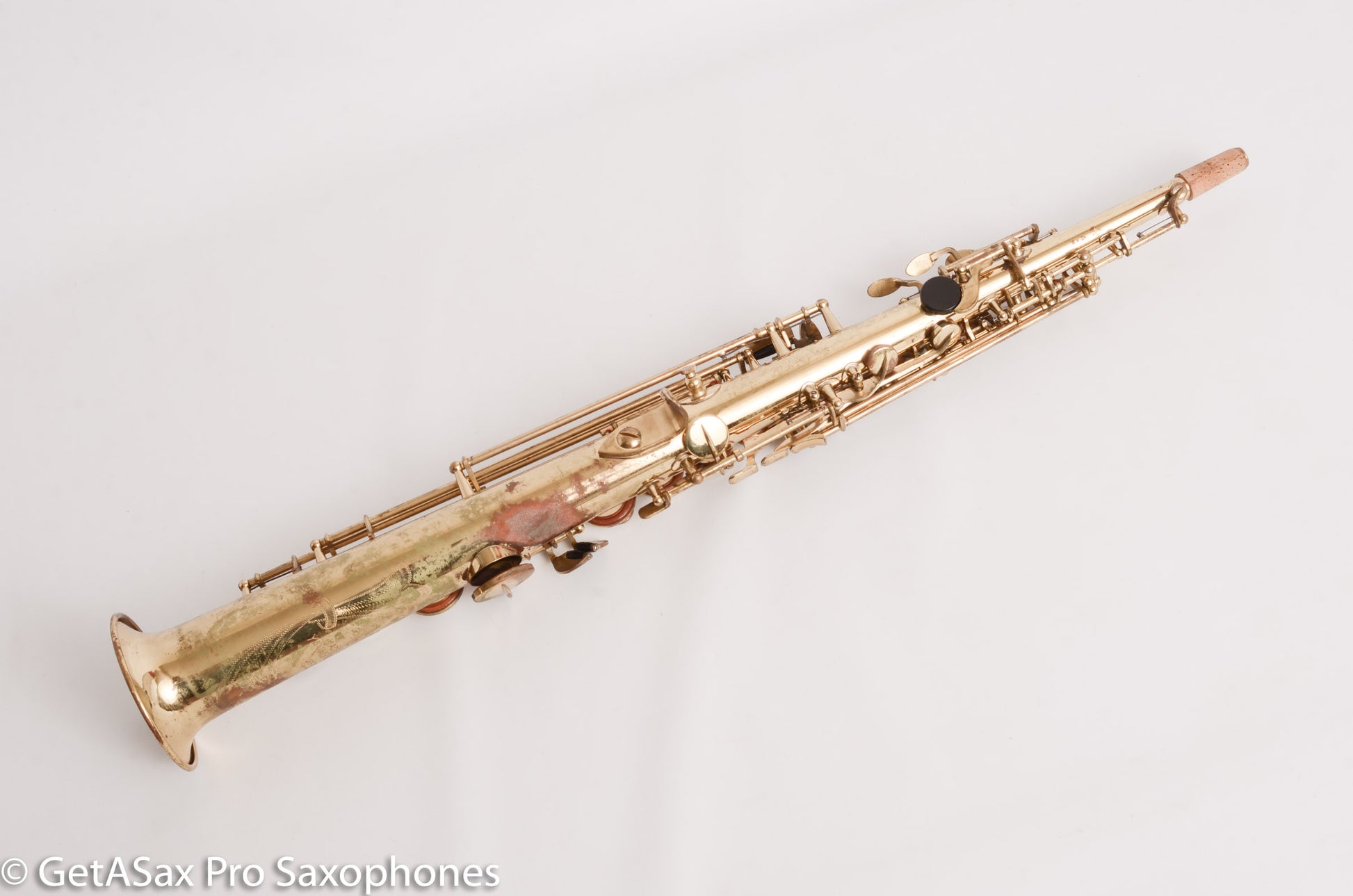 Yanagisawa S-6 soprano in good condition. The lacquer is fairly worn and the pads are older, but it’s a great price! These are copies of a Mark VI soprano, and they actually play better than the original in many cases! The intonation is better, and the keywork is built just as well. If you want that brassy, projecting soprano tone like Kenny G gets, or the thin, oboe-like tone that John Coltrane gets, those are both the direction these horns lean. (You’d need the right mouthpiece and a lot of practice to actually sound like those players stylistically, but the tone goes in that direction naturally.)