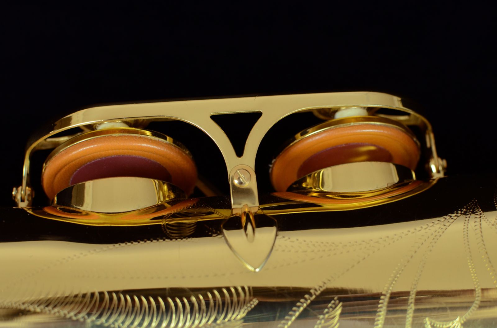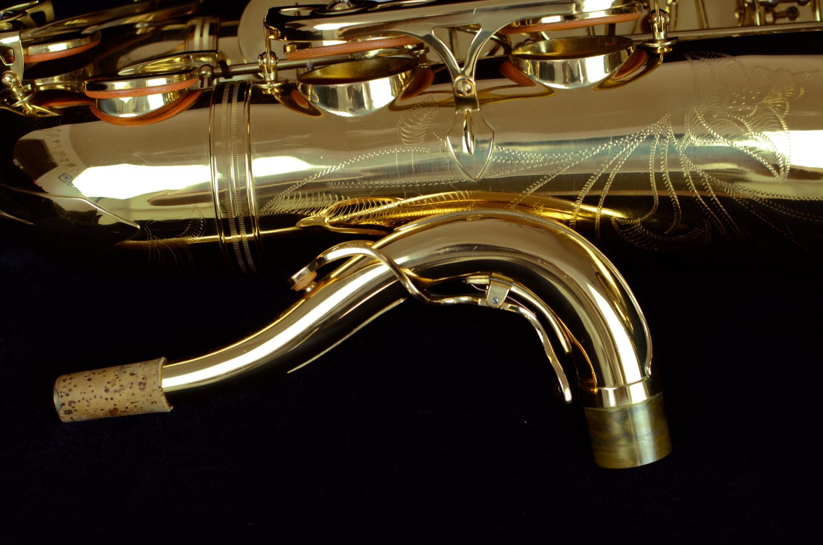 This is an excellent example of a Yanagisawa T-990 tenor saxophone. The 990 is nearly identical to the current production 991 tenor that is Yanagisawa's top-of-the-line design. In case you haven't heard of the company at all before, Yanagisawa is known to serious sax players as (arguably) the finest maker of saxophones in the world today. All Yanagisawa saxophones are made by hand in their small factory in Japan, and their build quality is the best all-around that you can get. This horn is cosmetically excellent or near mint. It has some light scratches on the back of the body tube. The original neck has been pulled down slightly (the angle was too low) and then fixed (re-angled) and a small dent removed.