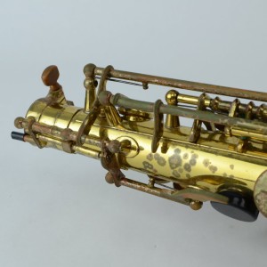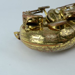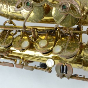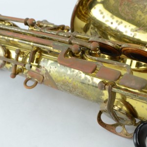 Here is a chance to get an original lacquer Selmer Mark VI alto for the price of a Yamaha! The only thing wrong with this horn is that it has lacquer wear and looks kind of worn, especially on the bell. This wear is purely superficial, though. The horn is actually in very clean mechanical condition: there are no dents, no dings, no past repairs, the neck is perfect, bell, body and bow all look great. The keywork is tight, and I think it still has the original pads intact (so it needs new pads). So if you don’t care that the lacquer is worn, you’ll be getting a very good VI alto to get repadded.