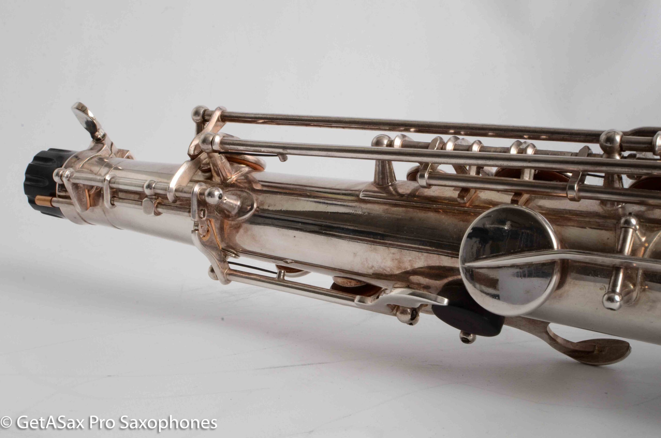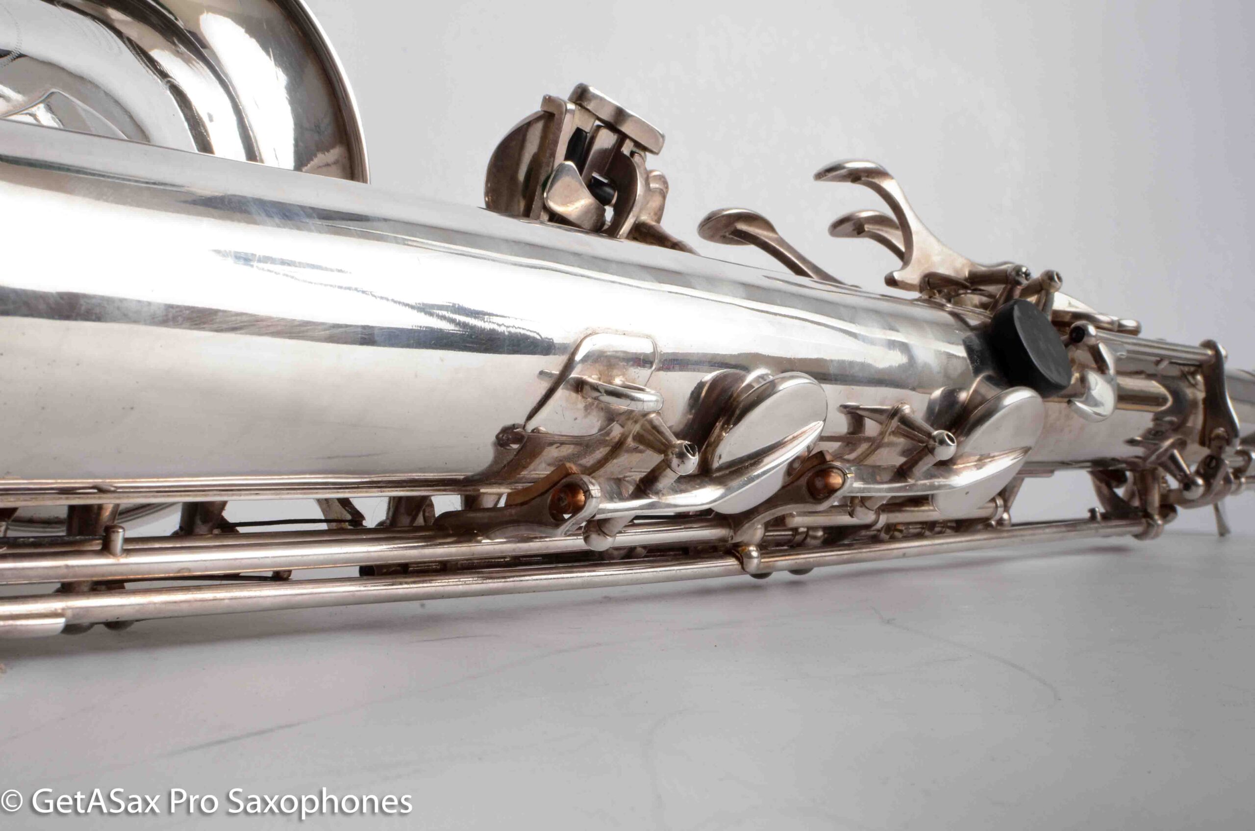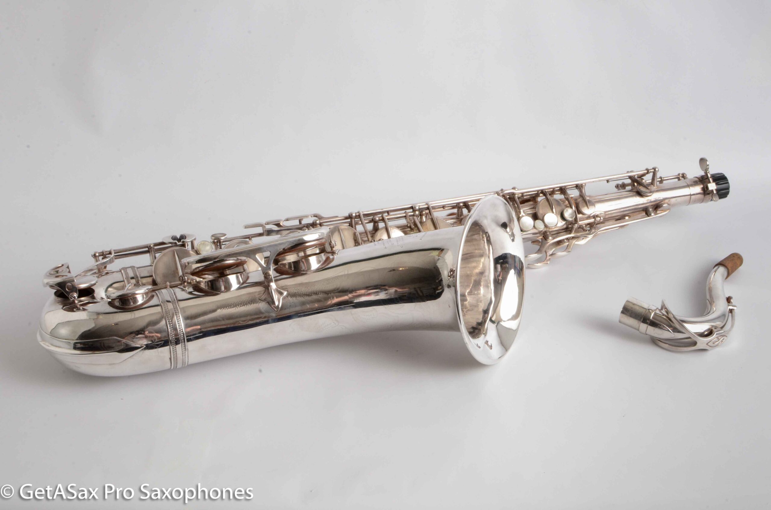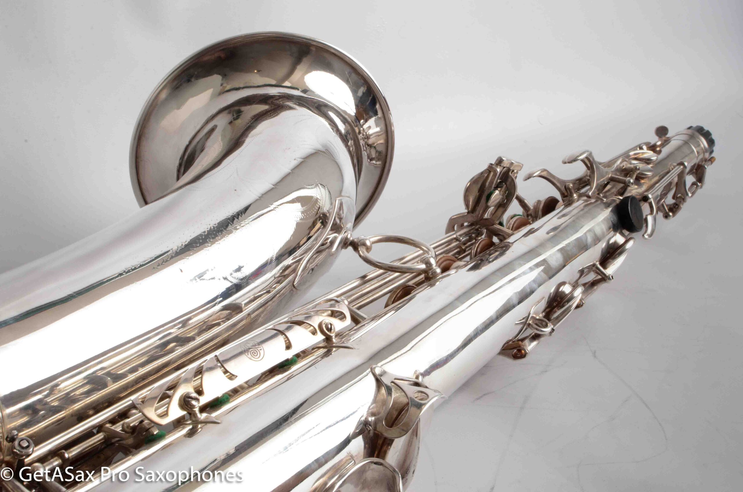 The 57k serial Selmer Mark VI tenors from 1955 are among the best playing Mark VI’s ever made. I’ve heard over the years from several Selmer aficionados and other dealers that the 57k necks have something special about them that makes them have a ton of power combined with a dark, focused core and great intonation. Basically, it’s horns like this that created the mystique around the Selmer Mark VI in the first place. This is a beautiful example that is carefully replated silver plate and is in excellent condition. This horn was babied by its previous owner, who flew here to hand it to me in person rather than shipping it. It has a good pad job that isn’t new, but that still seals great and plays very well right out of the case. I don’t think you’ll need to overhaul this one anytime soon. There’s no signficant damage at all – no dents or dings. And I feel like a replate is almost the opposite of a relacquer – you’re adding metal to the instrument rather than removing it. Plus this horn was so well cared-for that I don’t see any evidence of significant past repairs that could be masked by a refinish. You also get the cool vintage Selmer flight case, which is one of the best cases Selmer ever made for the Mark VI.