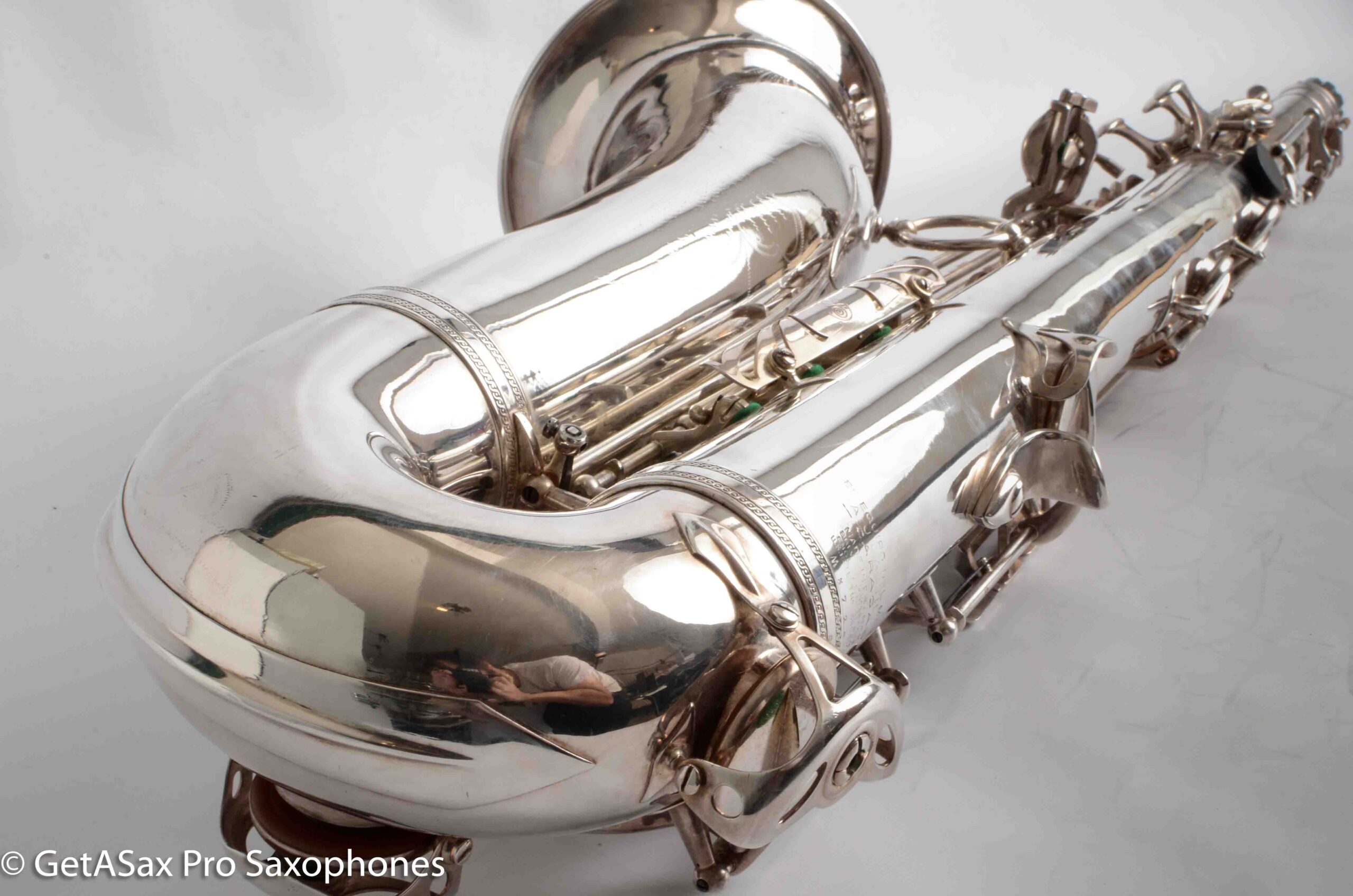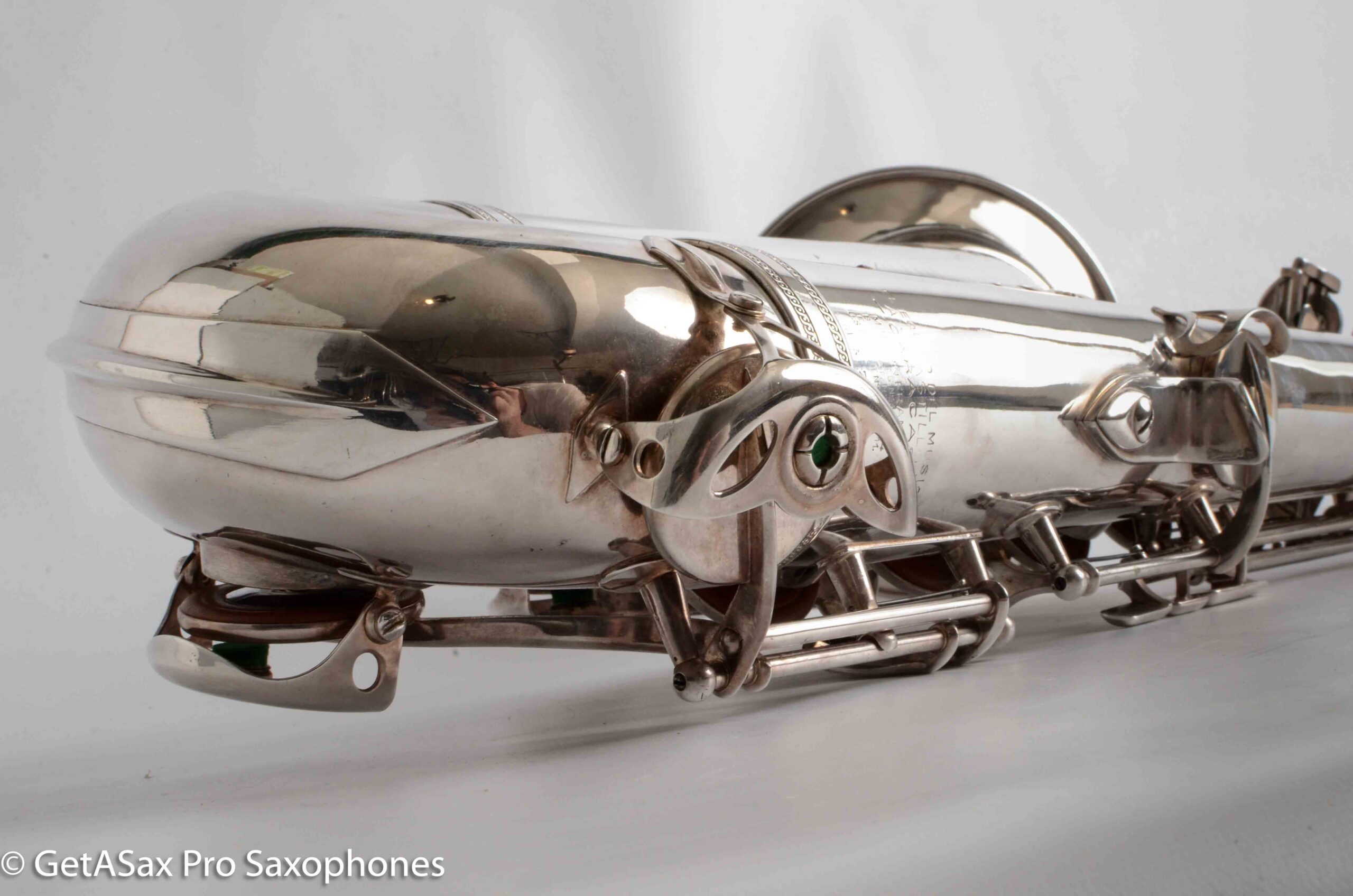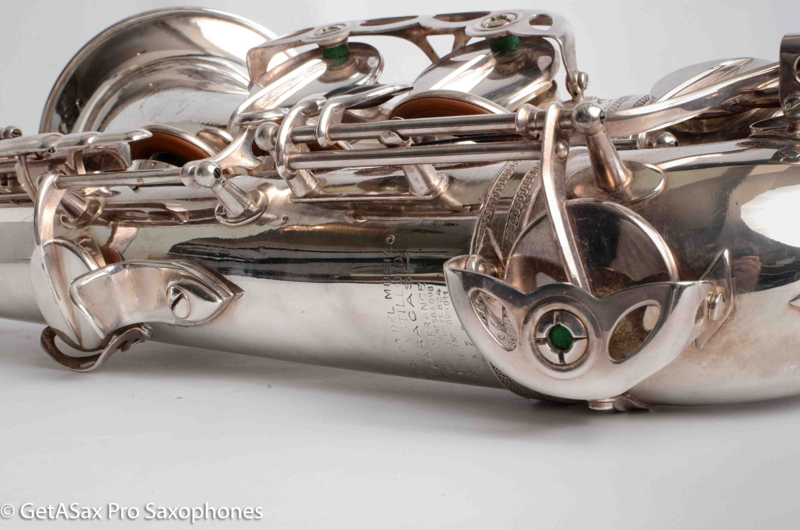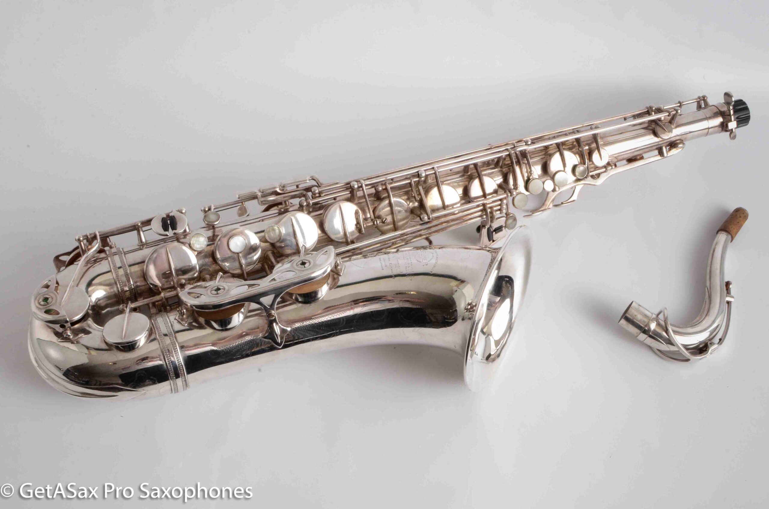 The 57k serial Selmer Mark VI tenors from 1955 are among the best playing Mark VI’s ever made. I’ve heard over the years from several Selmer aficionados and other dealers that the 57k necks have something special about them that makes them have a ton of power combined with a dark, focused core and great intonation. Basically, it’s horns like this that created the mystique around the Selmer Mark VI in the first place. This is a beautiful example that is carefully replated silver plate and is in excellent condition. This horn was babied by its previous owner, who flew here to hand it to me in person rather than shipping it. It has a good pad job that isn’t new, but that still seals great and plays very well right out of the case. I don’t think you’ll need to overhaul this one anytime soon. There’s no signficant damage at all – no dents or dings. And I feel like a replate is almost the opposite of a relacquer – you’re adding metal to the instrument rather than removing it. Plus this horn was so well cared-for that I don’t see any evidence of significant past repairs that could be masked by a refinish. You also get the cool vintage Selmer flight case, which is one of the best cases Selmer ever made for the Mark VI.