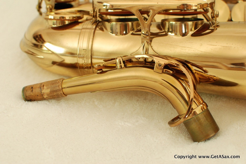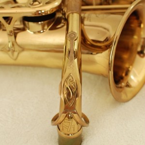 This is about as close to a new Mark VII alto as I have ever seen. It is currently in line to receive authentic Selmer American engraving from a former master Selmer engraver. It is currently unengraved and in all original condition with original pads as well. There is not a lot to say about this horn: no dents, no dings, no past repairs. There is an extra number engraved by the serial number, and there is a little spot of lacquer wear on the neck. Besides that, it is in practically perfect condition.